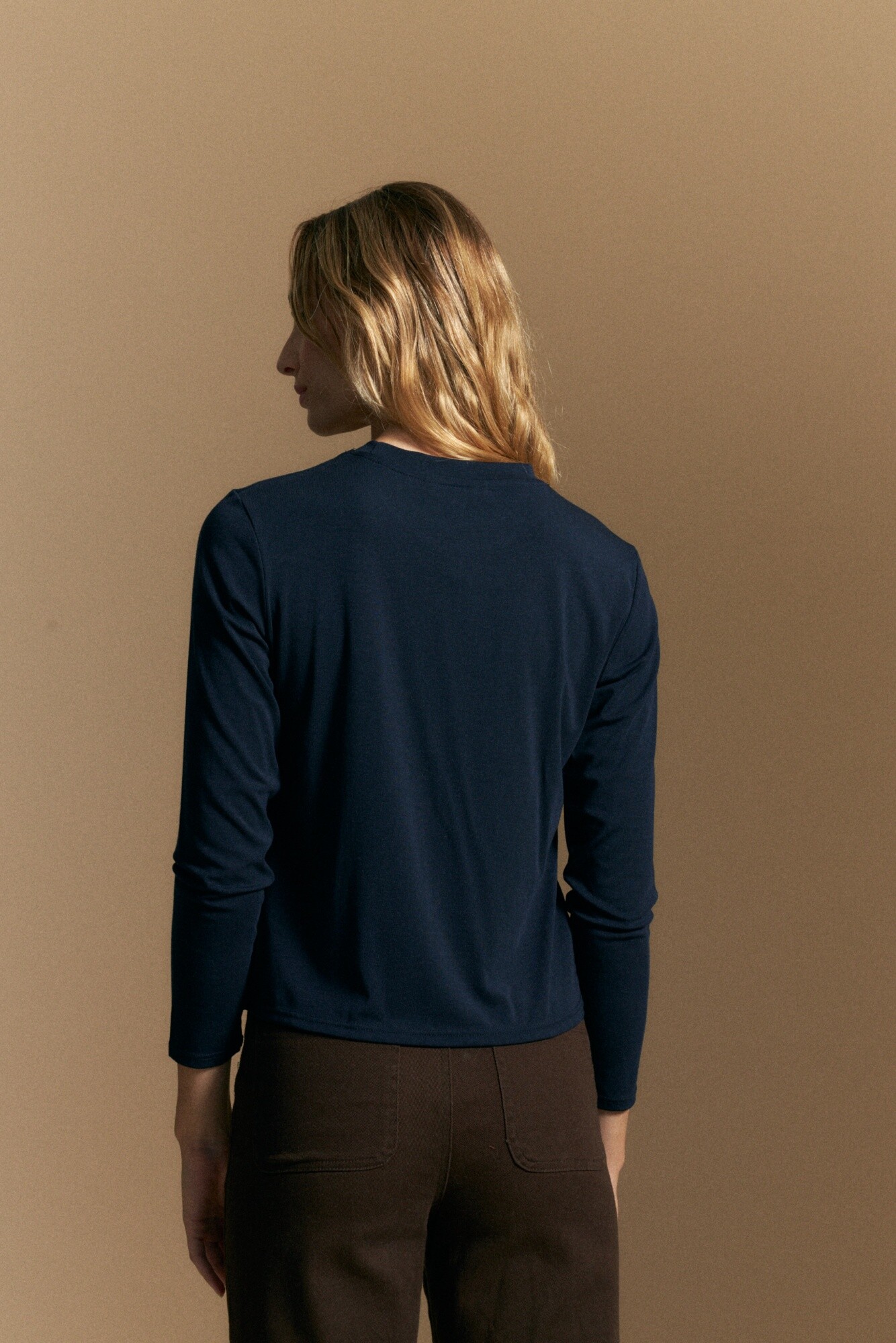 Remera de manga larga de silueta minimalista, pensada para convertirse en un básico infalible del guardarropa. Su diseño de cuello cerrado y líneas limpias estiliza la figura, logrando un efecto pulido y versátil.