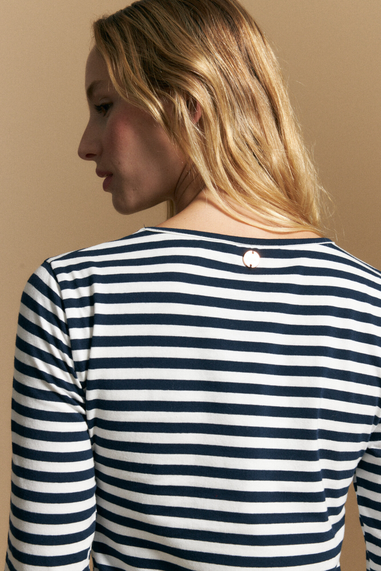 Remera a rayas de inspiración clásica que aporta un aire atemporal y siempre vigente. Su silueta entallada realza la figura, mientras que el tejido con algodón y elastano brinda suavidad, comodidad y un calce flexible. Una prenda versátil que funciona como base para múltiples looks, ideal para sumar estilo sin esfuerzo.