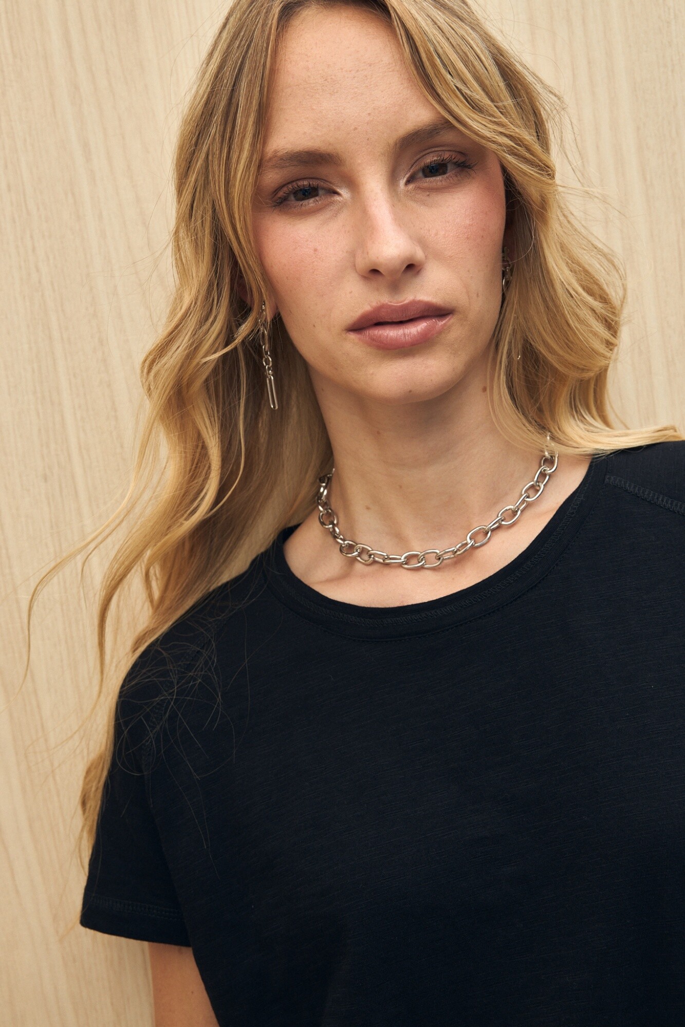 Remera de manga corta confeccionada en algodón con textura liviana y suave al tacto. Presenta costuras decorativas en los laterales y mangas con pequeño doblez que aportan un toque relajado. Un básico indispensable para looks cómodos y frescos de todos los días.
