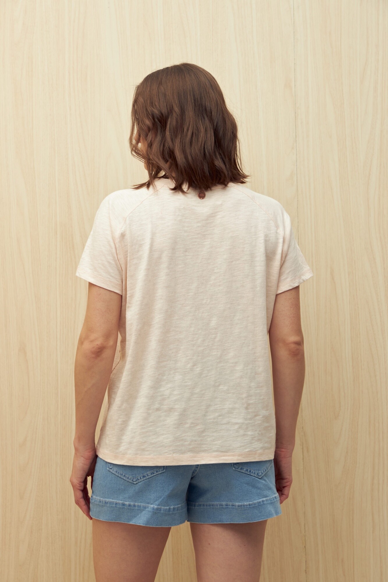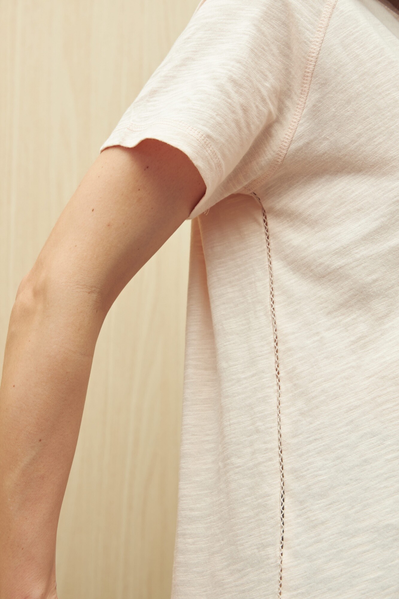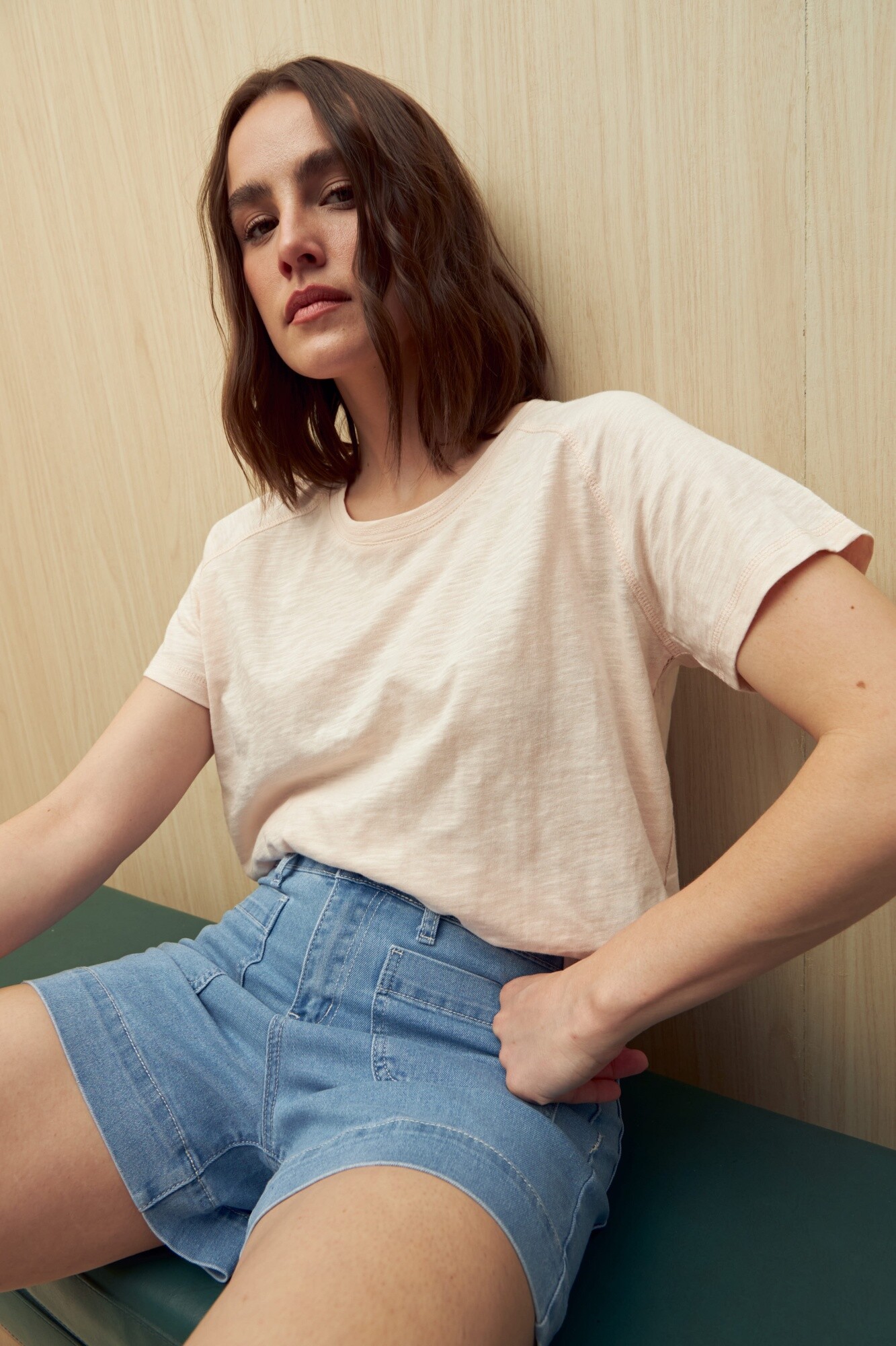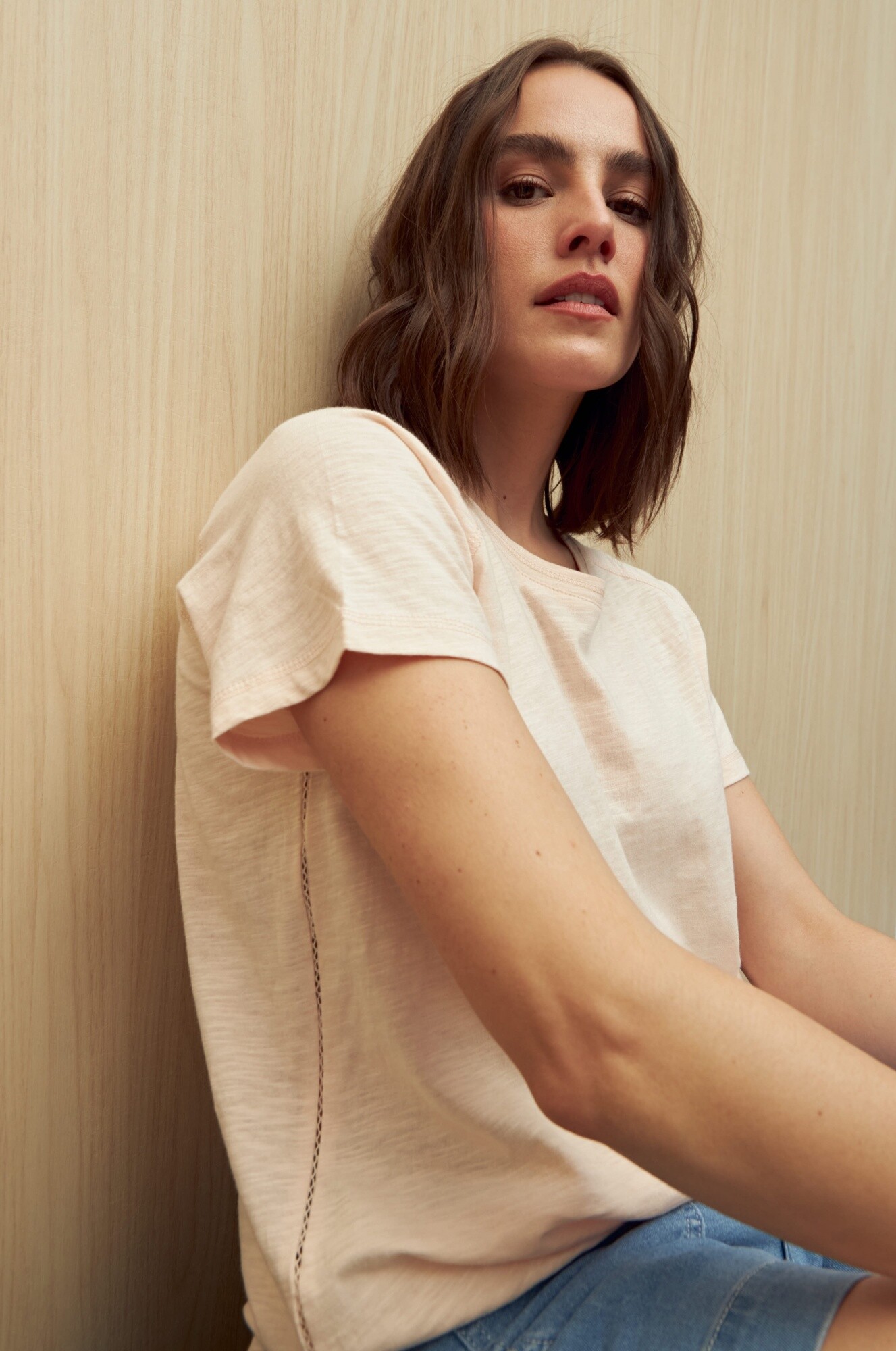 Remera de manga corta confeccionada en algodón con textura liviana y suave al tacto. Presenta costuras decorativas en los laterales y mangas con pequeño doblez que aportan un toque relajado. Un básico indispensable para looks cómodos y frescos de todos los días.