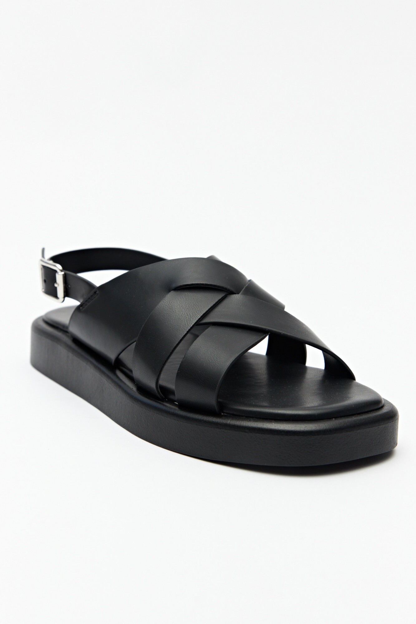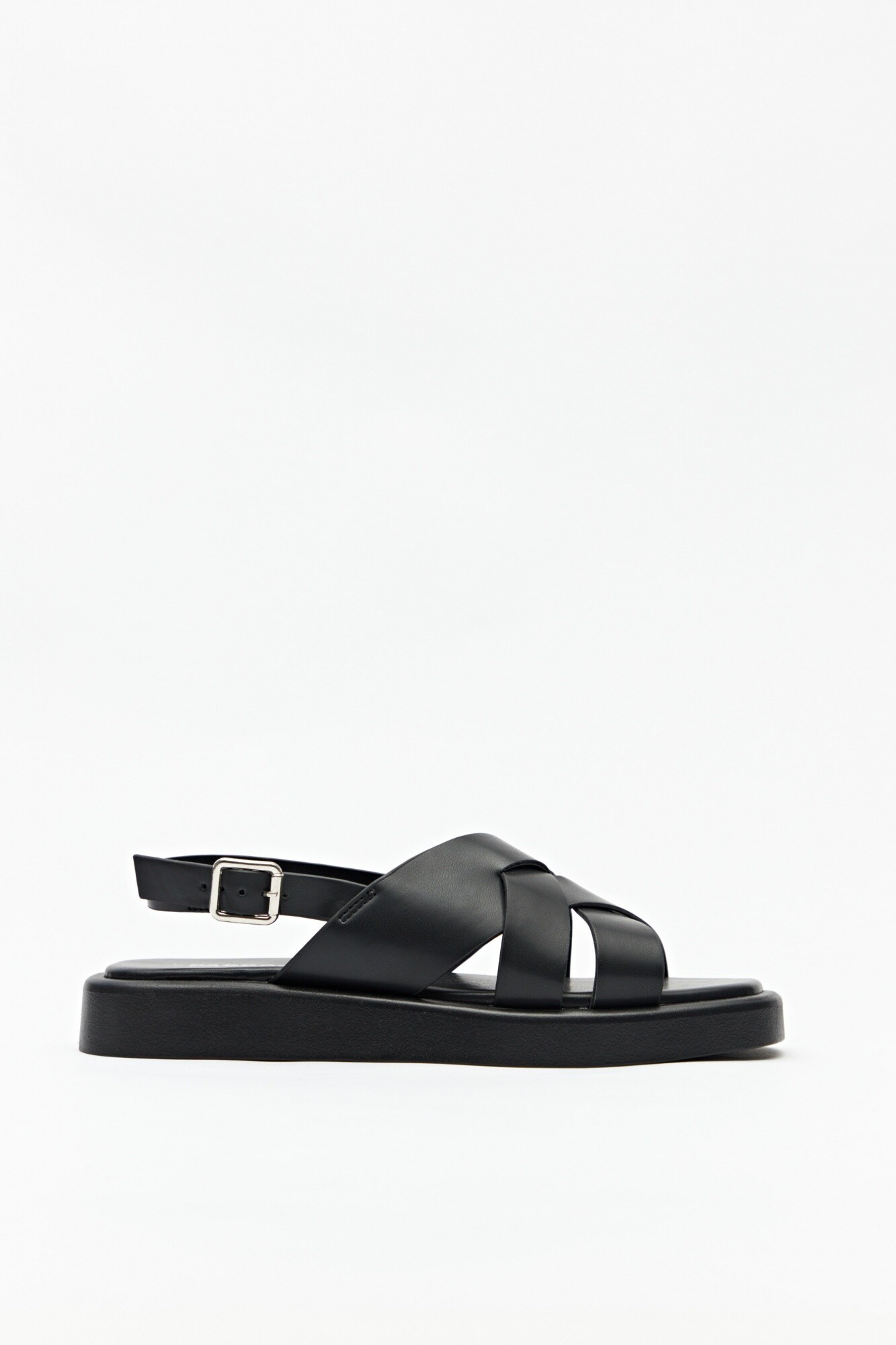 Sandalias en símil cuero con agarre ajustable en el talón y capellada entrelazada. Su plataforma es de 3cm de alto.