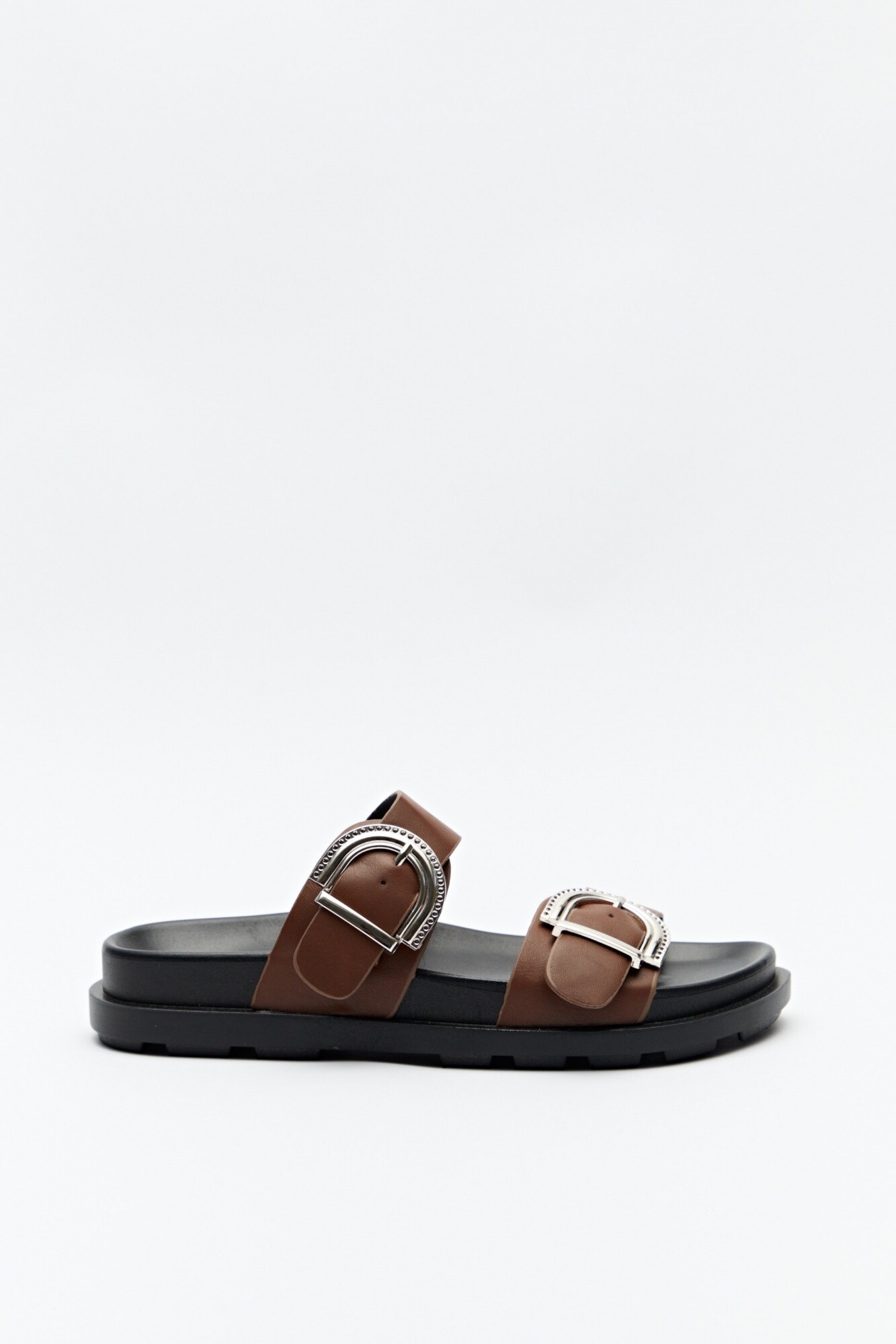 Sandalia tipo slide con doble tira ancha y hebillas metálicas XL con diseño texturado. Su base ergonómica y liviana garantiza comodidad, mientras que los herrajes aportan un toque moderno y distintivo. Ideal para looks casuales que buscan sumar estilo sin perder confort.