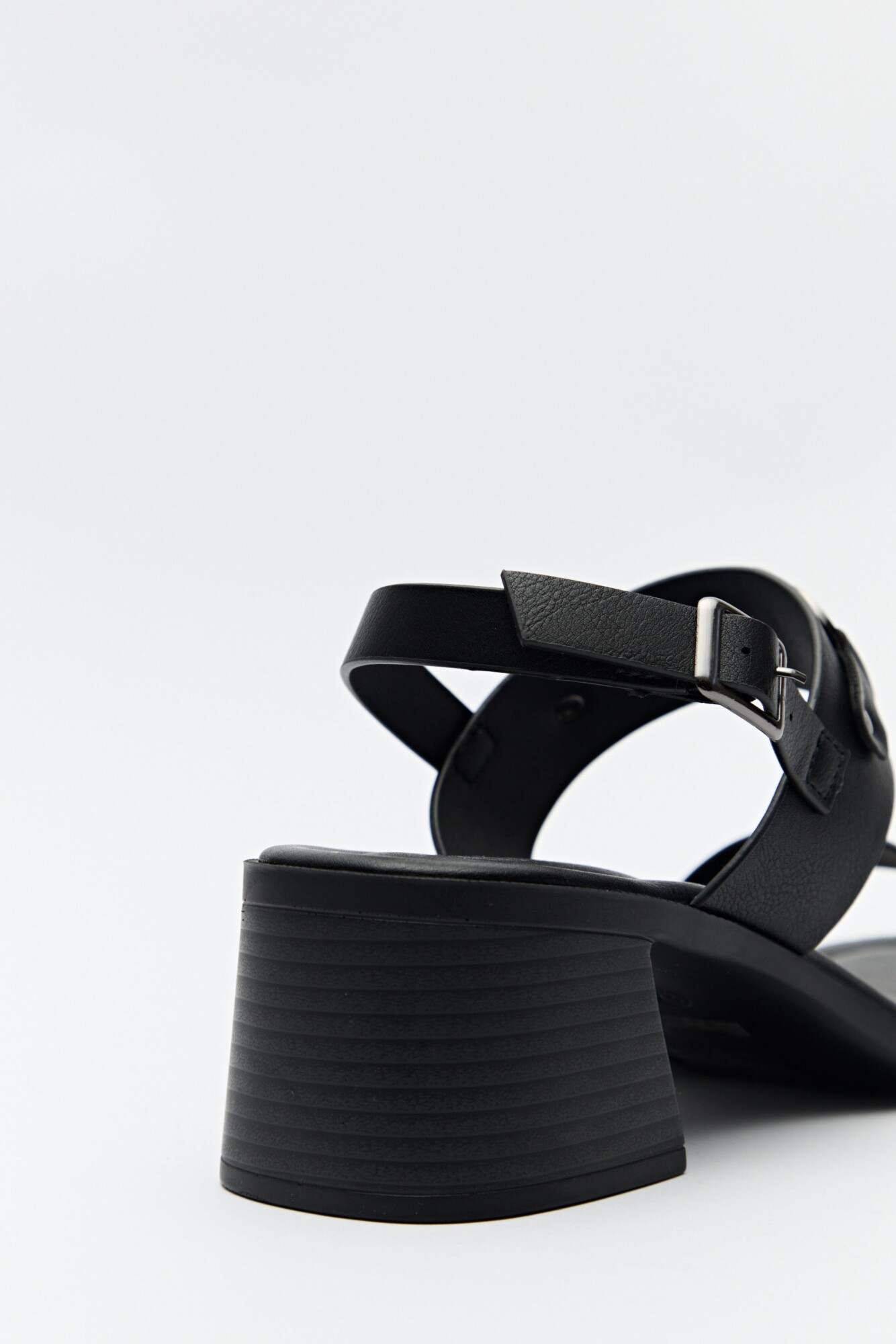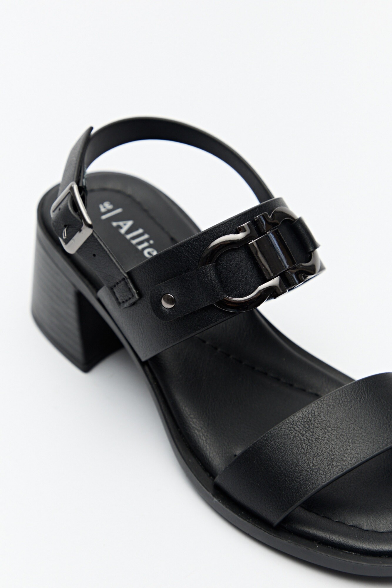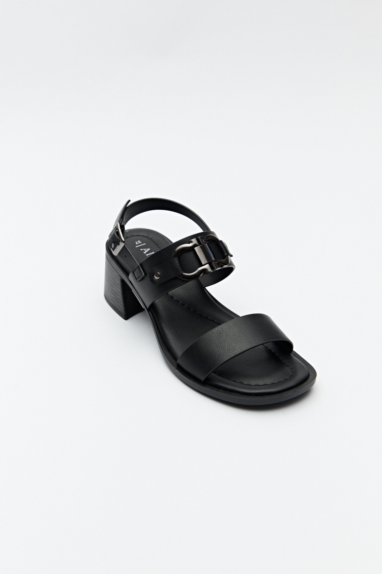 Sandalia con taco medio y diseño de tiras anchas cruzadas. Presenta hebilla lateral y herraje metálico en el empeine que aporta un toque actual y elegante. Su base cómoda y su silueta versátil la vuelven ideal para acompañar tanto looks casuales como más arreglados.