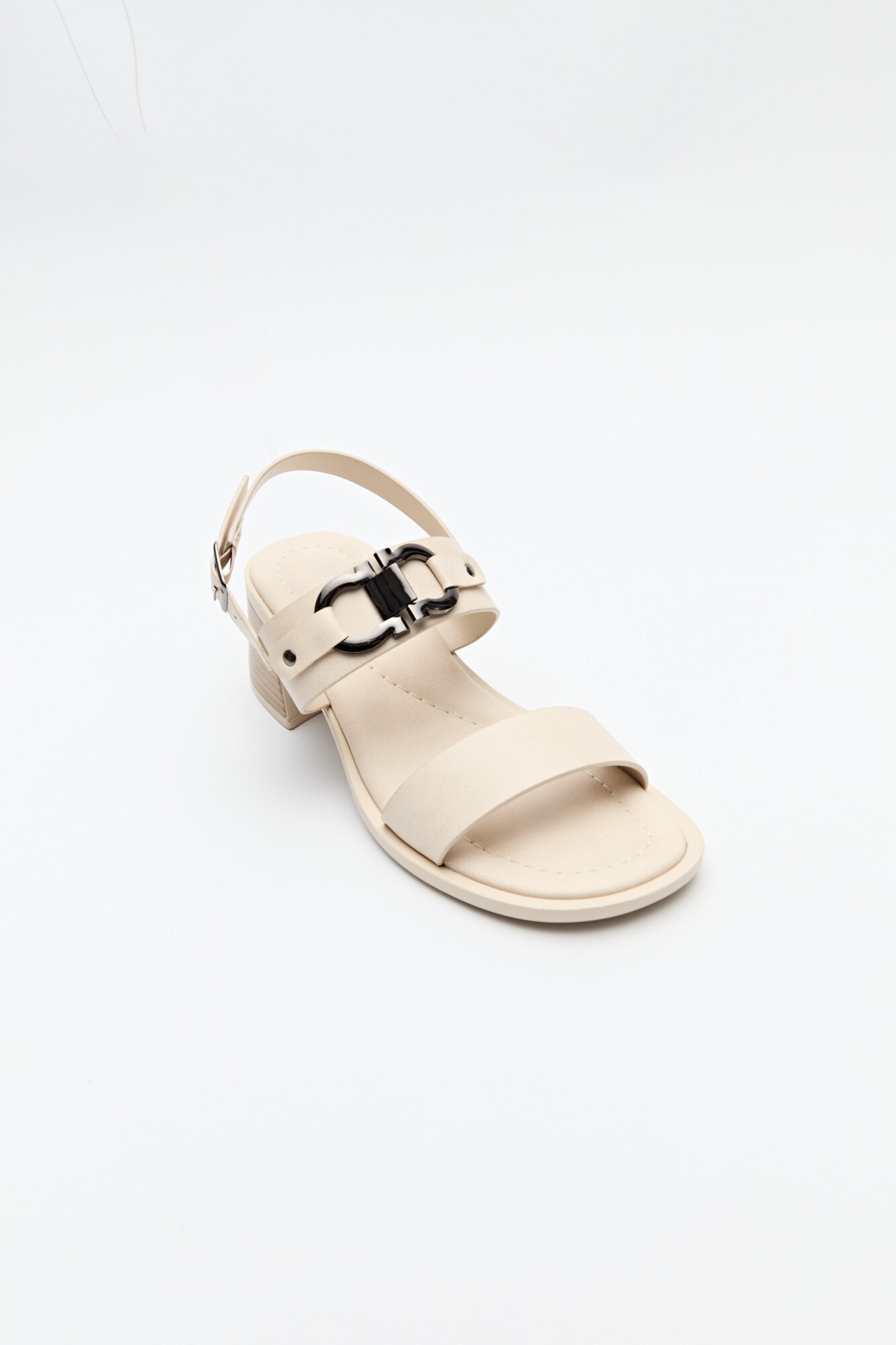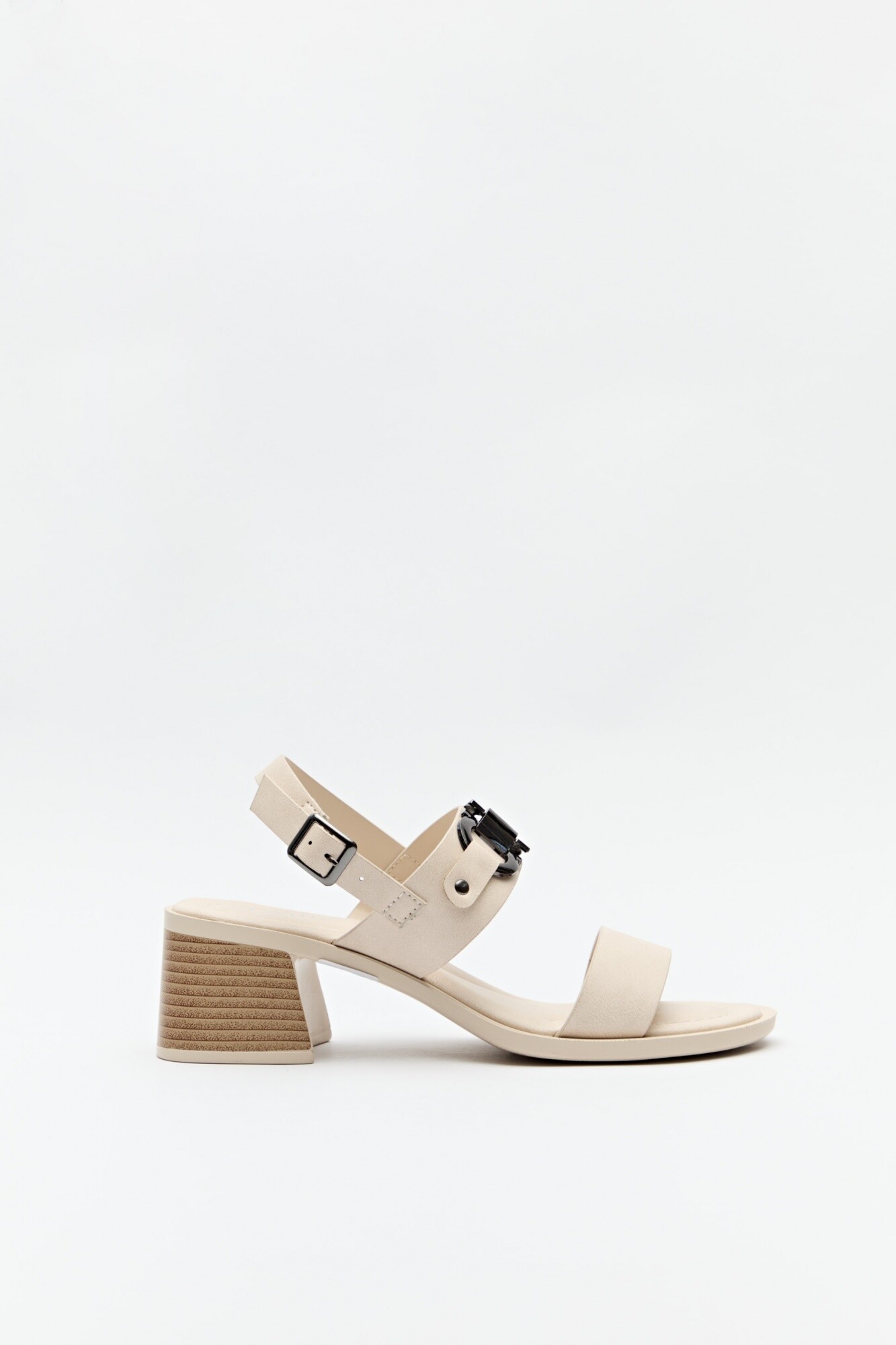 Sandalia con taco medio y diseño de tiras anchas cruzadas. Presenta hebilla lateral y herraje metálico en el empeine que aporta un toque actual y elegante. Su base cómoda y su silueta versátil la vuelven ideal para acompañar tanto looks casuales como más arreglados.