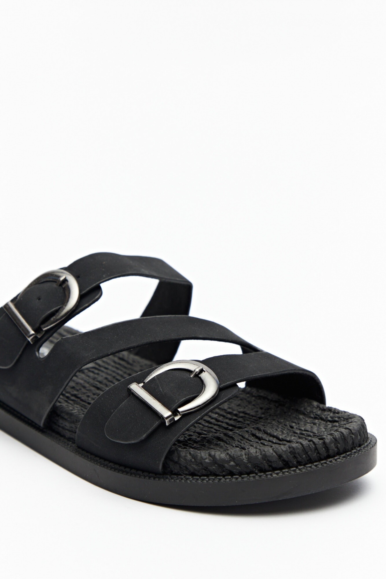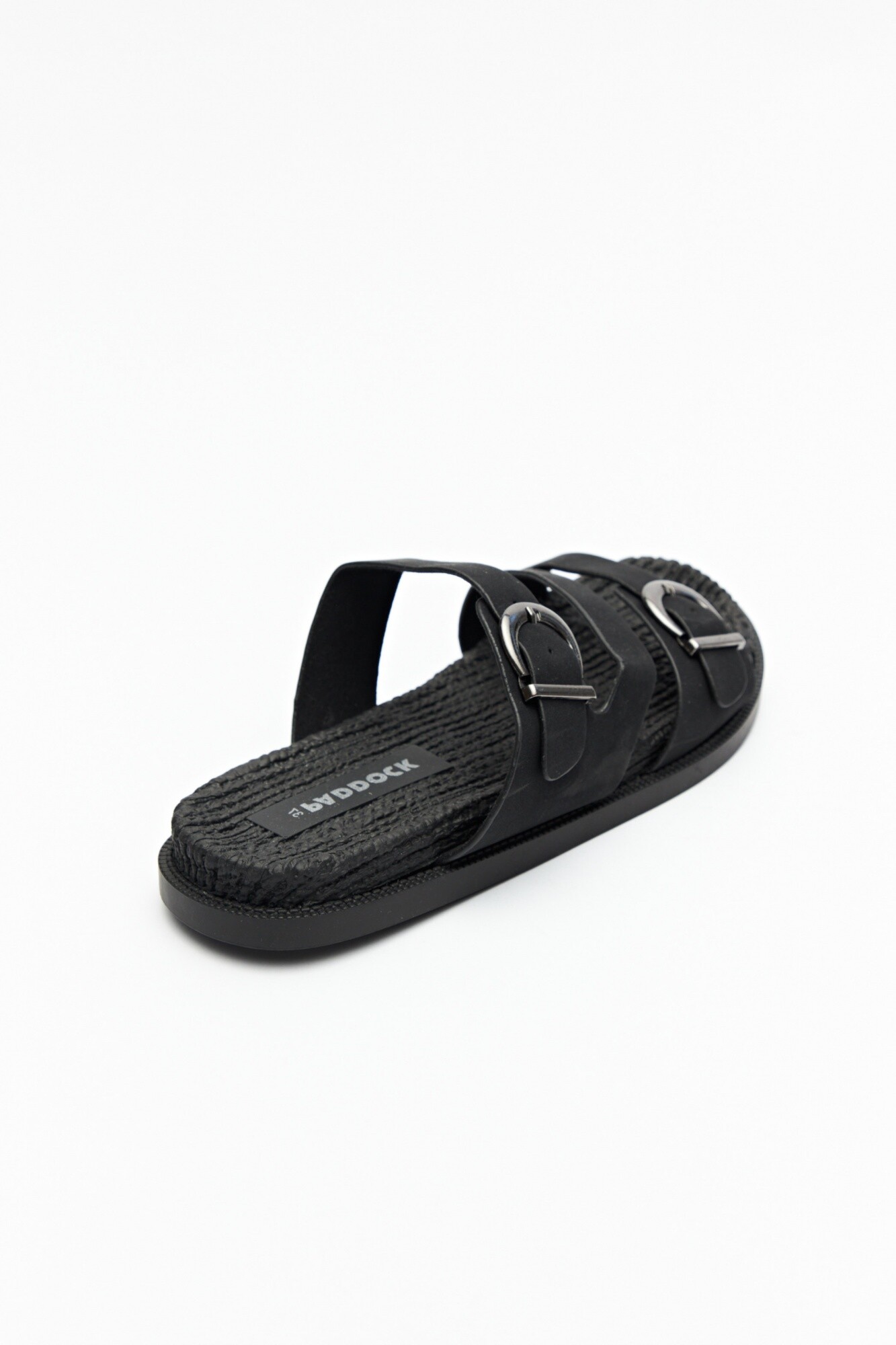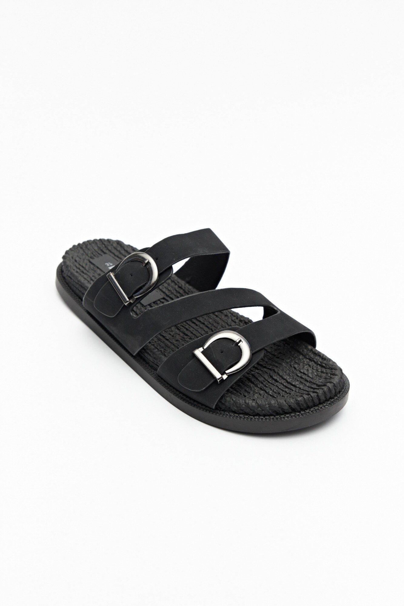 Sandalia plana con base de fibra trenzada y tiras en símil cuero ajustables con hebillas metálicas.