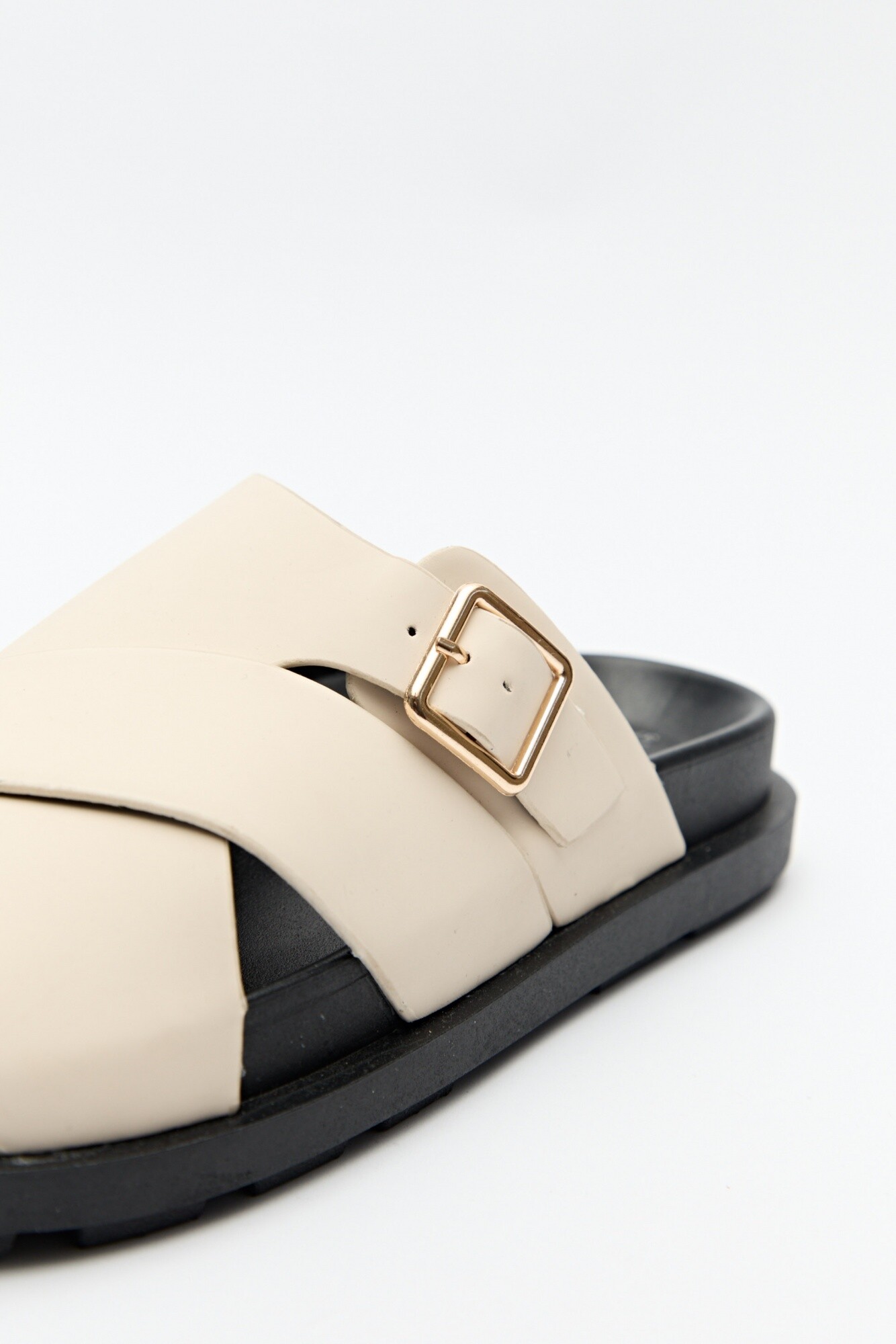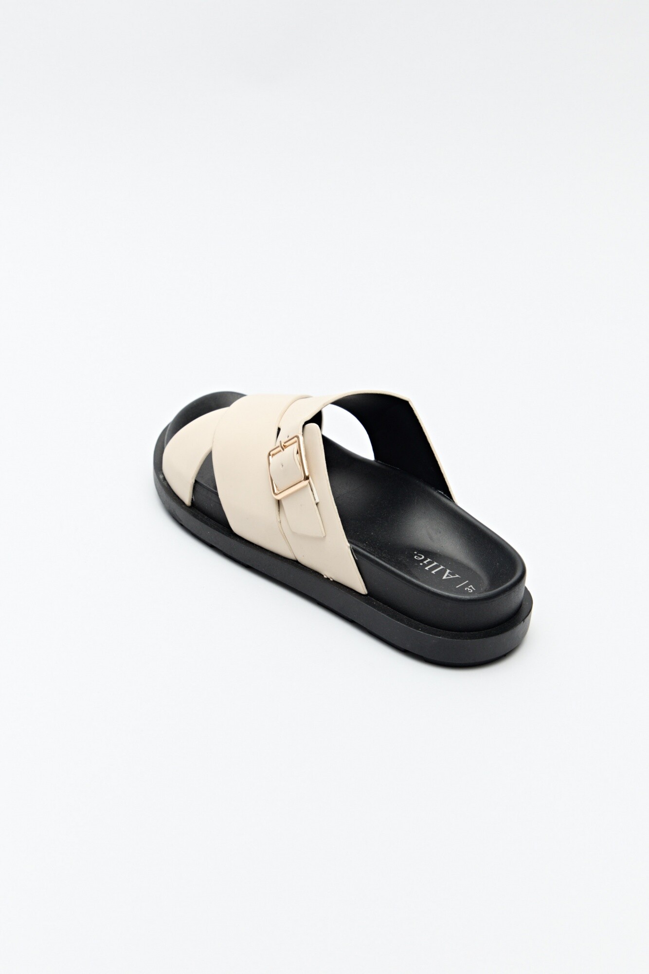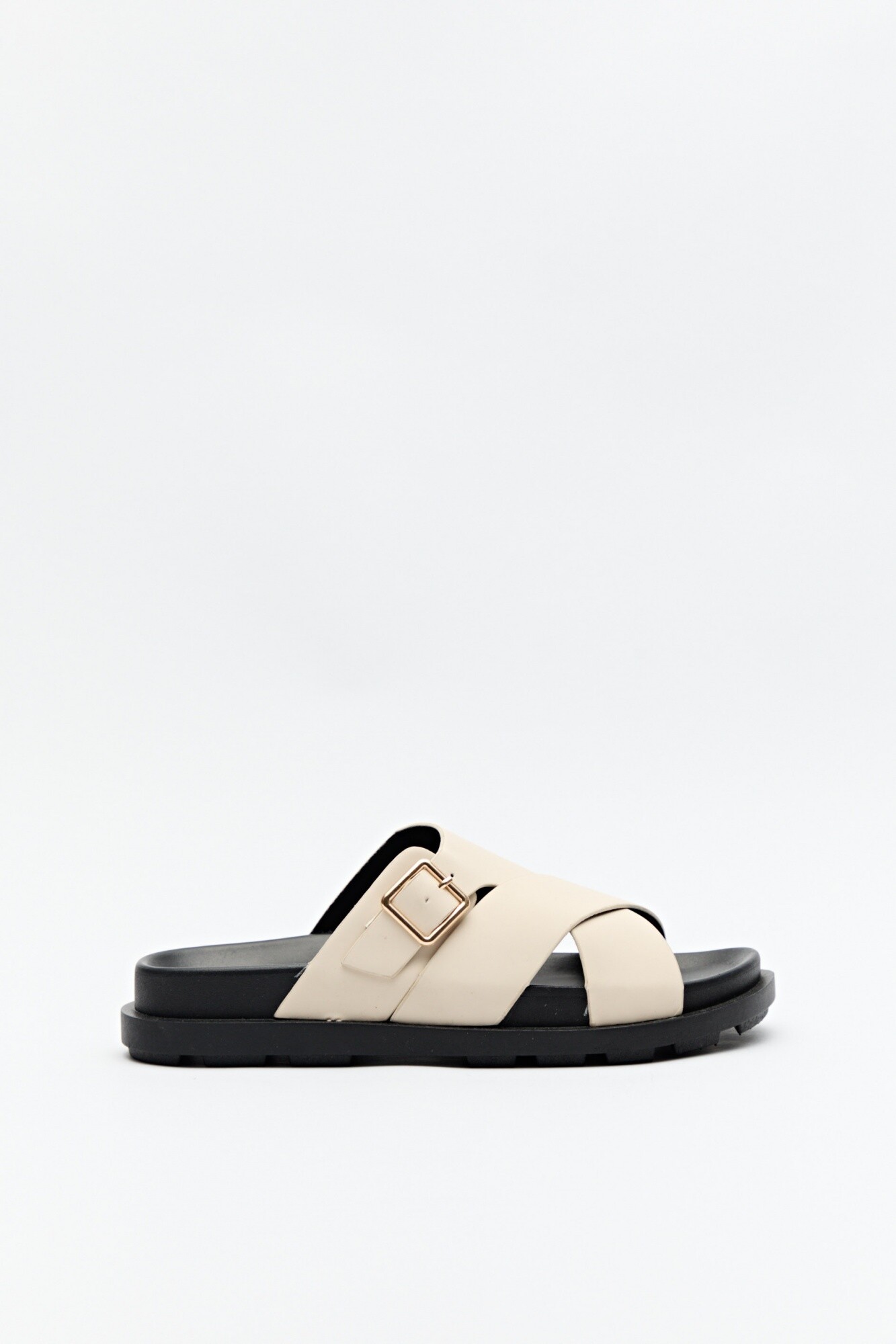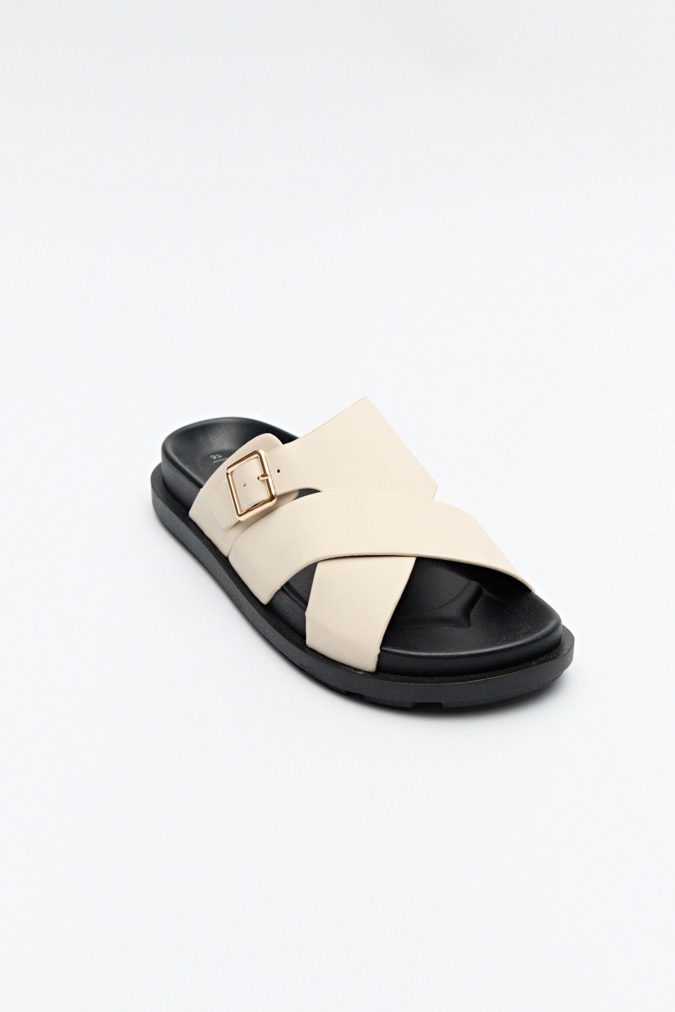 Sandalia con diseño de tiras cruzadas y hebilla metálica lateral. Su base anatómica aporta confort, mientras que el acabado mate le da un aire moderno y minimalista. Ideal para acompañar desde looks urbanos hasta conjuntos de verano relajados.