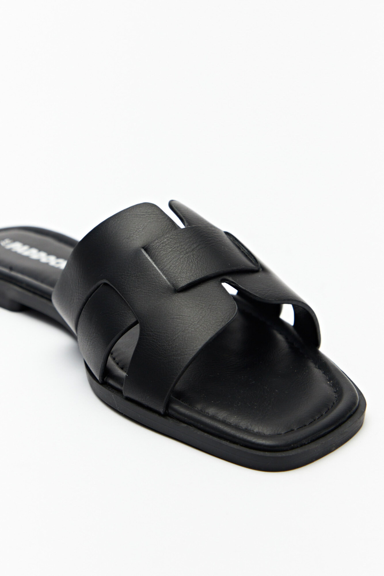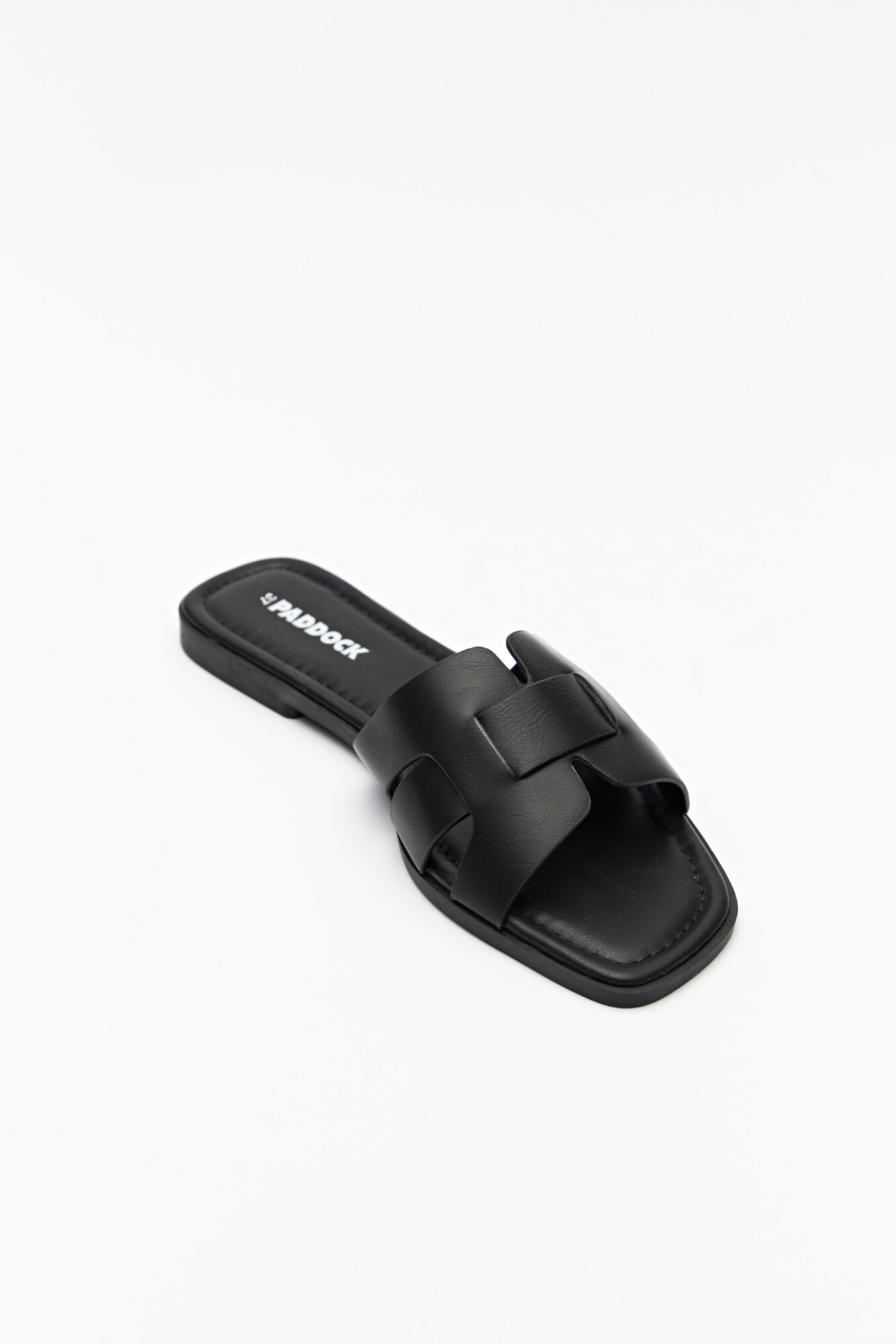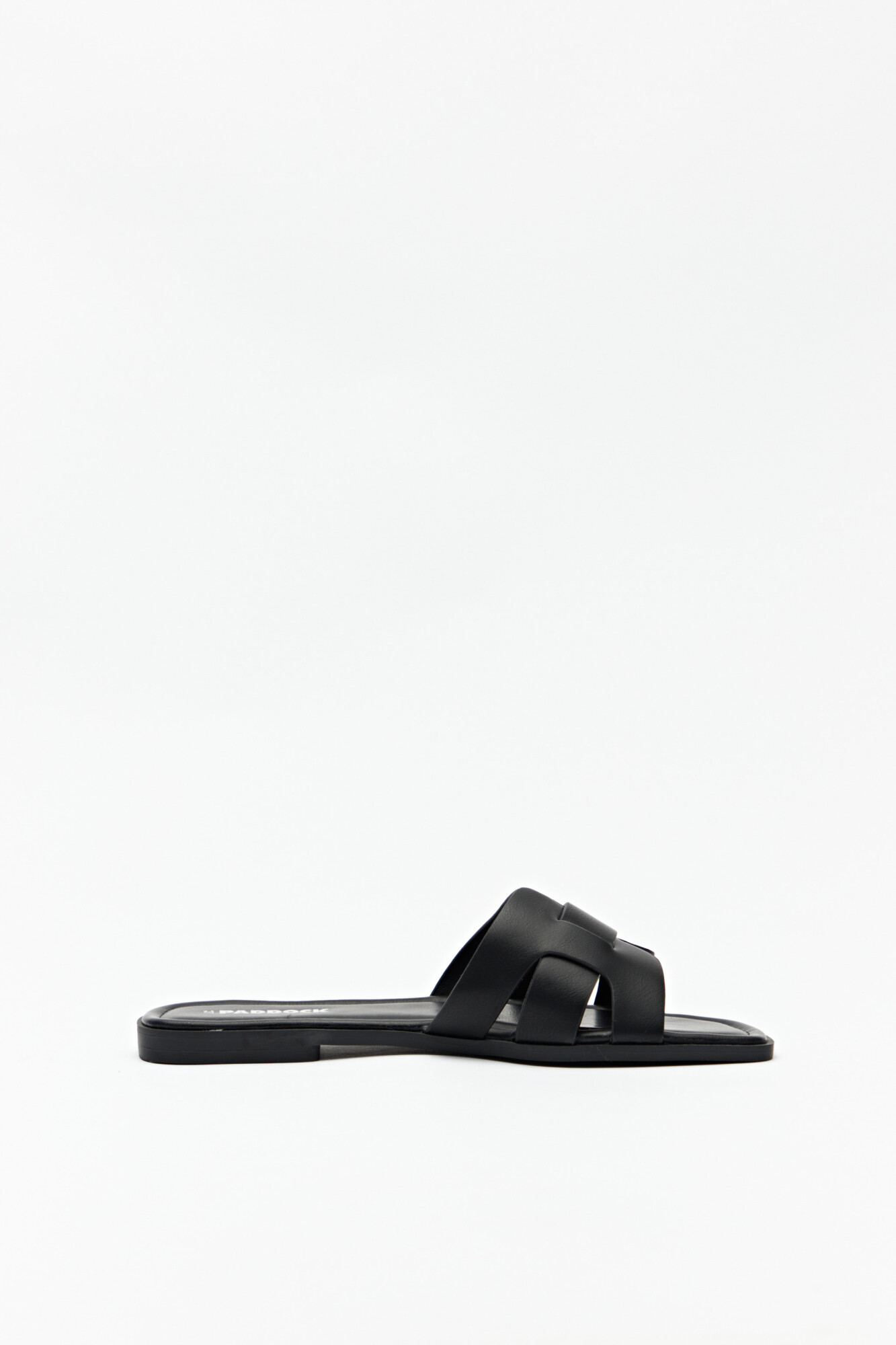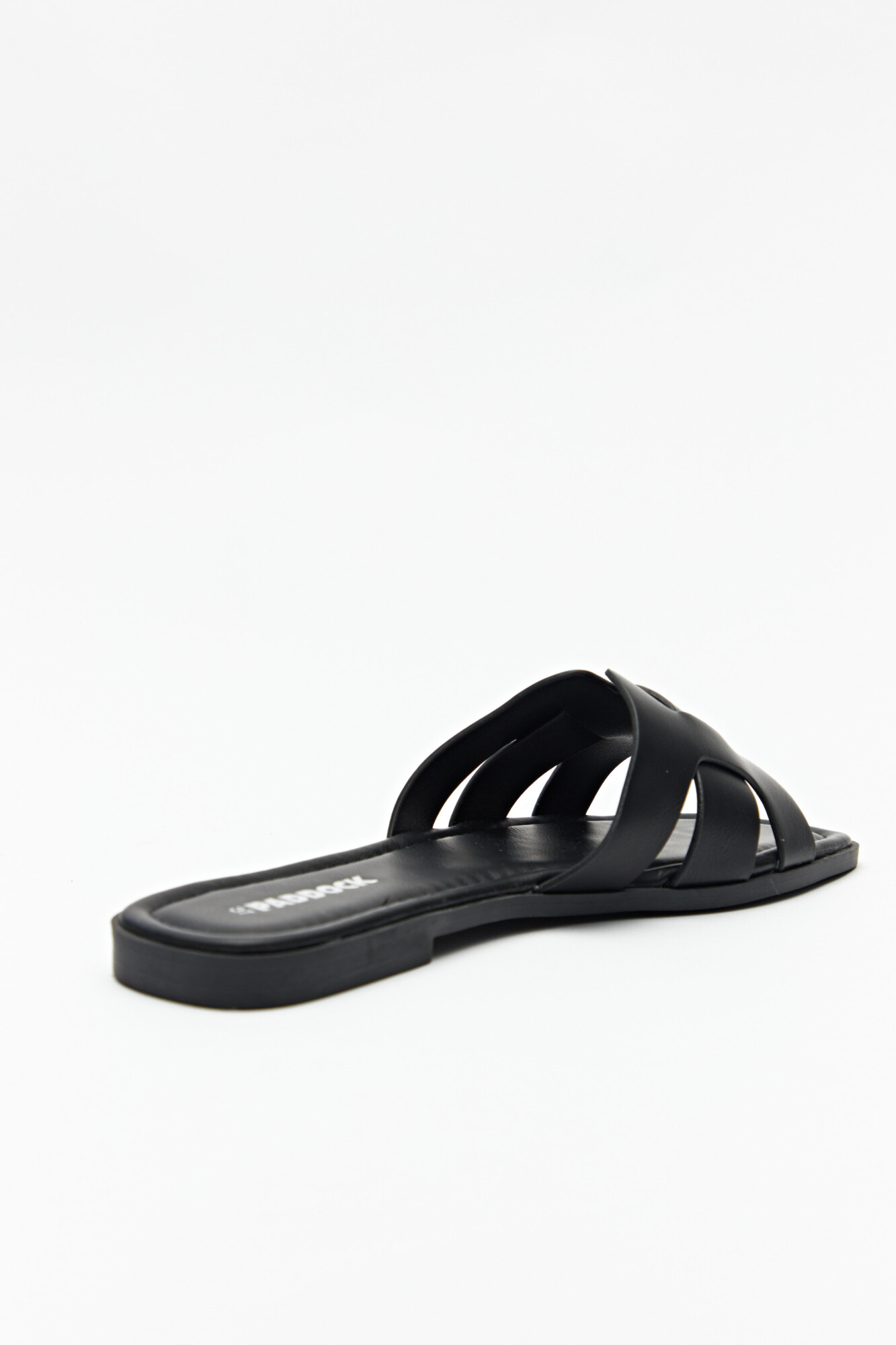 Sandalias bajas abiertas en símil cuero con capellada entrelazada.