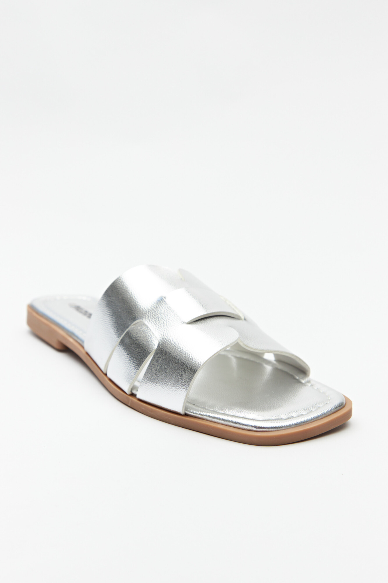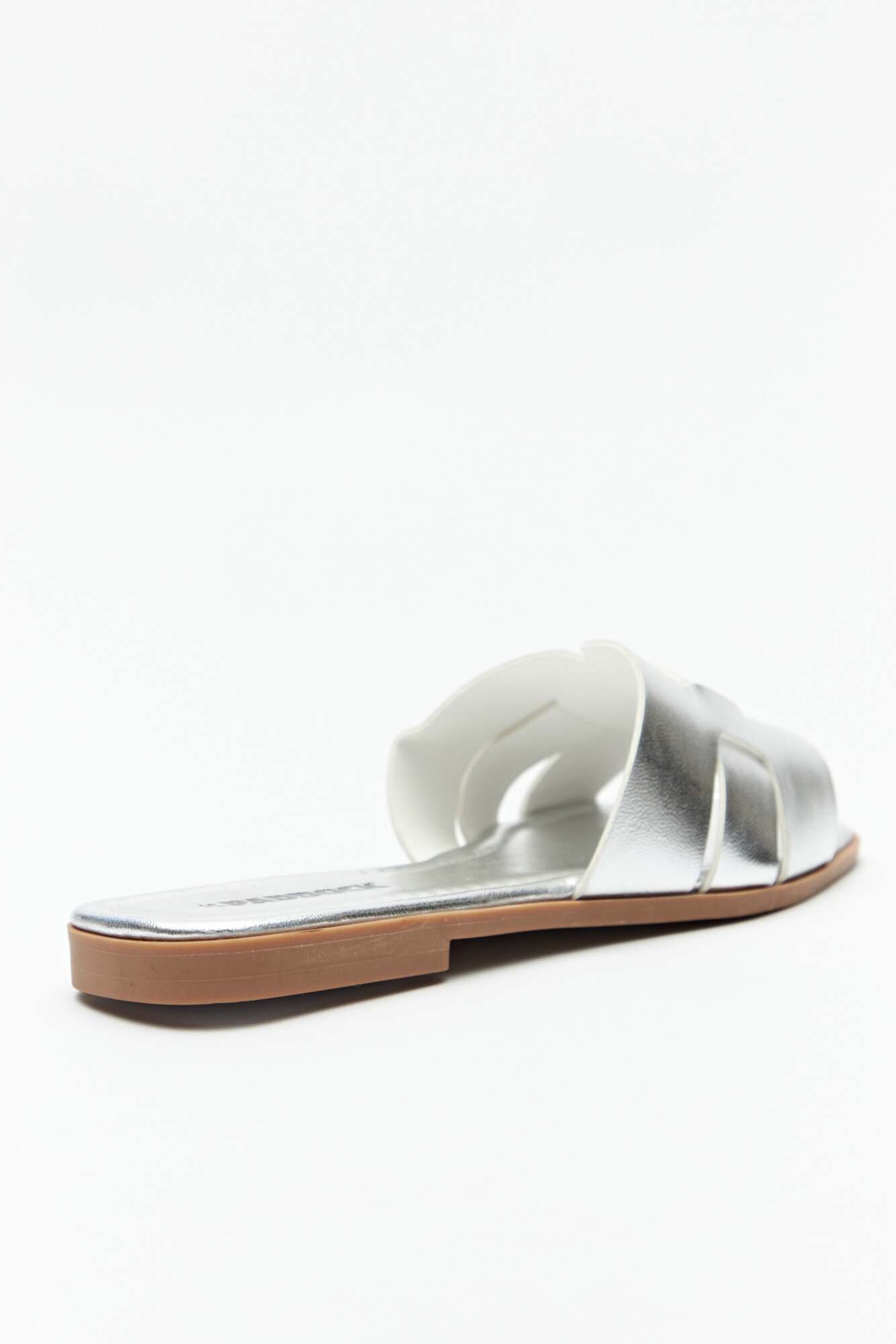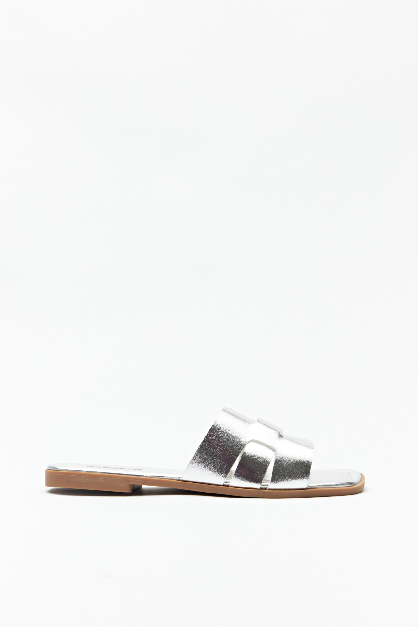 Sandalias bajas abiertas en símil cuero con capellada entrelazada.