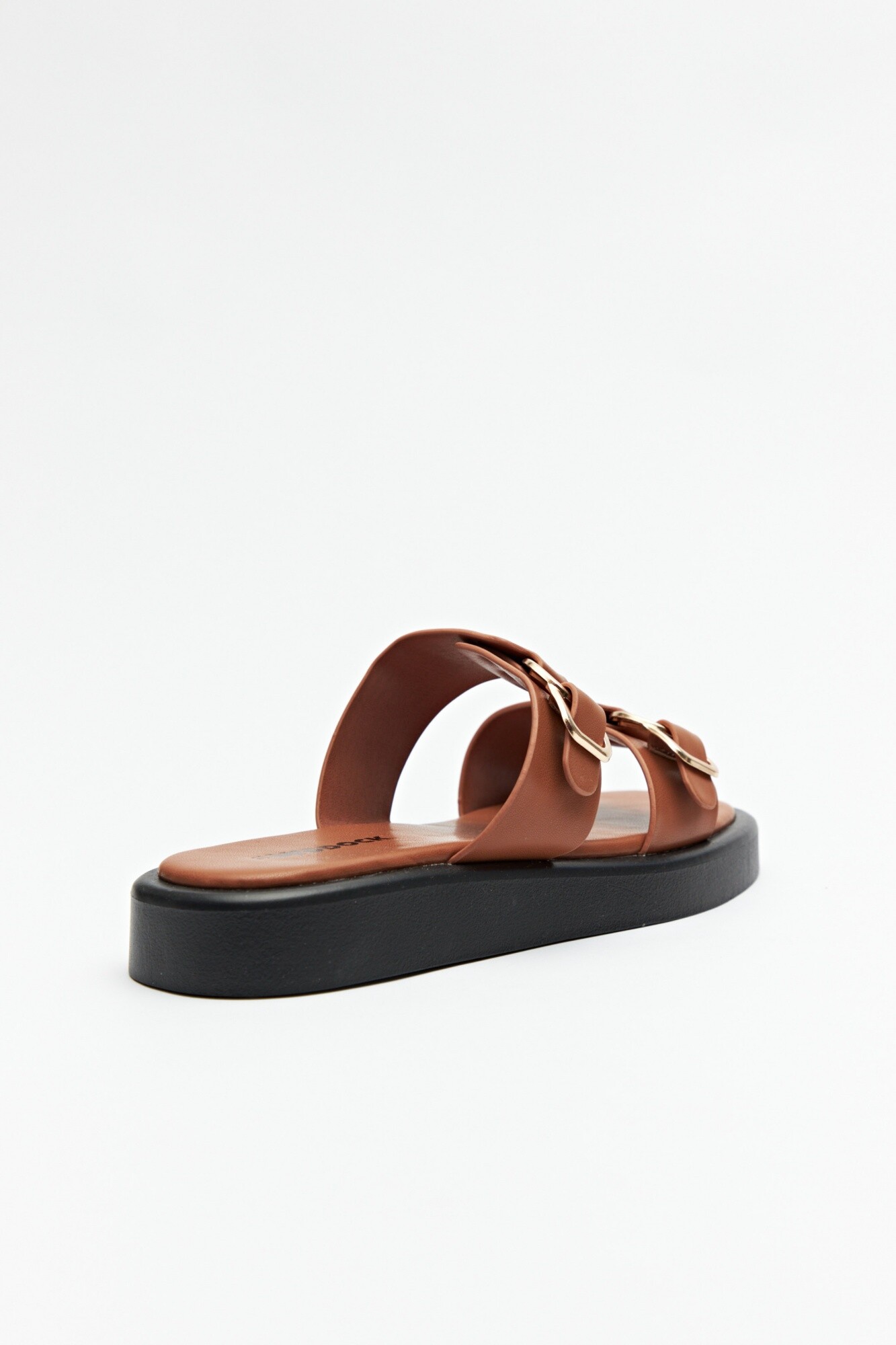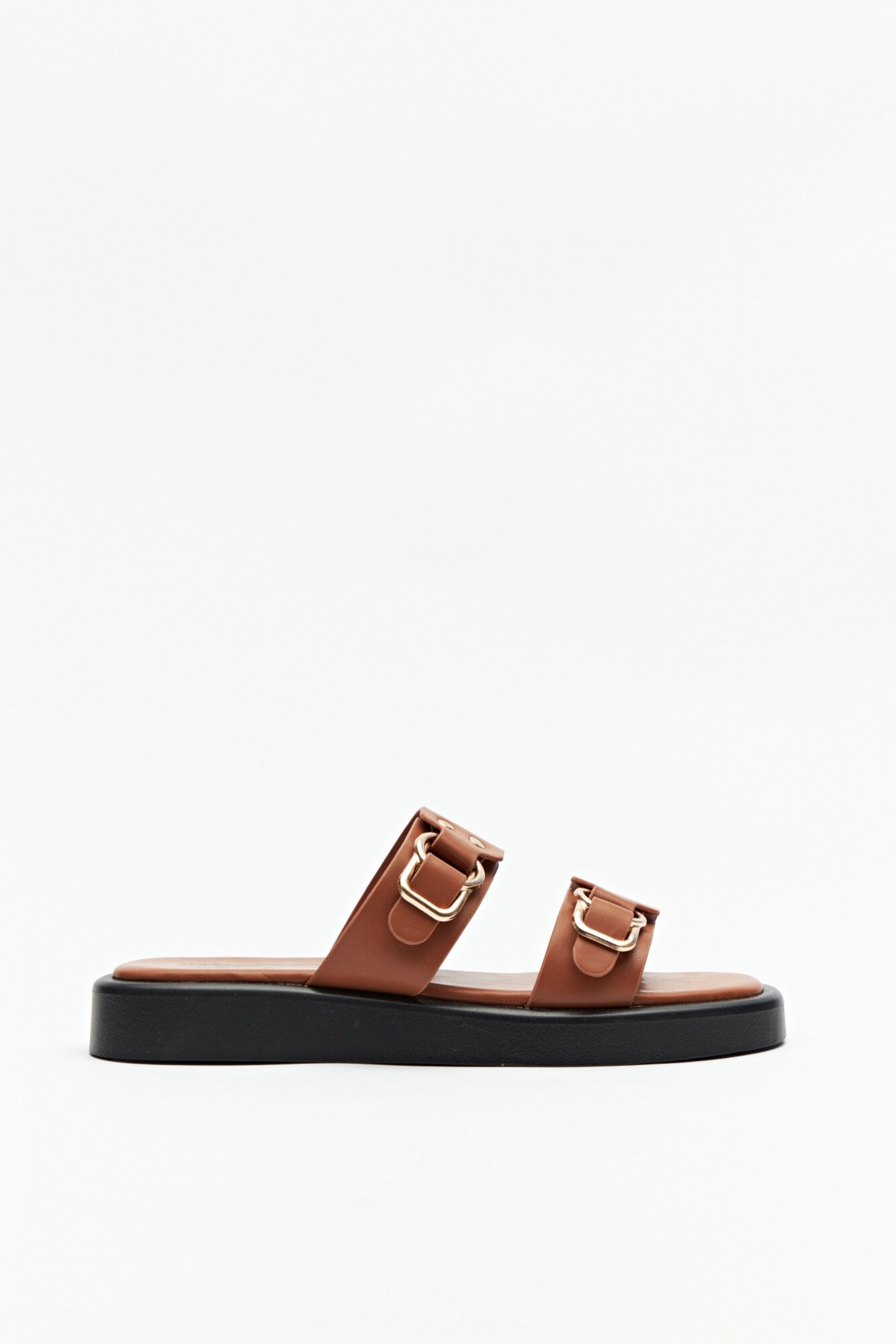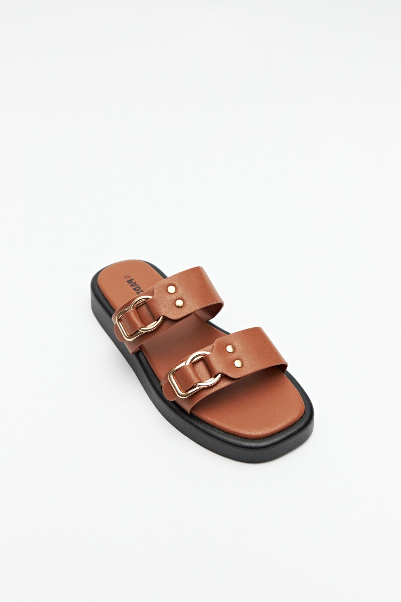 Sandalias de plataforma de 2,5cm de alto. Tiras en símil cuero con detalles metálicos.