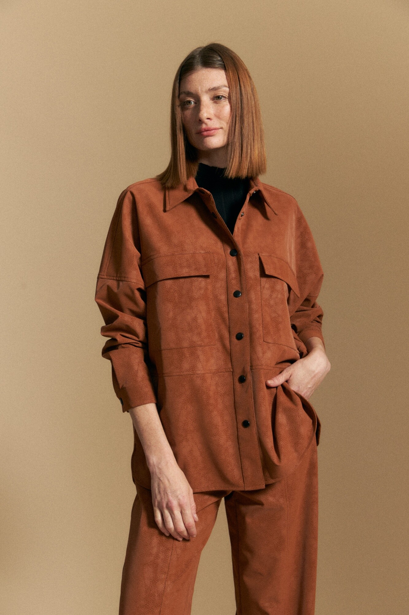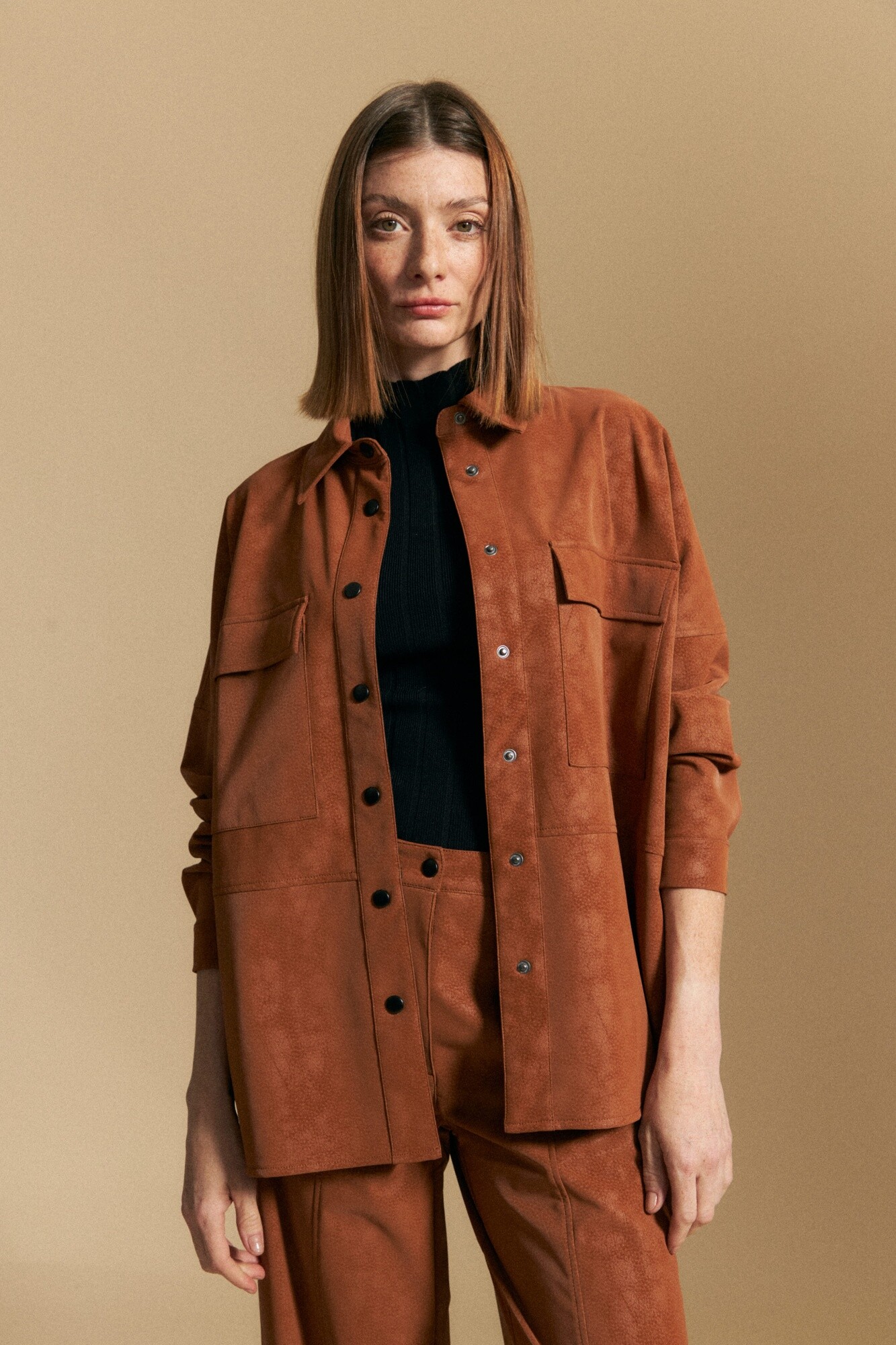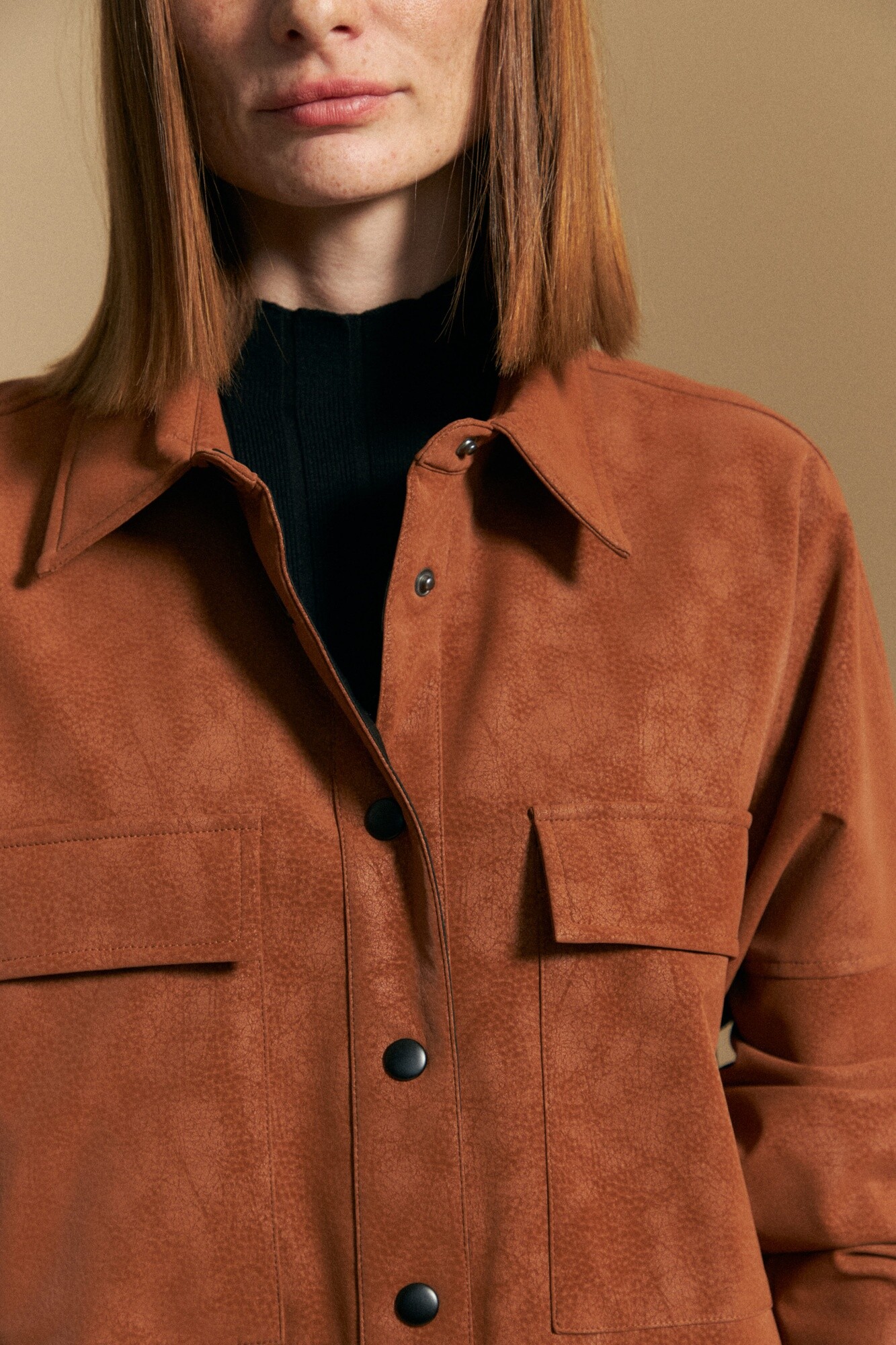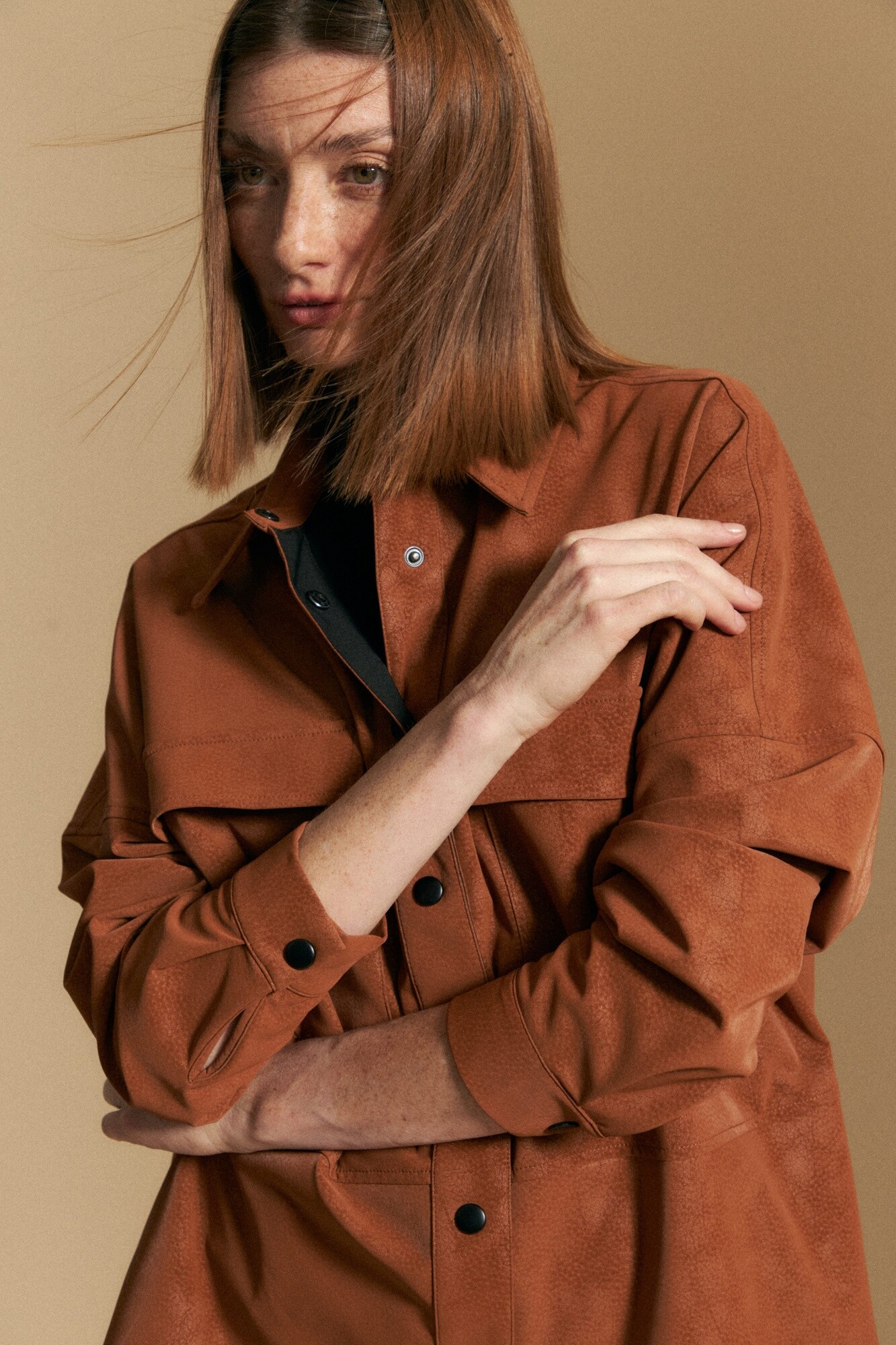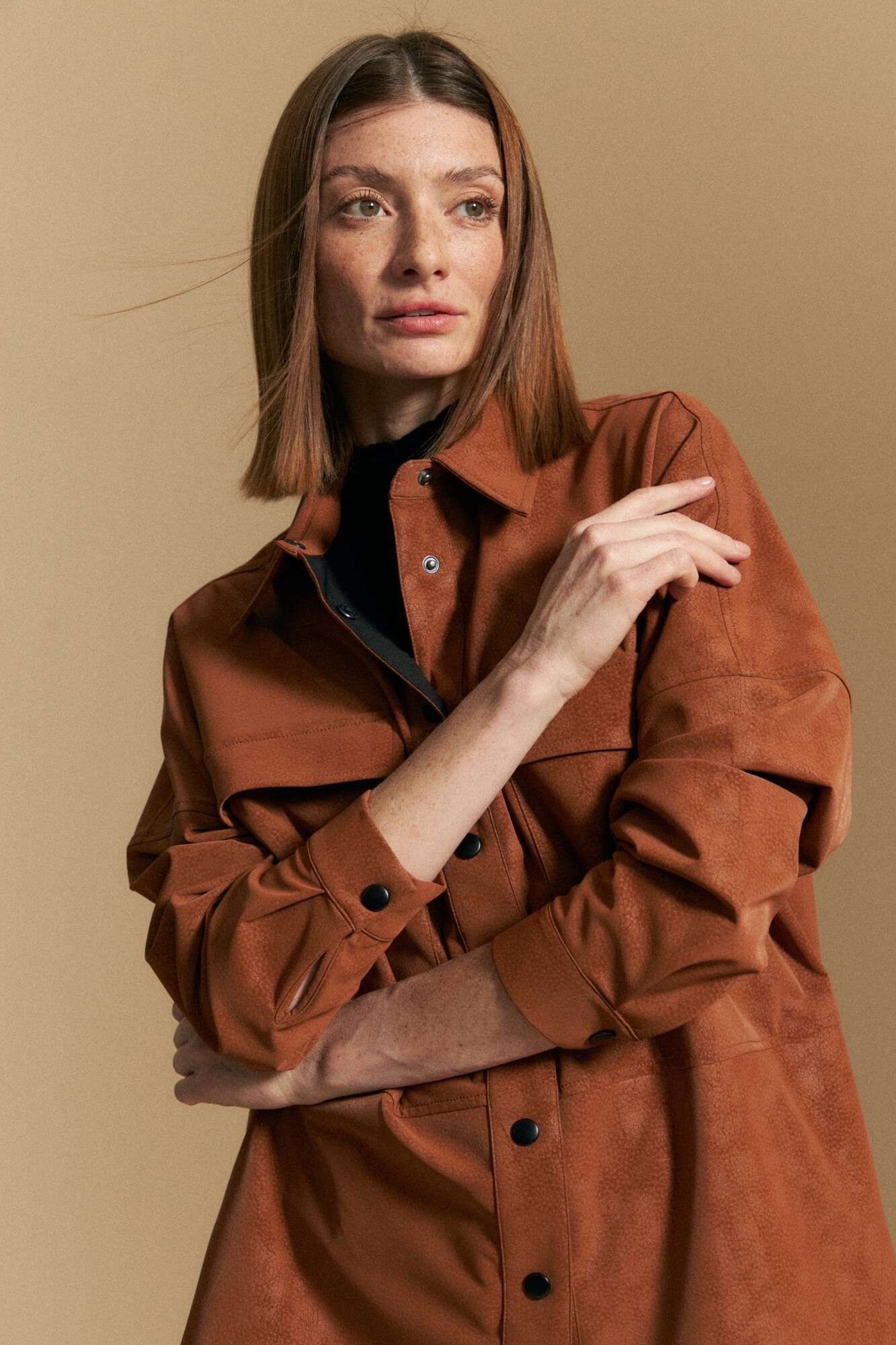 Sobrecamisa engomada con textura lavada y botones de abroche a tono. Es una prenda canchera, versátil y en tendencia!