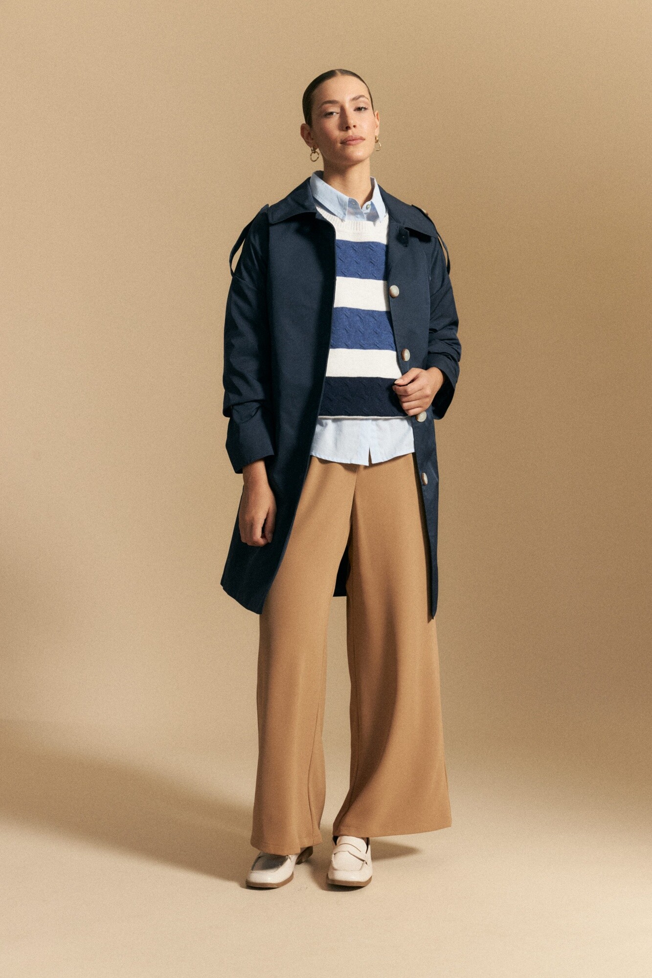 Su silueta relajada lo convierte en una opción versátil para looks urbanos y cotidianos, ideal para combinar con denim o sumar a conjuntos más pulidos. El mix de fibras ofrece suavidad, abrigo liviano y buena resistencia, manteniendo la forma de la prenda a lo largo del uso.