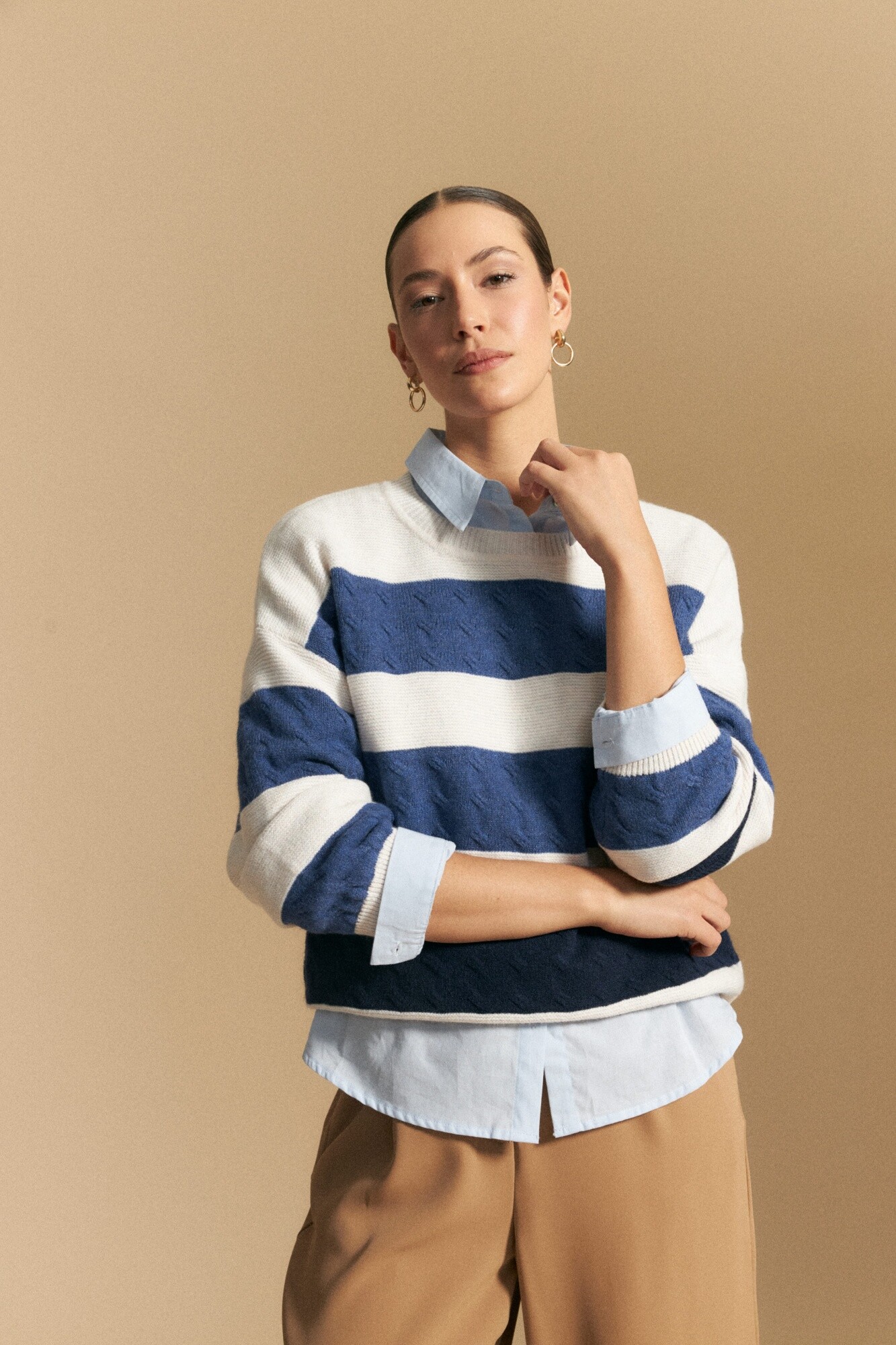 Sweater a rayas de manga larga, con diseño de franjas horizontales que combinan textura y contraste para lograr una prenda con presencia y estilo. El tejido incorpora un sutil efecto tramado que suma relieve al diseño, mientras que el cuello redondo, los puños y el ruedo acanalados aportan estructura al calce.