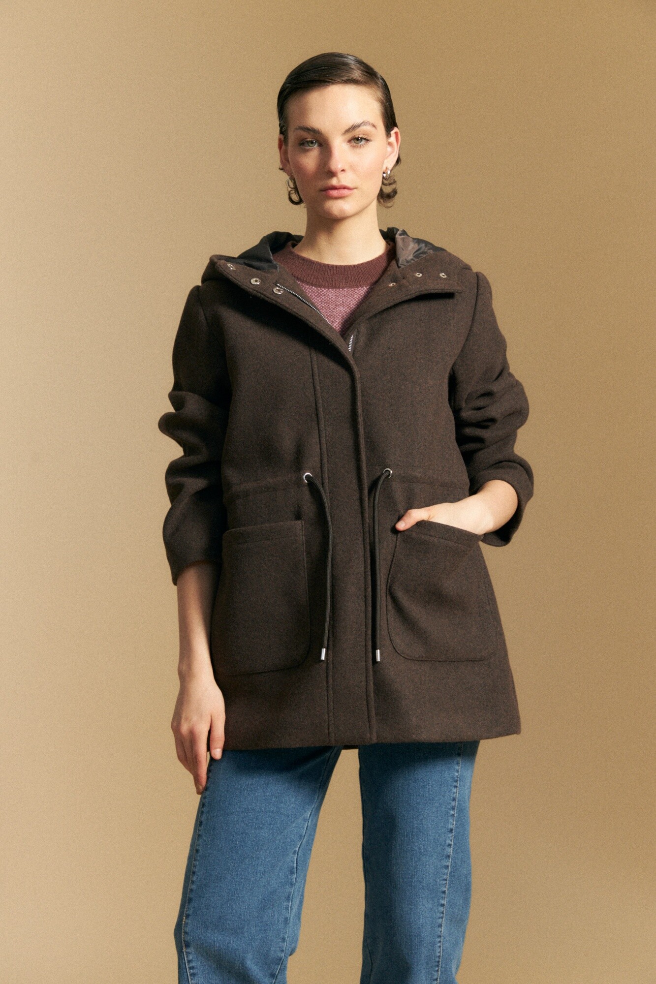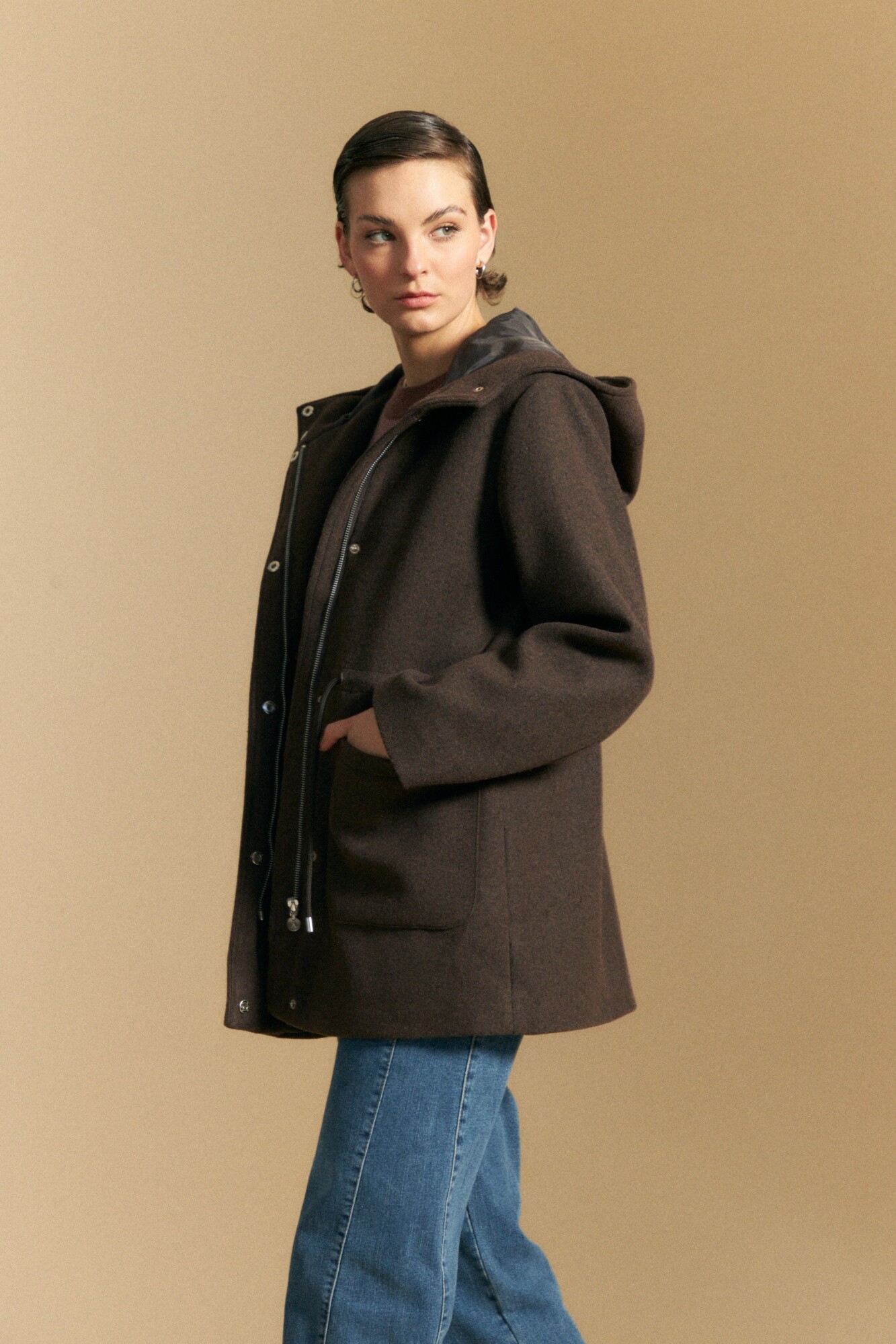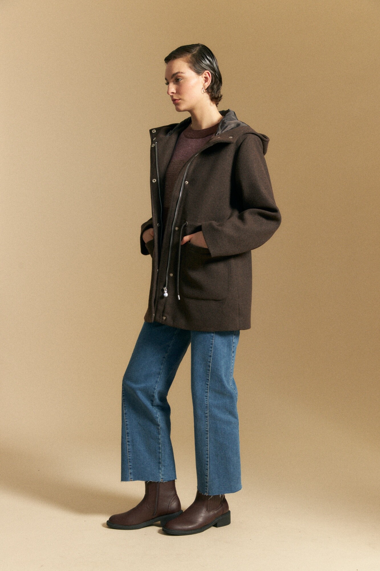 Tapado de paño tipo montgomery con capucha y silueta recta, ideal para sumar abrigo con un aire clásico y atemporal. El diseño incorpora cierre frontal oculto con broches, bolsillos aplicados y ajuste interno en cintura que permite entallar la prenda y adaptar el calce. La capucha amplia refuerza el carácter funcional, mientras que el paño aporta estructura y calidez para los días más fríos. Una prenda versátil que eleva looks urbanos y acompaña el uso diario con estilo.