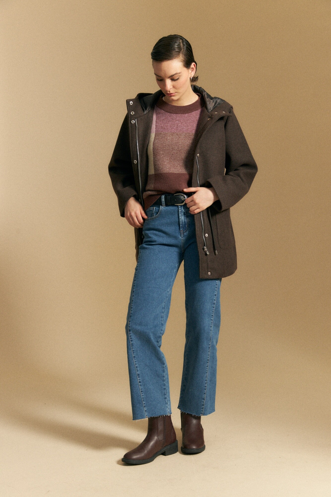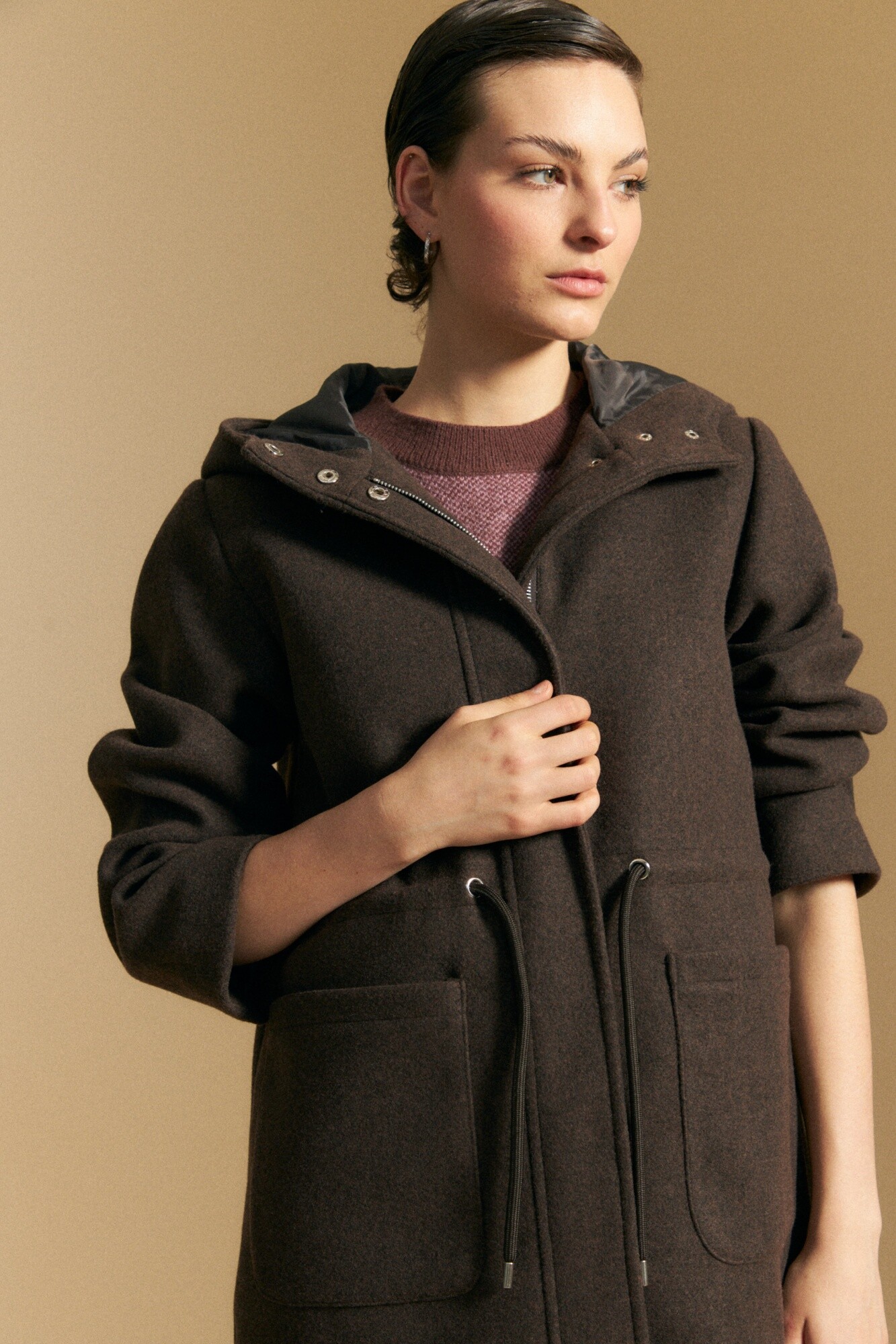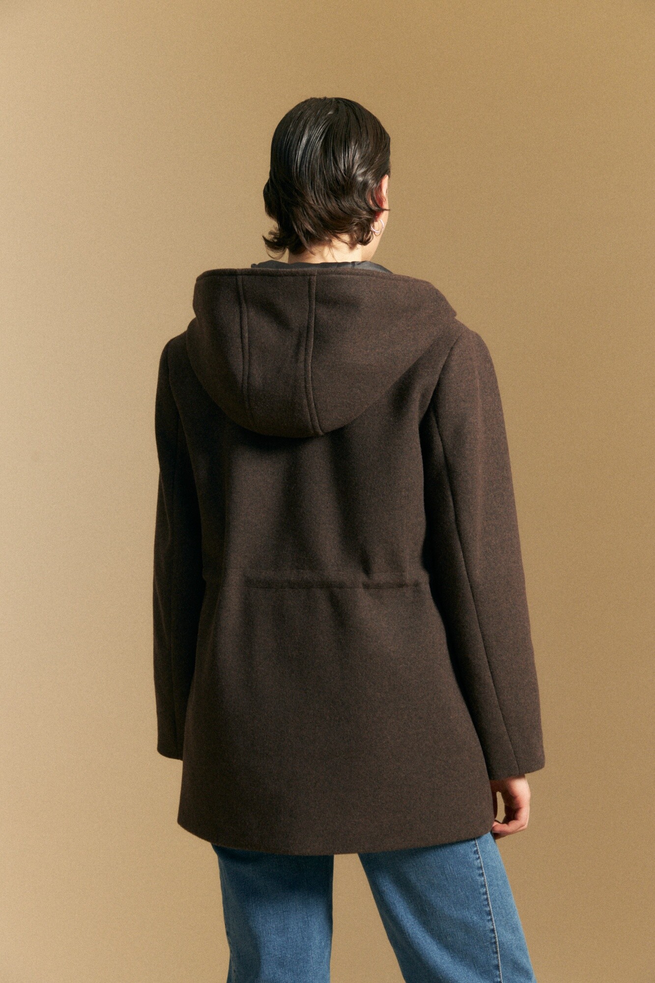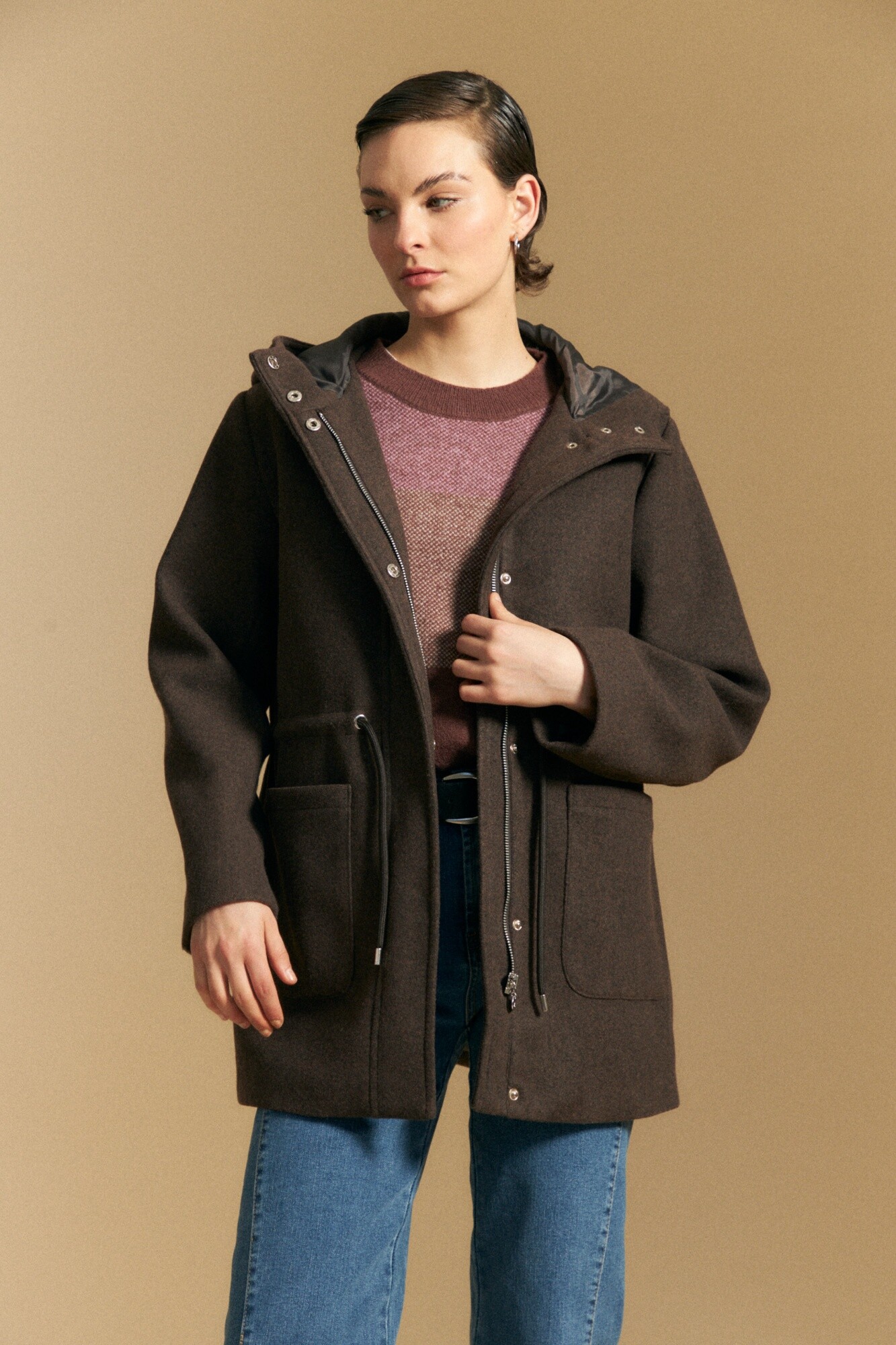 Tapado de paño tipo montgomery con capucha y silueta recta, ideal para sumar abrigo con un aire clásico y atemporal. El diseño incorpora cierre frontal oculto con broches, bolsillos aplicados y ajuste interno en cintura que permite entallar la prenda y adaptar el calce. La capucha amplia refuerza el carácter funcional, mientras que el paño aporta estructura y calidez para los días más fríos. Una prenda versátil que eleva looks urbanos y acompaña el uso diario con estilo.