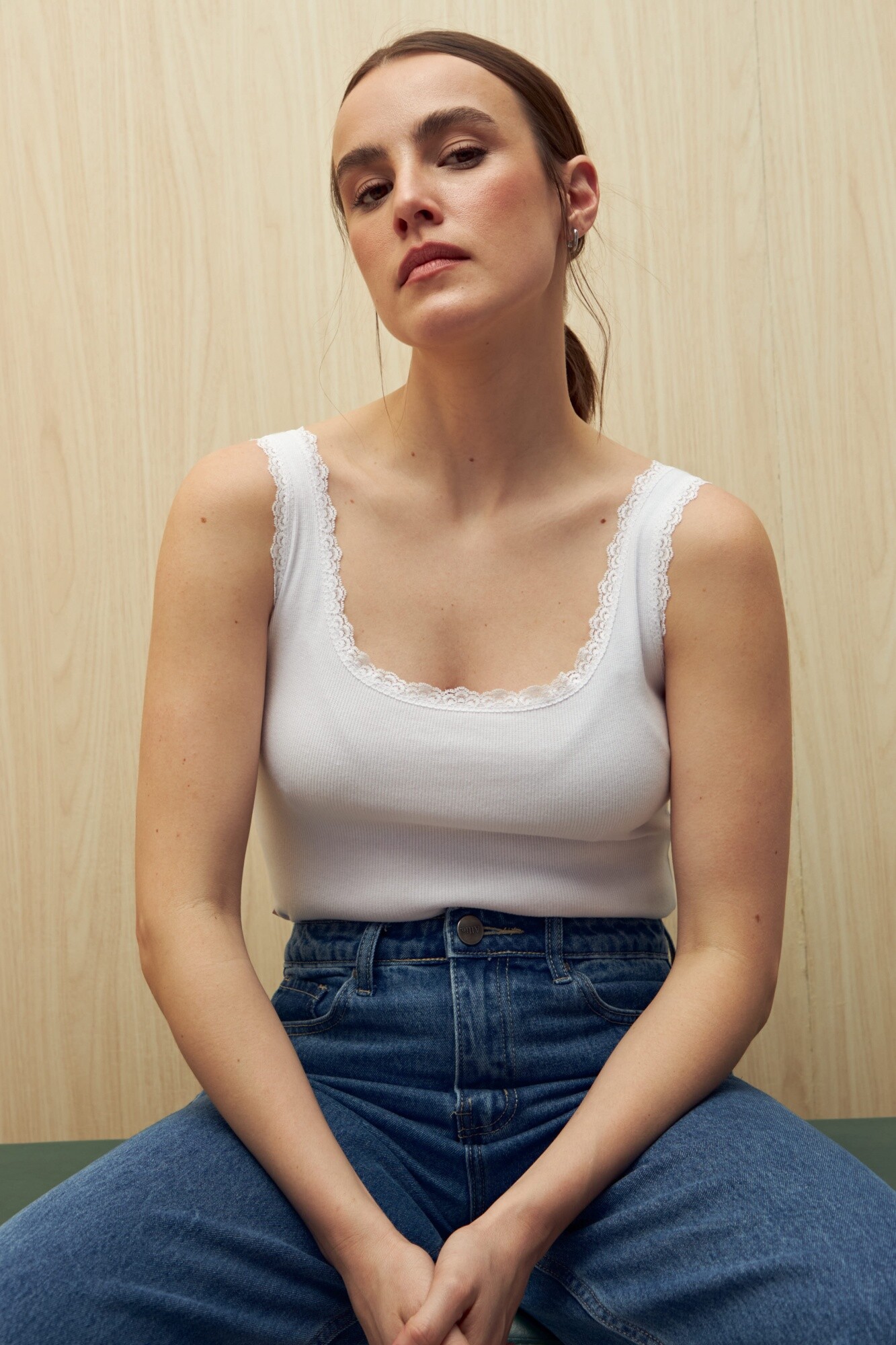Top sin mangas con escote cuadrado y delicado detalle de encaje en el borde. Su tejido con leve elasticidad se adapta al cuerpo manteniendo la comodidad y realzando la silueta. Un imprescindible del guardarropa, ideal para usar solo o como primera capa bajo camisas, blazers o sweaters.