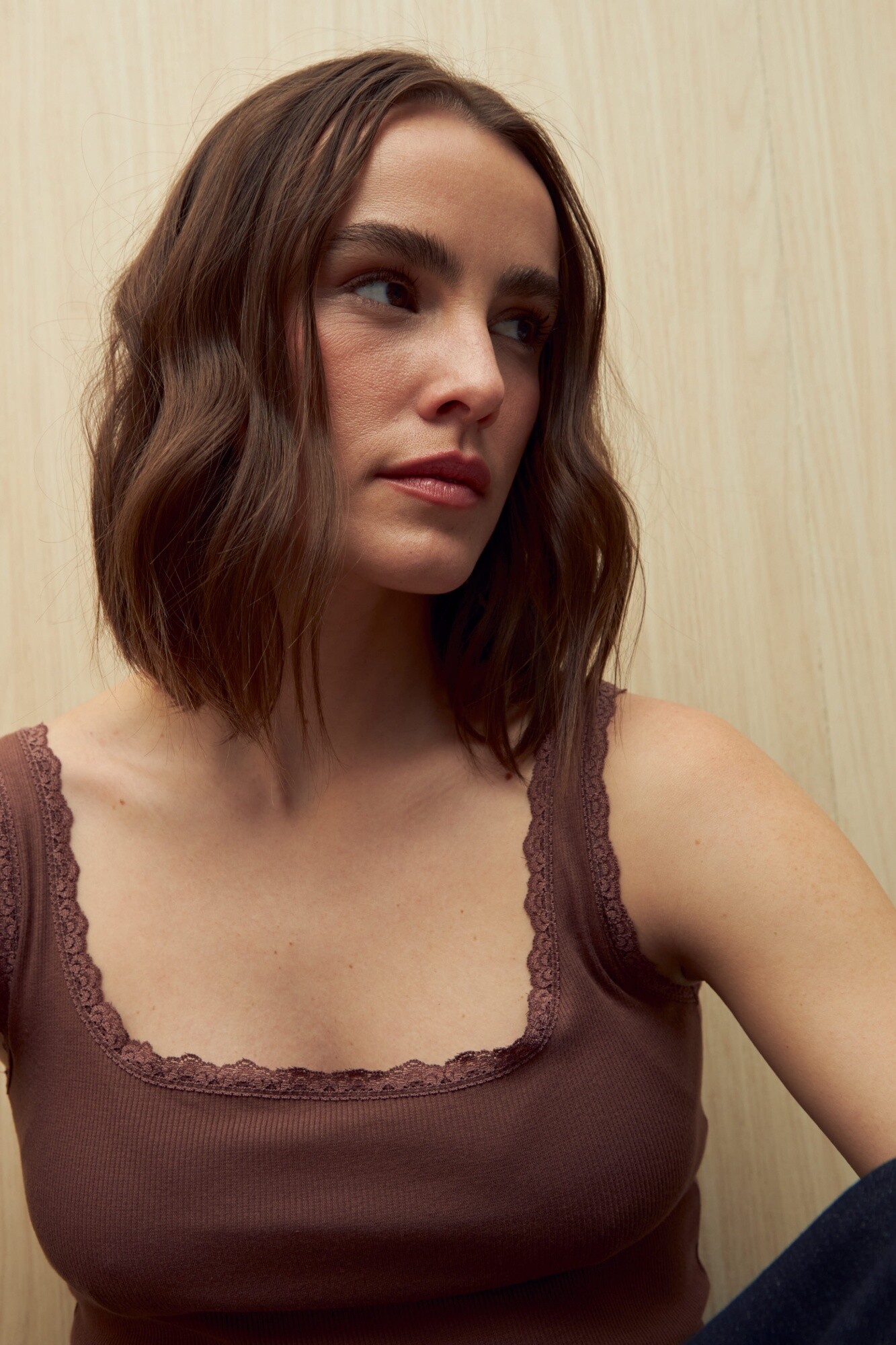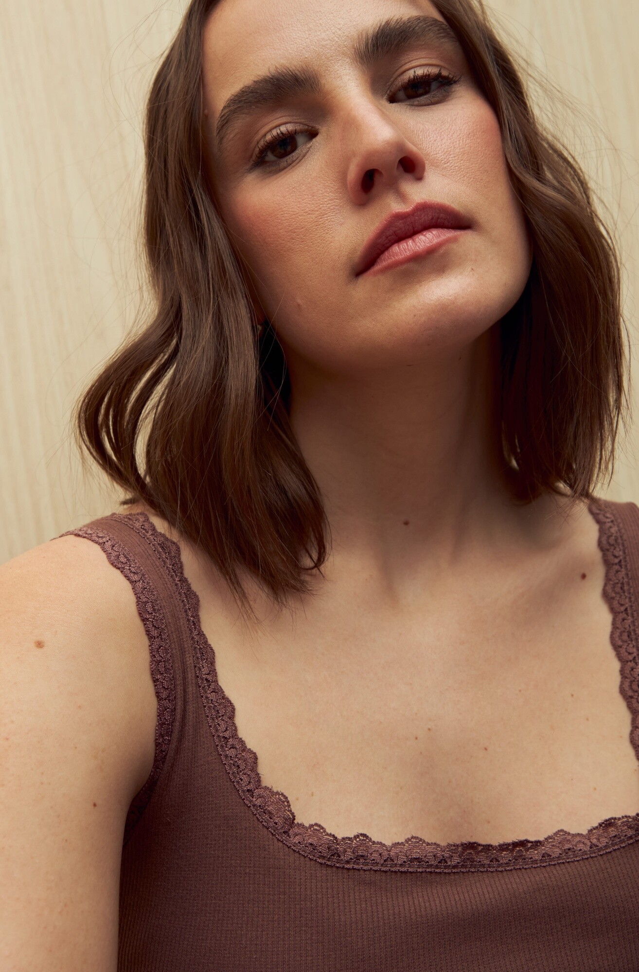 Top sin mangas con escote cuadrado y delicado detalle de encaje en el borde. Su tejido con leve elasticidad se adapta al cuerpo manteniendo la comodidad y realzando la silueta. Un imprescindible del guardarropa, ideal para usar solo o como primera capa bajo camisas, blazers o sweaters.