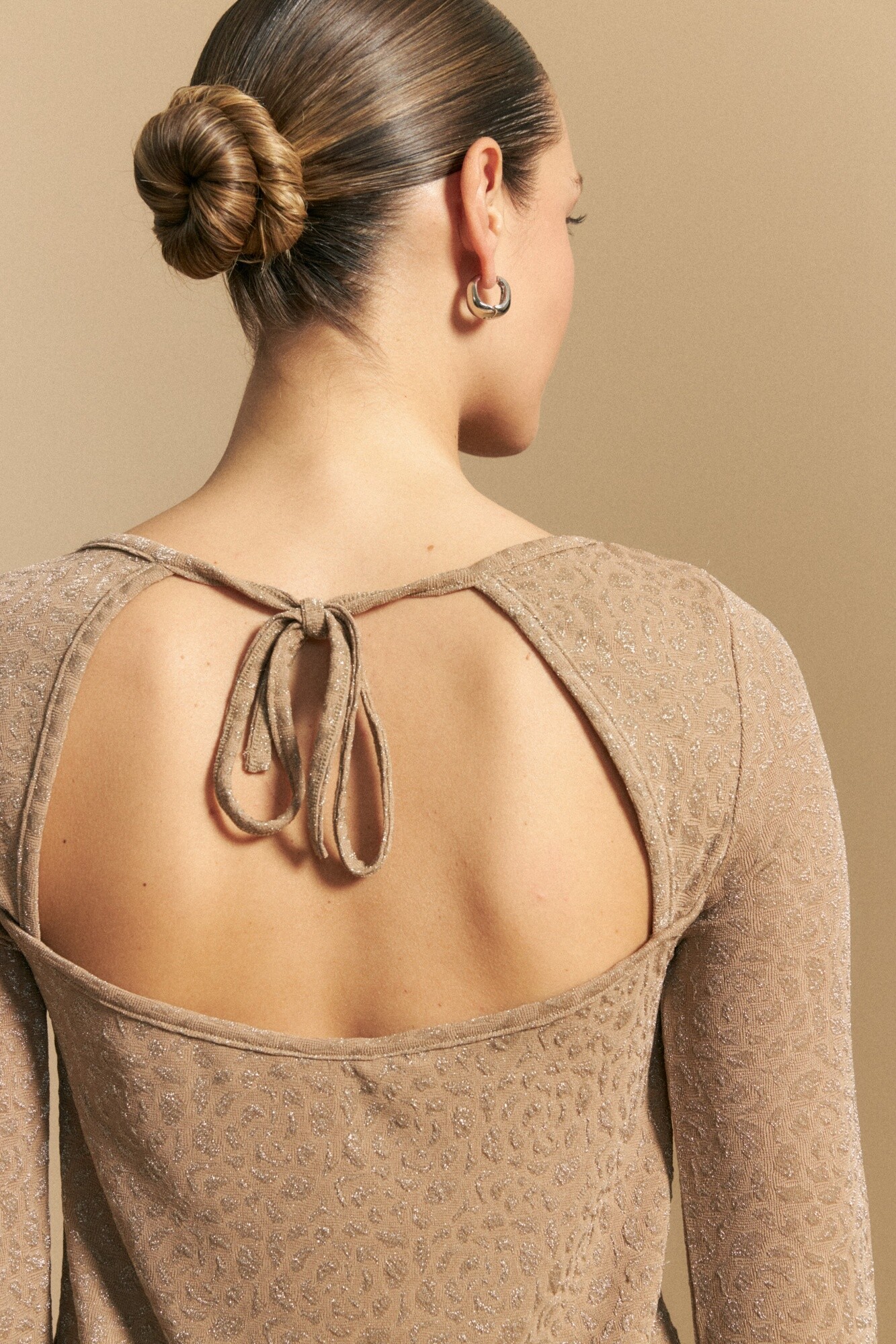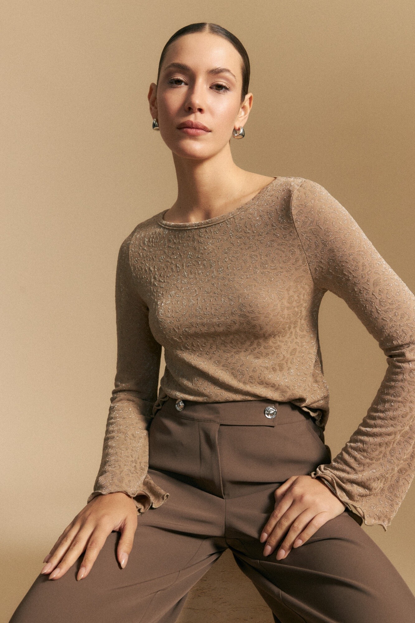 Top de mangas acampanadas con estampa texturizada, diseñado para aportar impacto visual y sofisticación. La trama con efecto animal print y sutil brillo suma profundidad al diseño, mientras que las mangas amplias le dan movimiento y una silueta elegante.