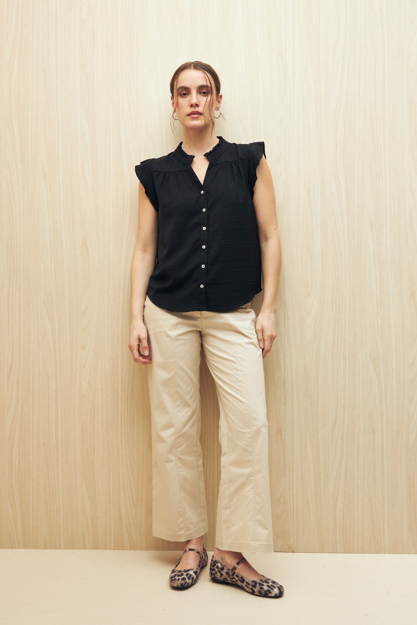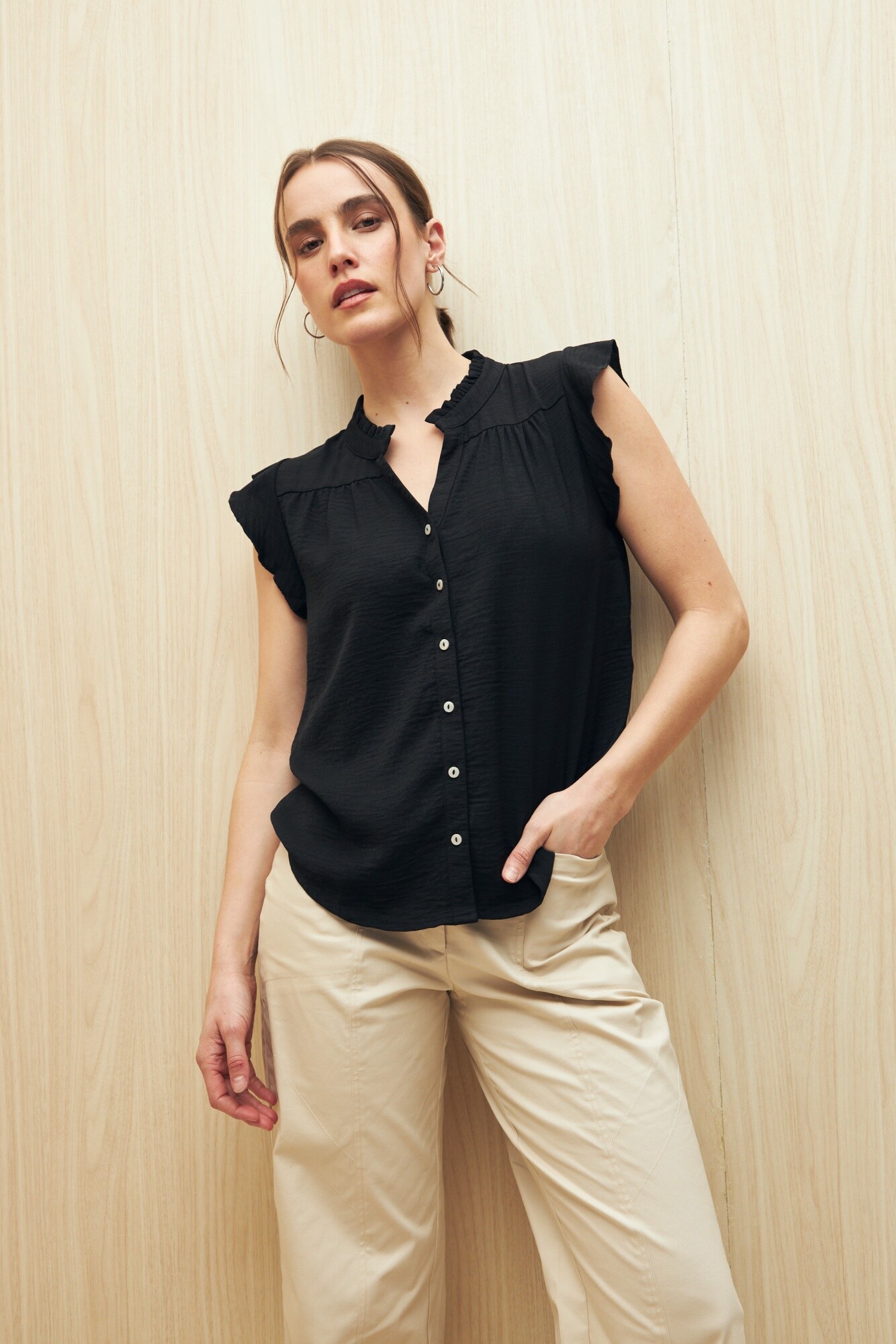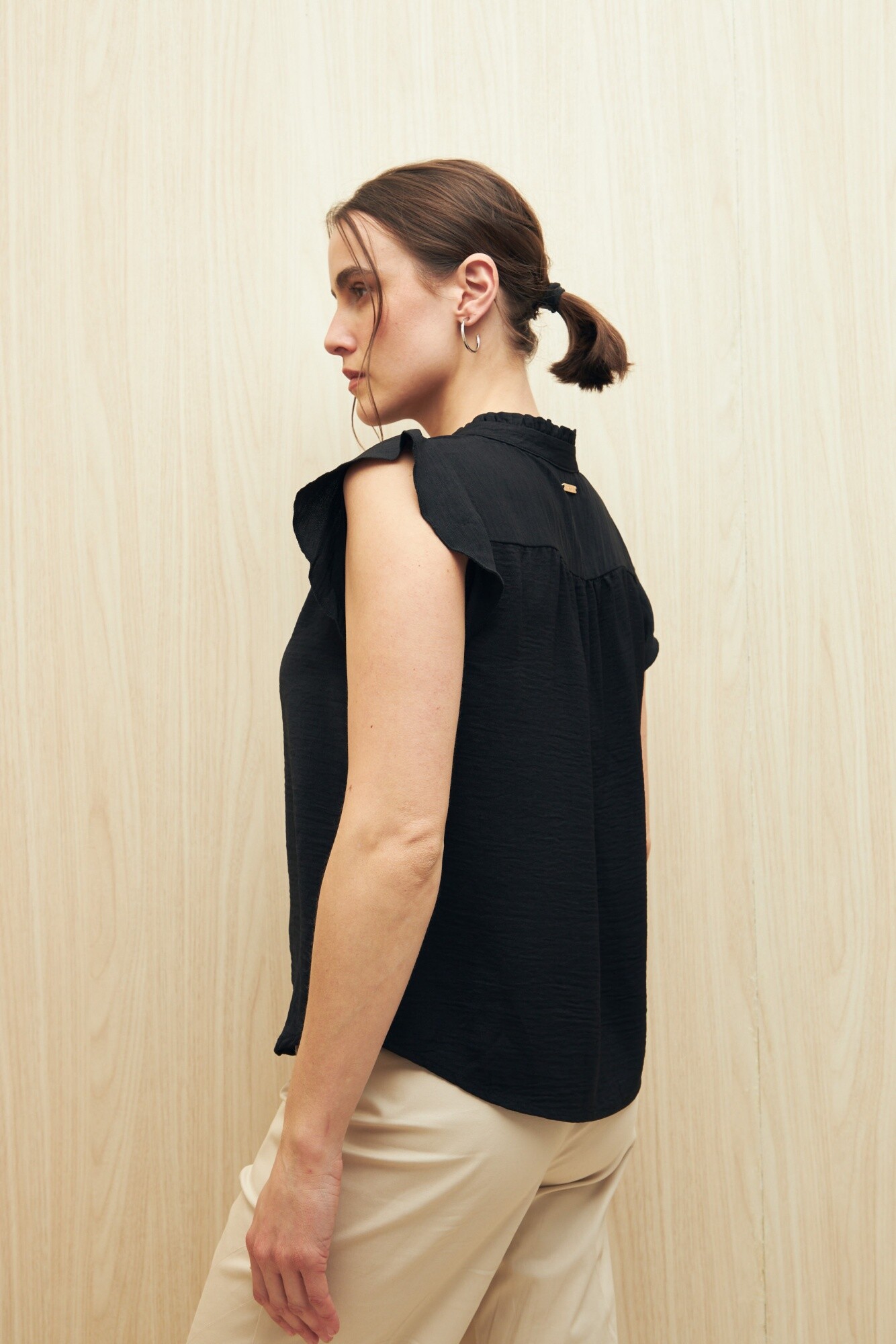 Blusa liviana con cuello Mao y sutil volado que le aporta un toque femenino al clásico estilo office. Con caída suave y textura delicada, es ideal para llevar dentro del pantalón o falda y acompañar looks de trabajo con un aire actual y relajado.
