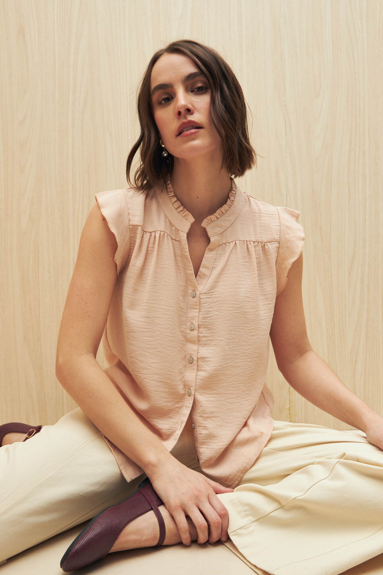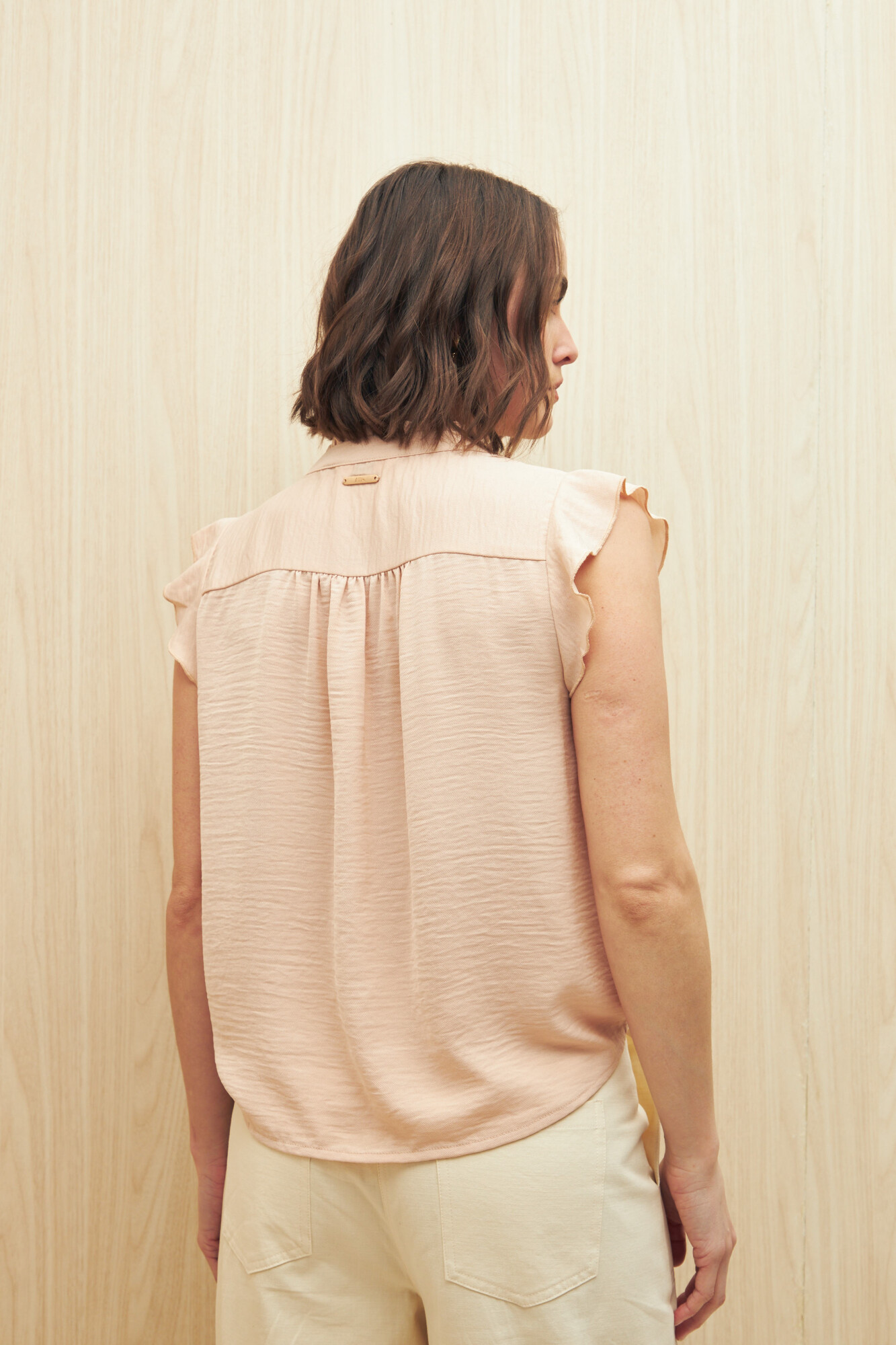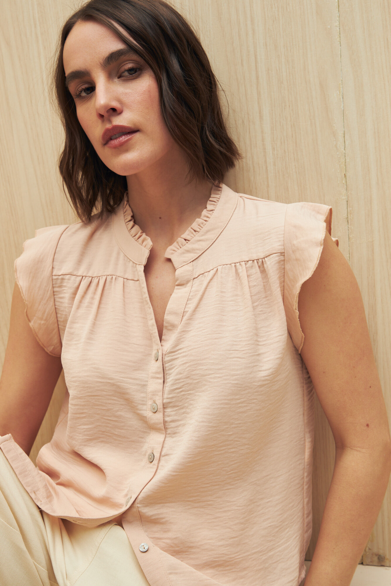 Blusa liviana con cuello Mao y sutil volado que le aporta un toque femenino al clásico estilo office. Con caída suave y textura delicada, es ideal para llevar dentro del pantalón o falda y acompañar looks de trabajo con un aire actual y relajado.