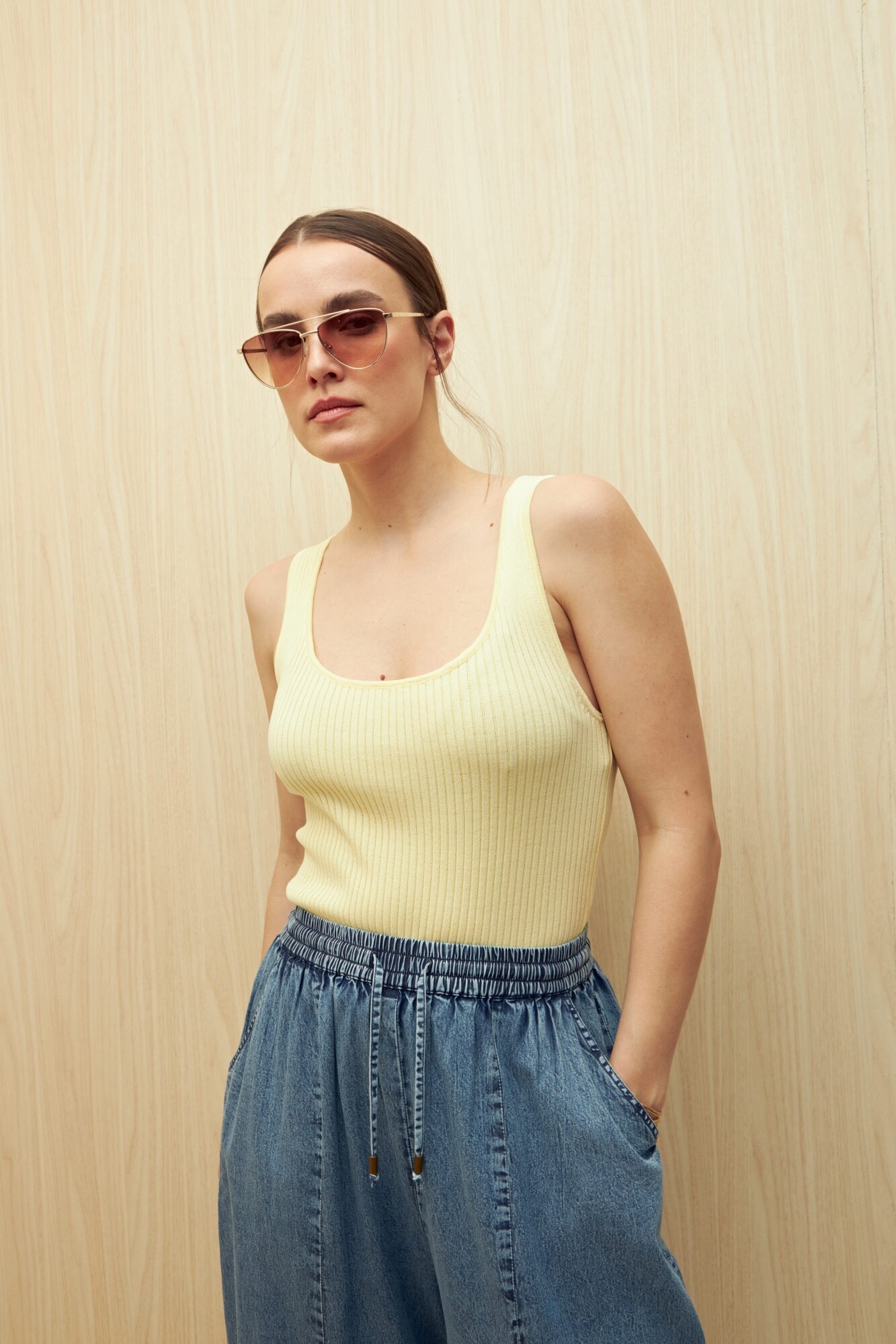 Top sin mangas de tejido acanalado con escote redondo y calce al cuerpo. Su textura elástica realza la figura con comodidad, convirtiéndolo en un básico infaltable del guardarropa. Ideal para combinar con prendas de denim, lino o sastreras livianas y lograr looks frescos y versátiles.