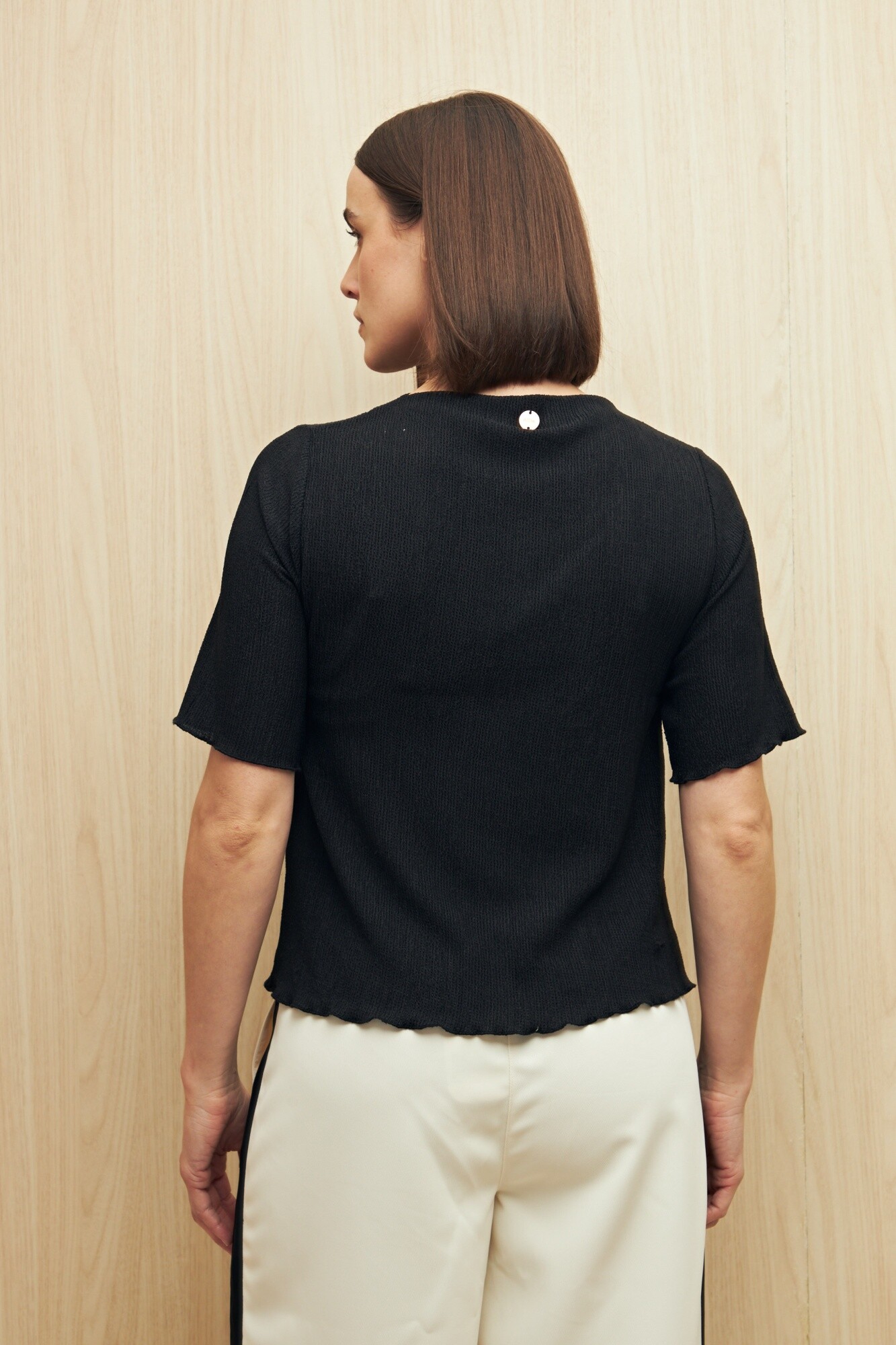 Top de textura acanalada con cuello semi alto y abertura lateral que estilizan la silueta. Su tejido con leve elasticidad lo hace cómodo y favorecedor, ideal para combinar con pantalones sastreros o faldas y lograr un look pulido tanto para la oficina como para un after.