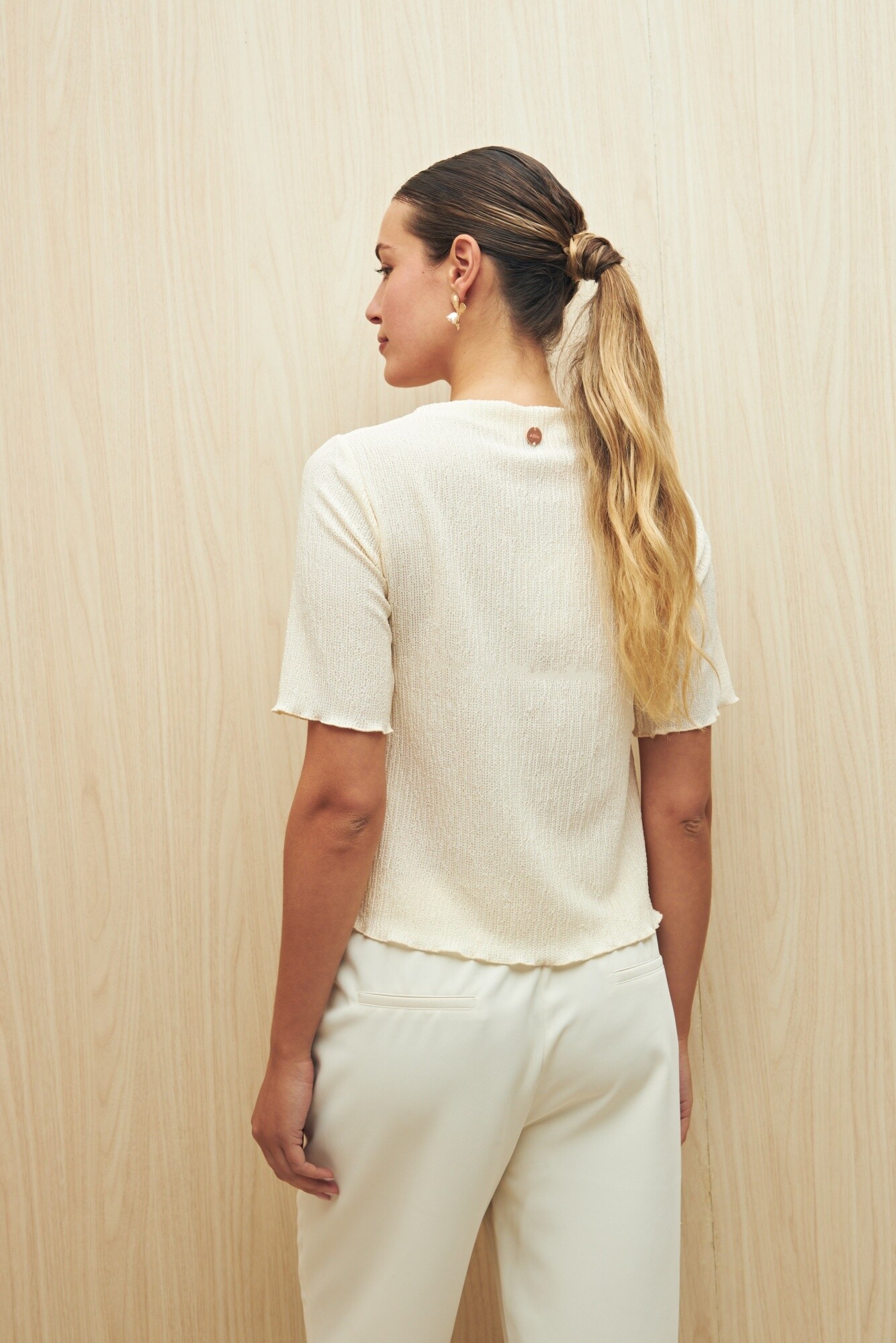 Top de textura acanalada con cuello semi alto y abertura lateral que estilizan la silueta. Su tejido con leve elasticidad lo hace cómodo y favorecedor, ideal para combinar con pantalones sastreros o faldas y lograr un look pulido tanto para la oficina como para un after.