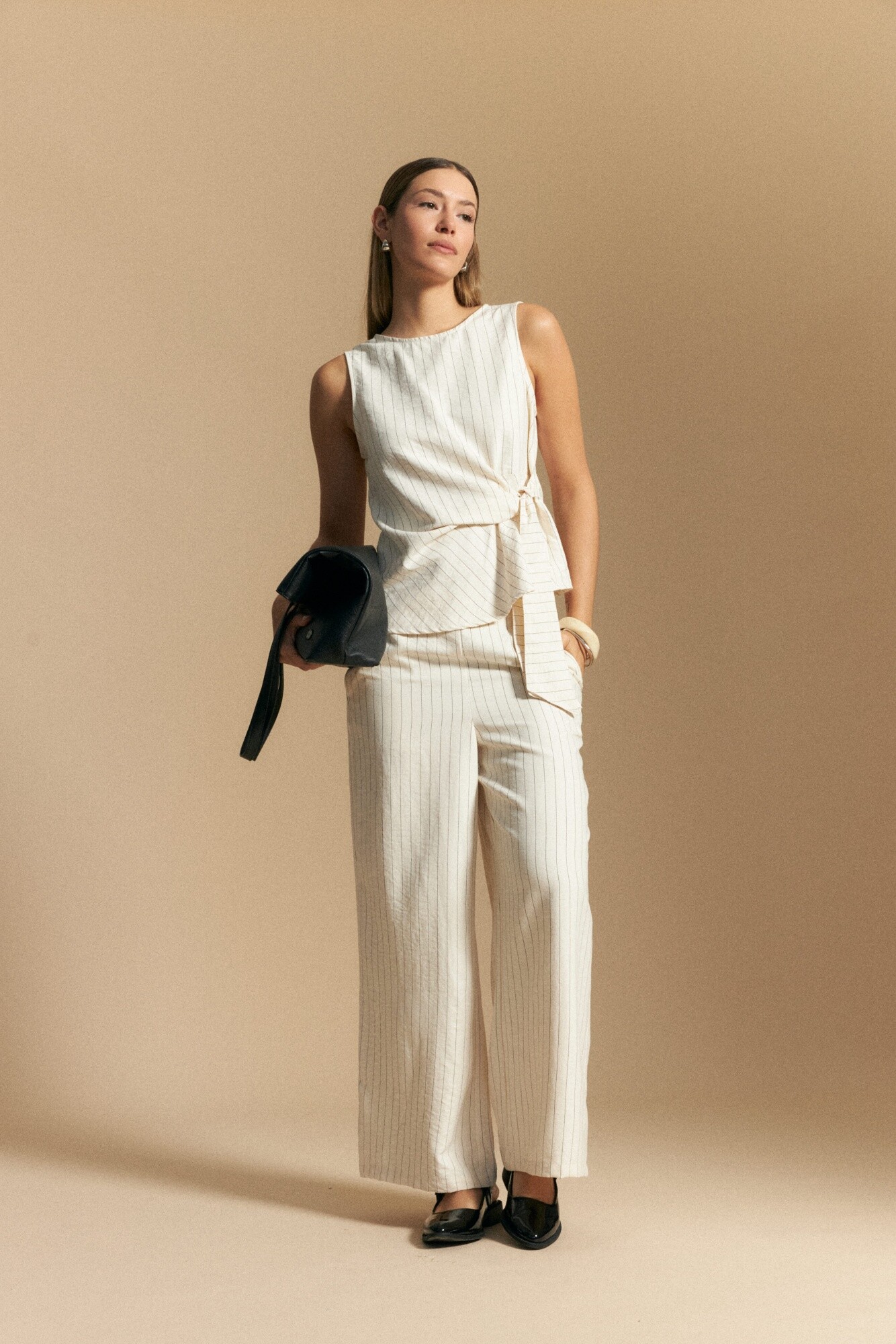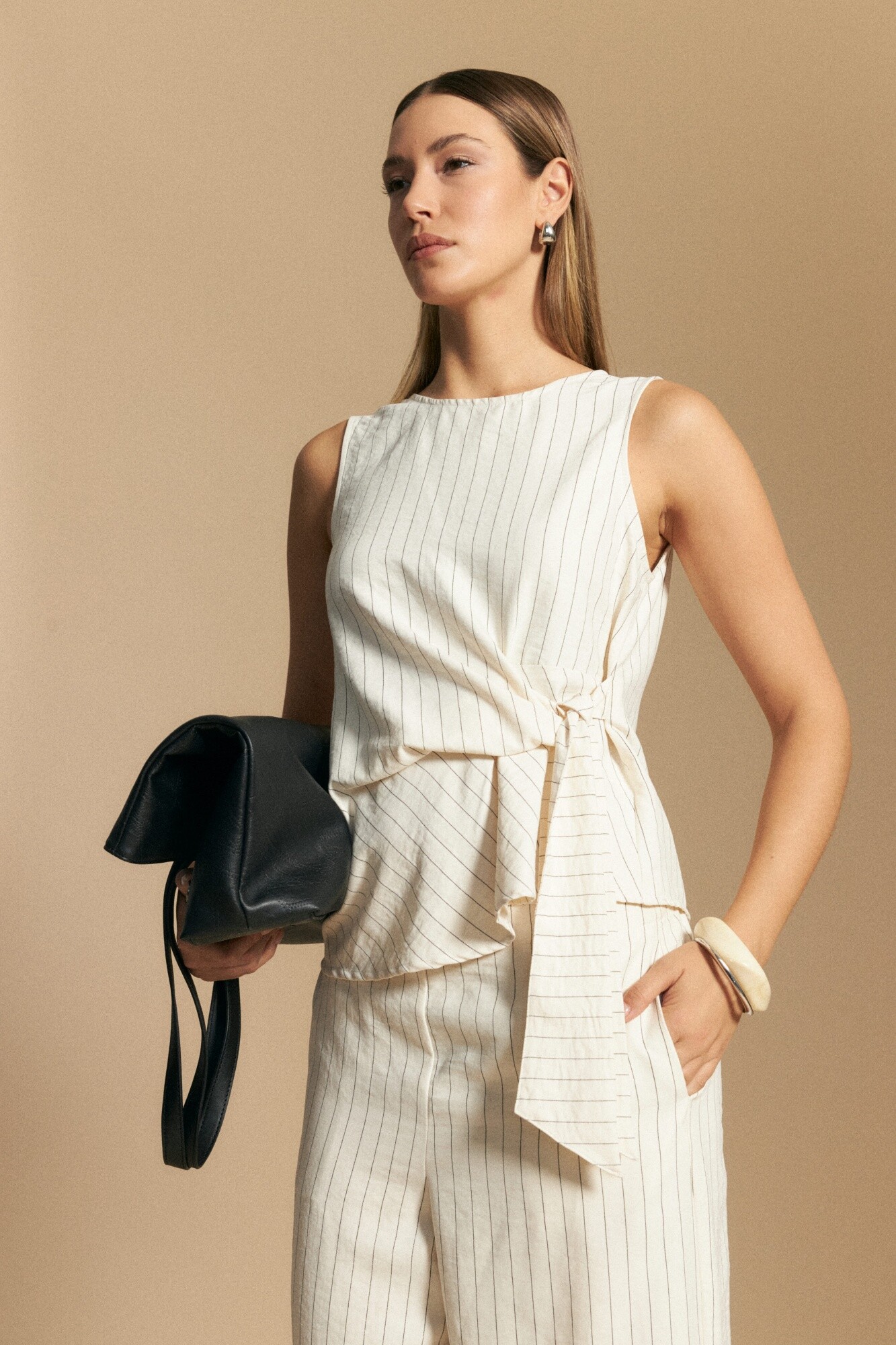Top sin mangas de diseño a rayas finas, con silueta recta y detalle de lazada lateral que aporta movimiento y un toque diferencial al diseño. El escote cerrado equilibra la prenda, mientras que el cruce lateral permite un calce favorecedor y adaptable. Ideal para usar solo o como parte de un conjunto, es una pieza versátil que suma estilo sin esfuerzo.