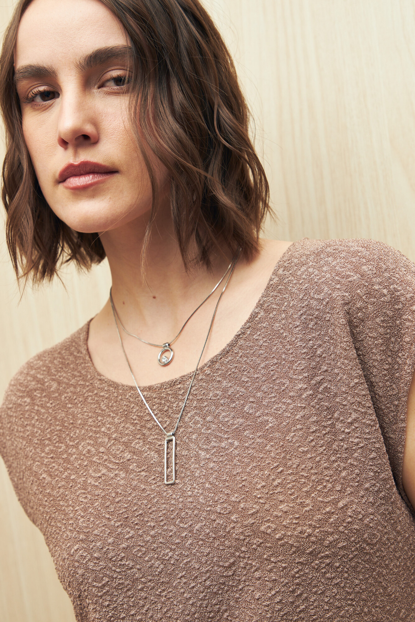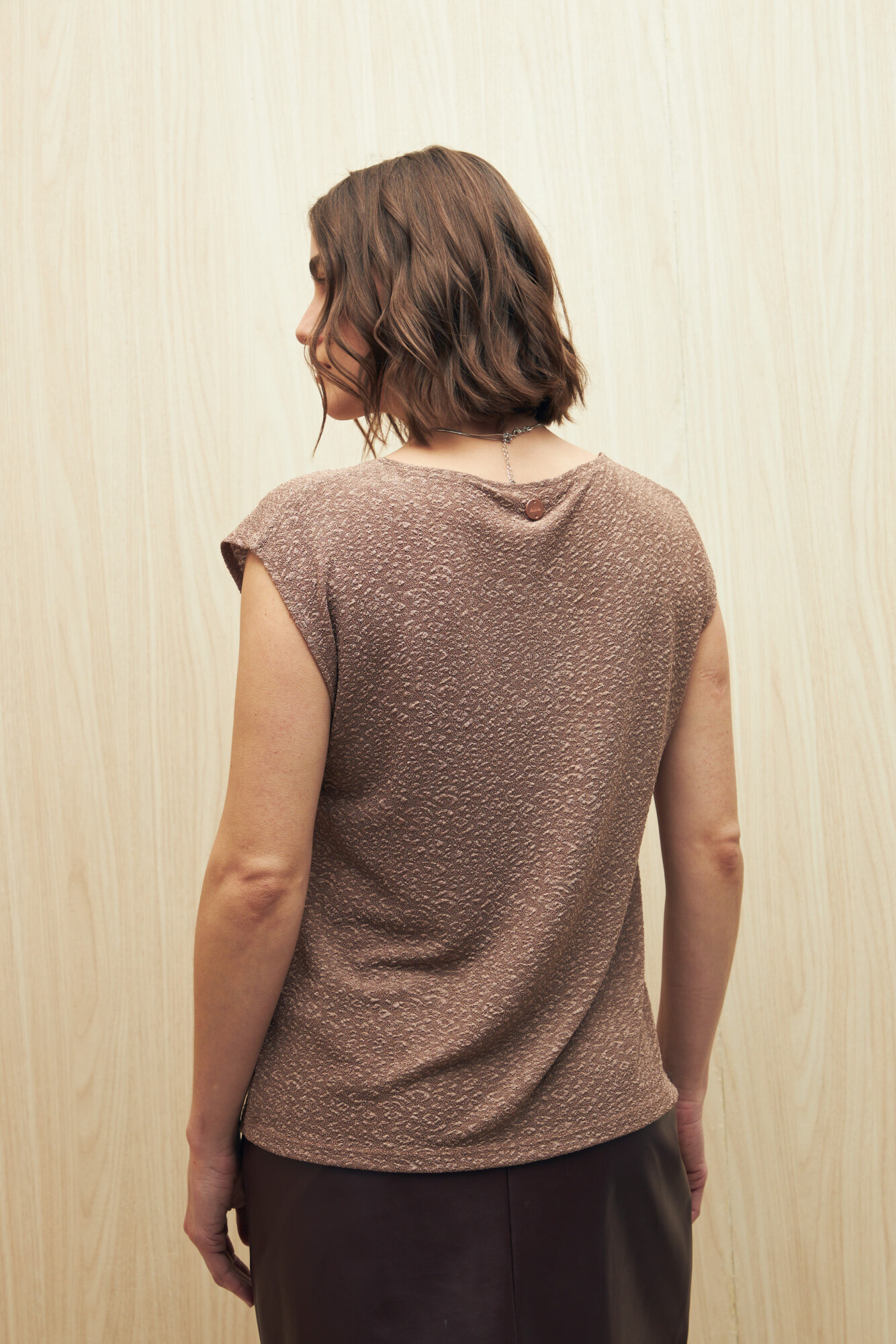 Top sin mangas con textura metalizada y leve acabado glitter. De silueta recta y cuello a la base, suma un toque de brillo con un aire moderno y relajado.