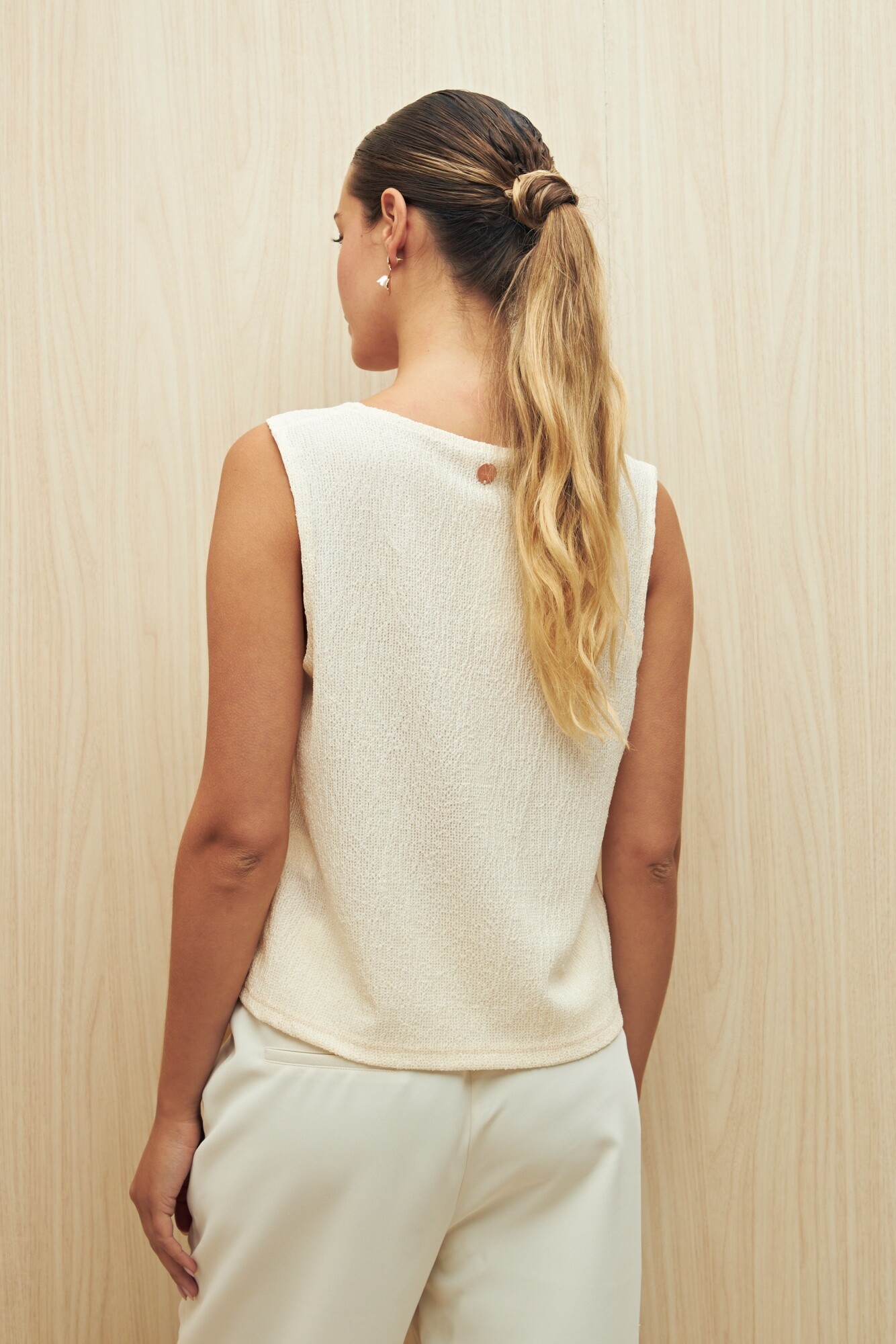 Top sin mangas con cuello a la base, confeccionado en un tejido texturizado que aporta carácter sin perder elegancia. Ideal para combinar con prendas de distintos estilos y elevar tus looks del día a la noche.