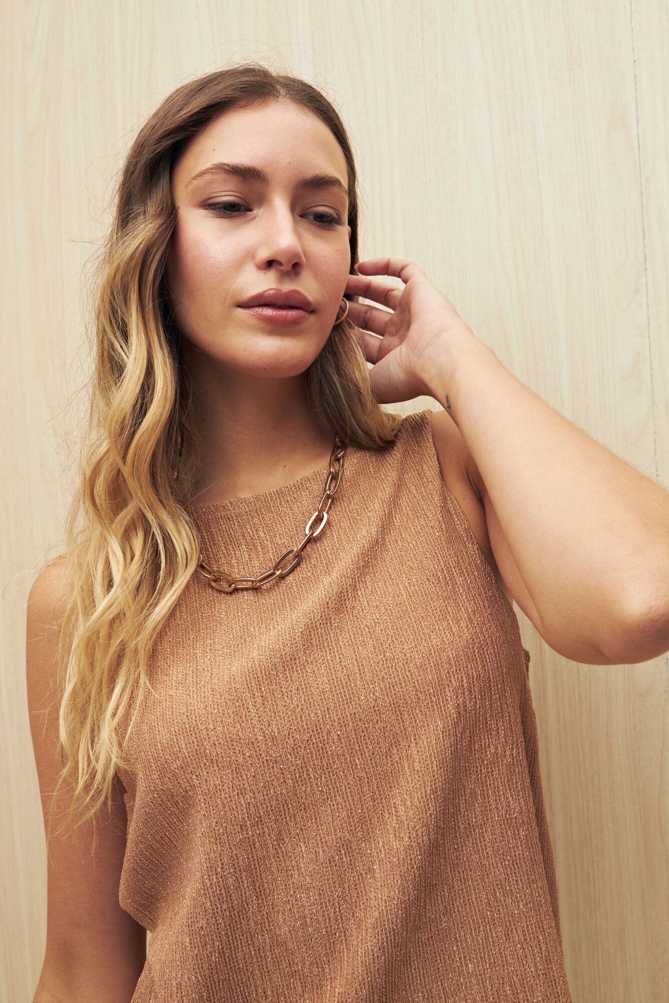 Top sin mangas con cuello a la base, confeccionado en un tejido texturizado que aporta carácter sin perder elegancia. Ideal para combinar con prendas de distintos estilos y elevar tus looks del día a la noche.