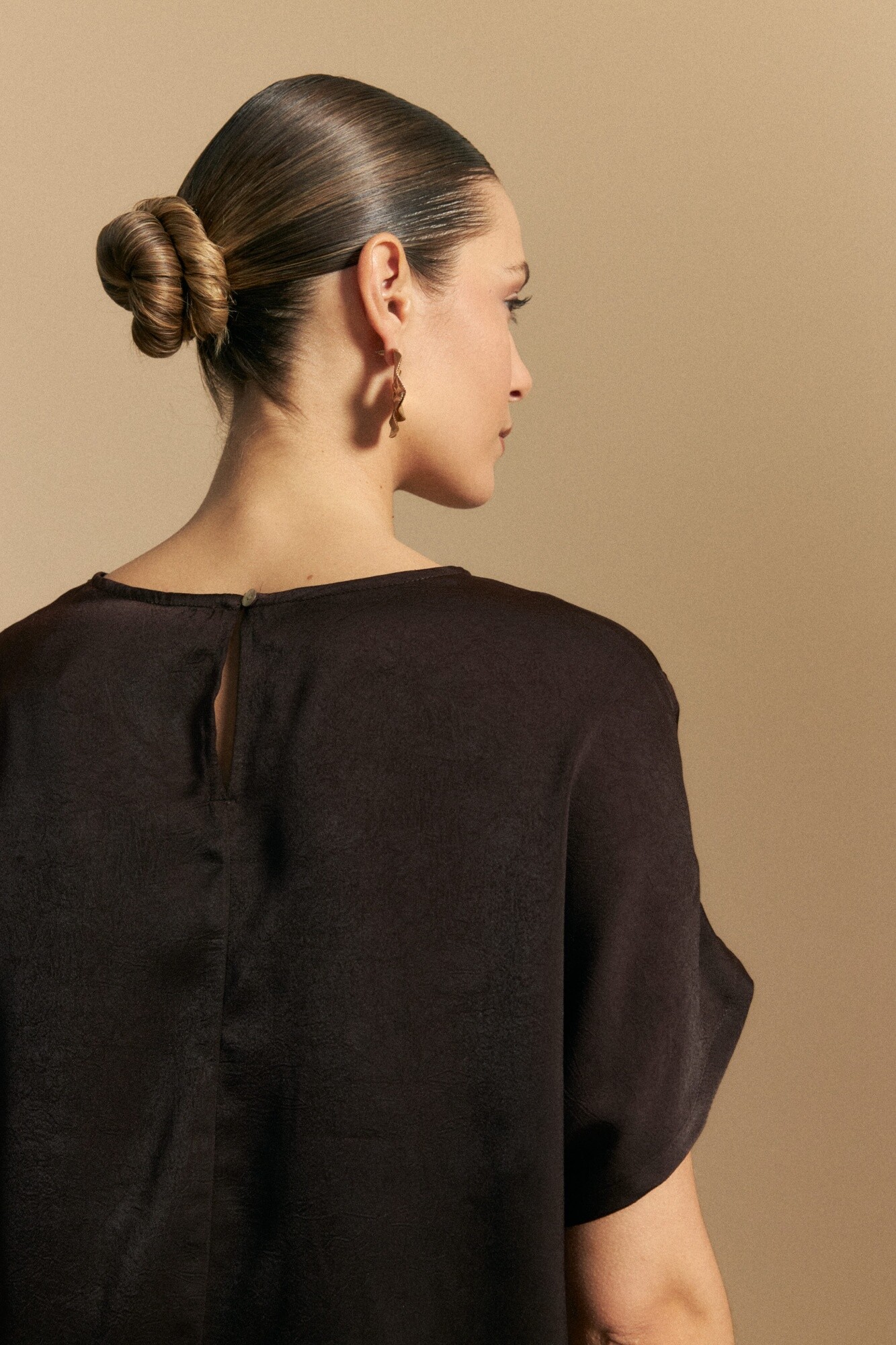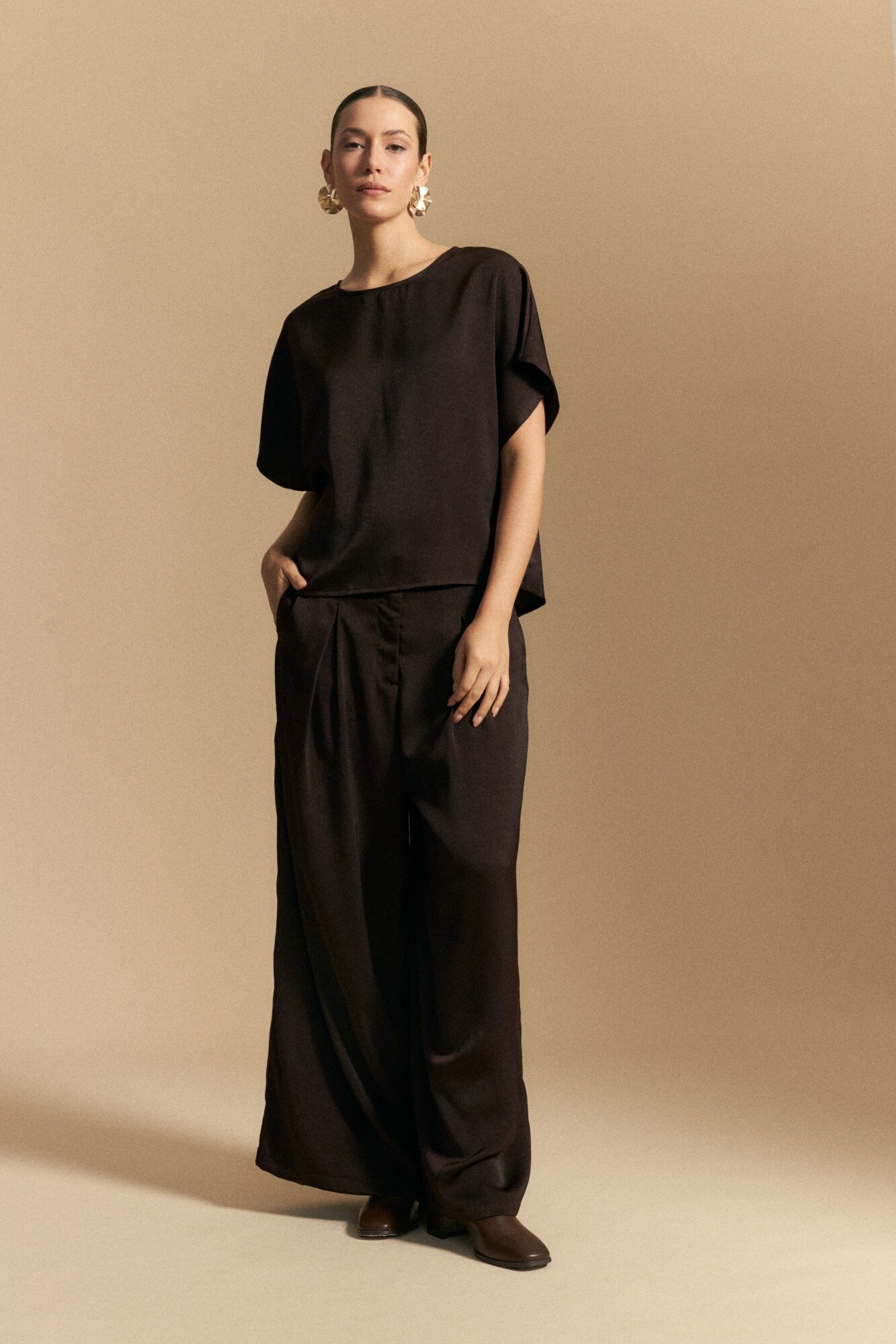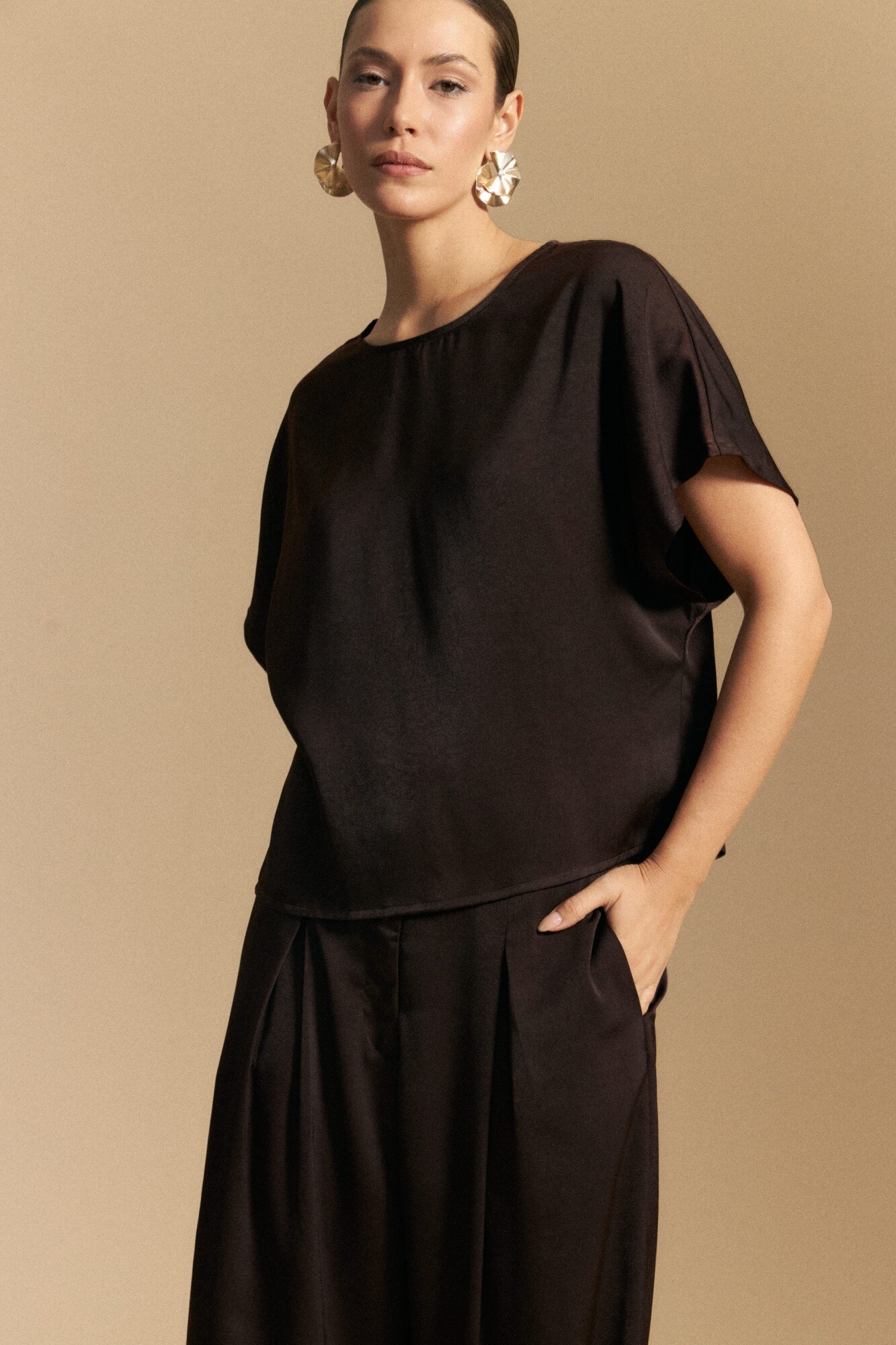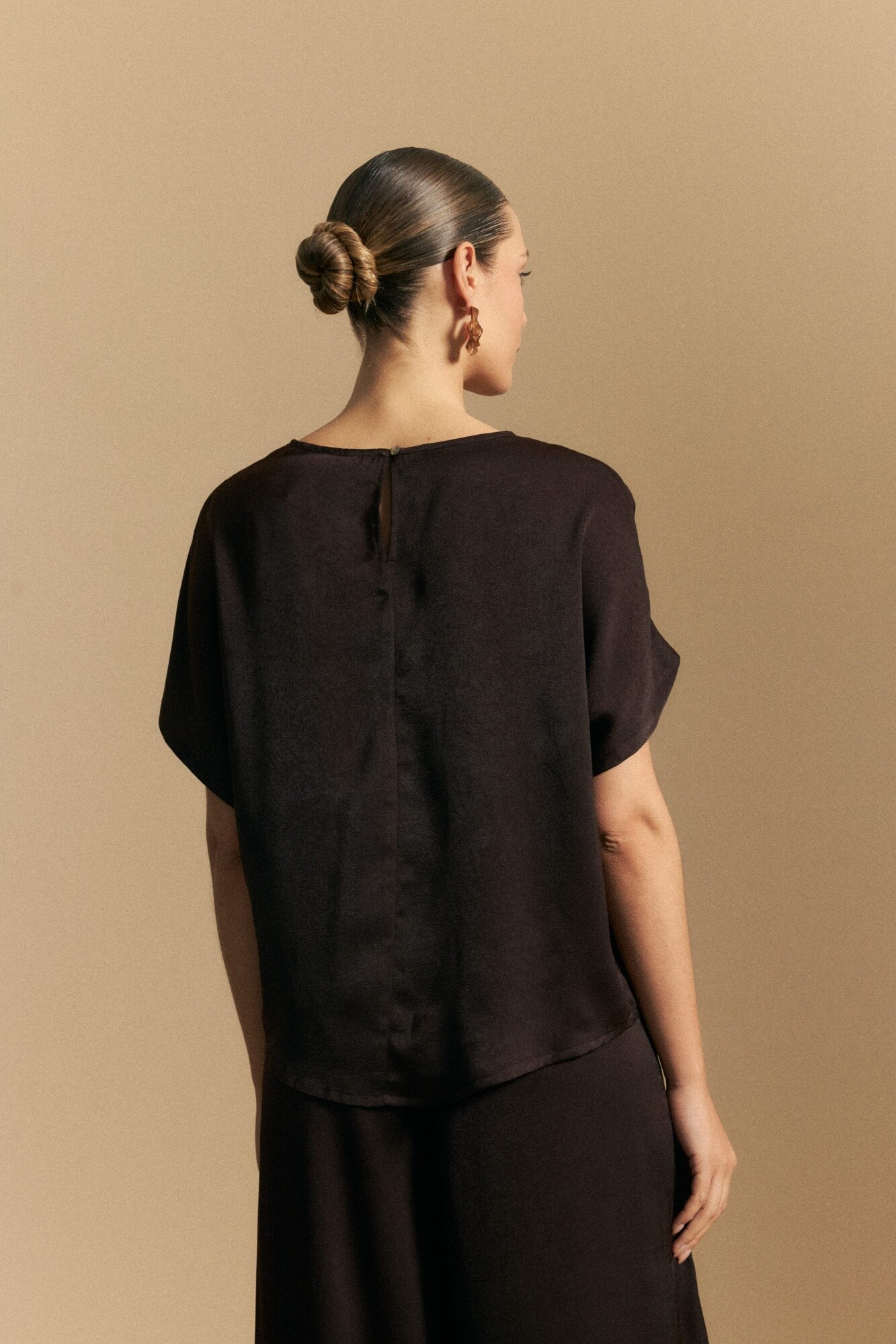 Top de manga corta de silueta amplia y caída fluida, confeccionado en un tejido liviano con leve brillo que aporta sofisticación. Presenta detalle de botón de nácar en la espalda con pequeña abertura, sumando un acabado delicado y femenino. Sus mangas amplias tipo kimono refuerzan la sensación de movimiento, convirtiéndolo en una prenda ideal para estilismos elegantes de día o para elevar un look de noche con naturalidad.