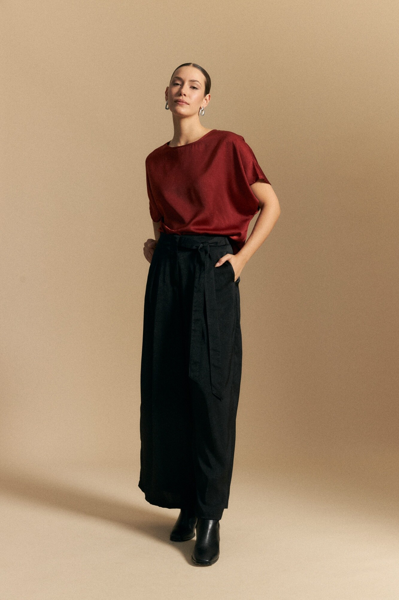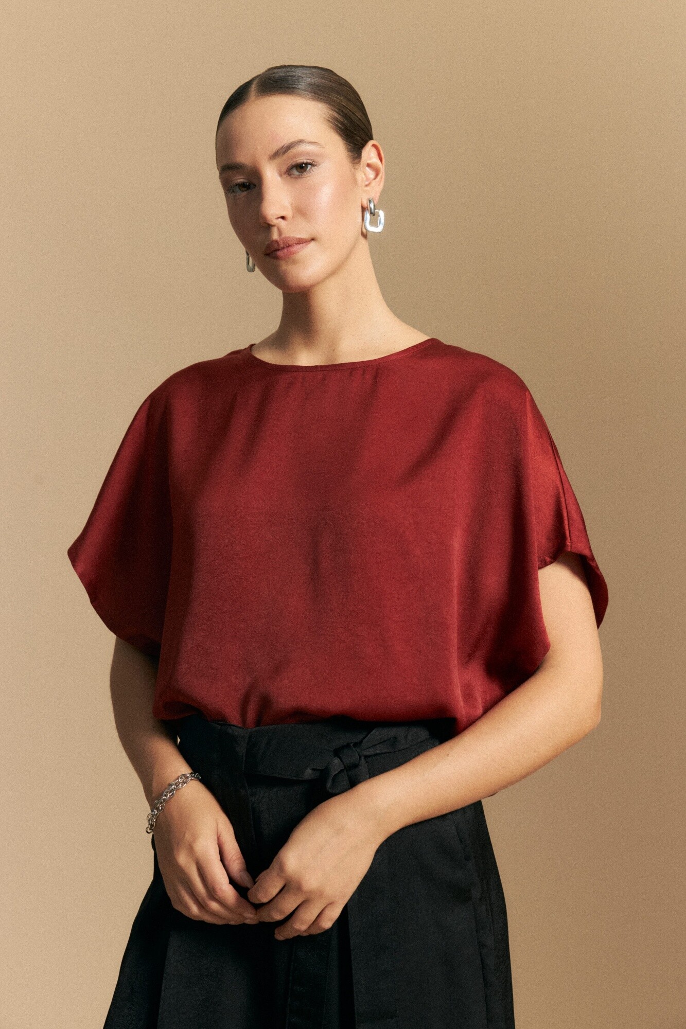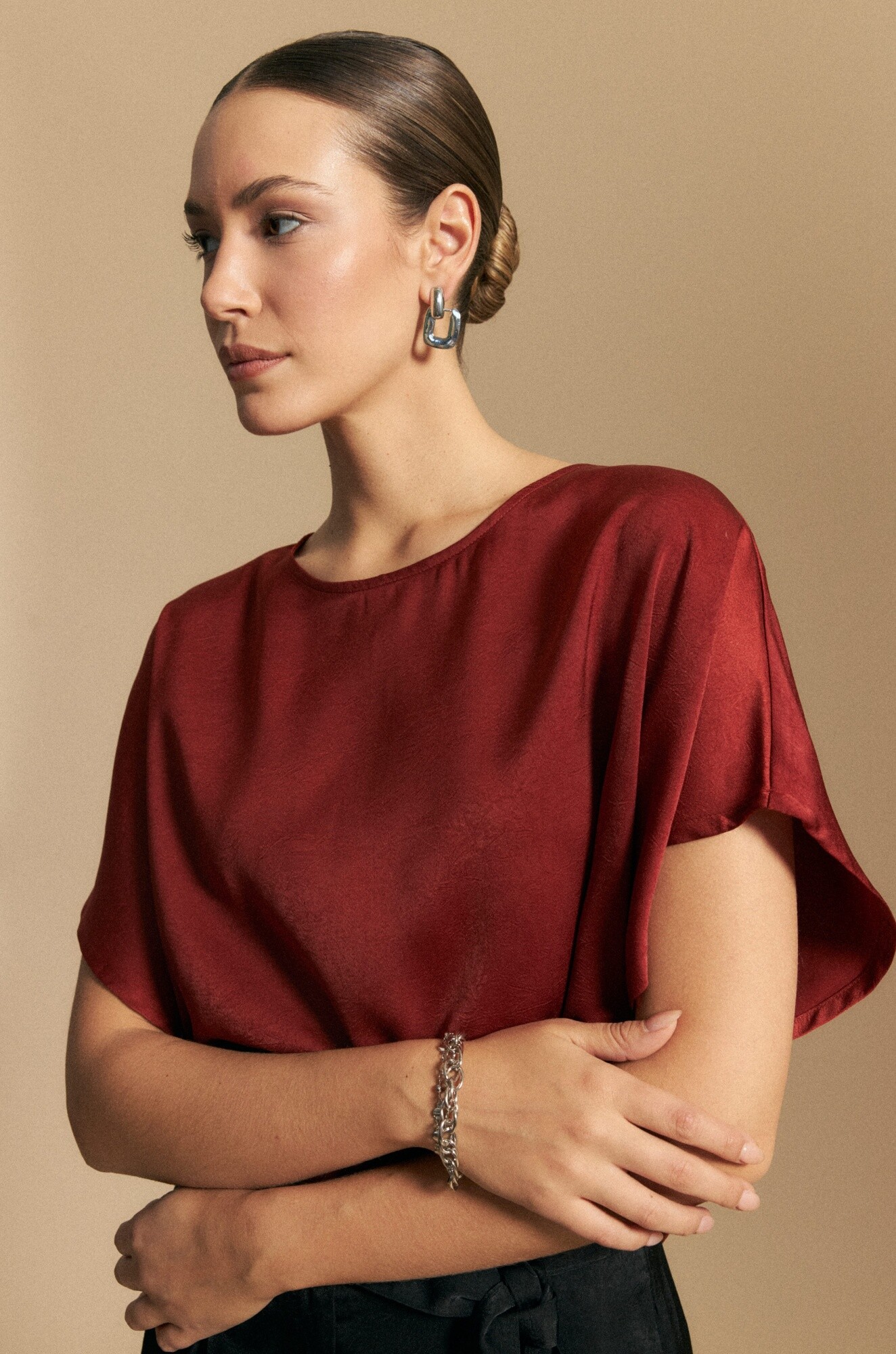 Top de manga corta de silueta amplia y caída fluida, confeccionado en un tejido liviano con leve brillo que aporta sofisticación. Presenta detalle de botón de nácar en la espalda con pequeña abertura, sumando un acabado delicado y femenino. Sus mangas amplias tipo kimono refuerzan la sensación de movimiento, convirtiéndolo en una prenda ideal para estilismos elegantes de día o para elevar un look de noche con naturalidad.