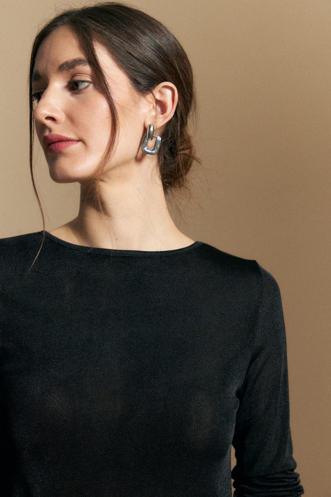 Top de manga larga de silueta al cuerpo y textura suave con leve brillo que realza la caída del tejido. Presenta tajos laterales que aportan movimiento y un detalle moderno, además de terminaciones delicadamente onduladas en el ruedo. Su diseño limpio y versátil lo convierte en una opción ideal tanto para looks de noche como para estilismos más sofisticados de día. Un básico actualizado que suma elegancia sin esfuerzo.