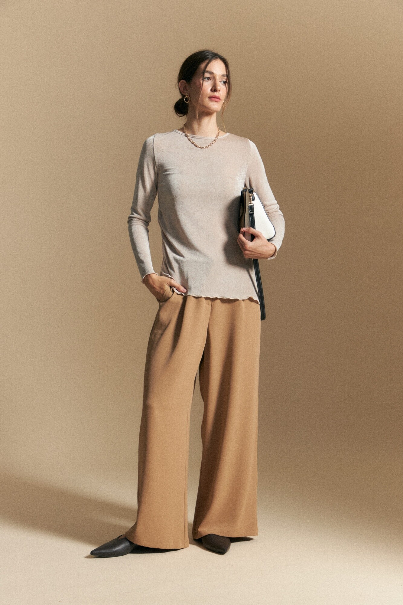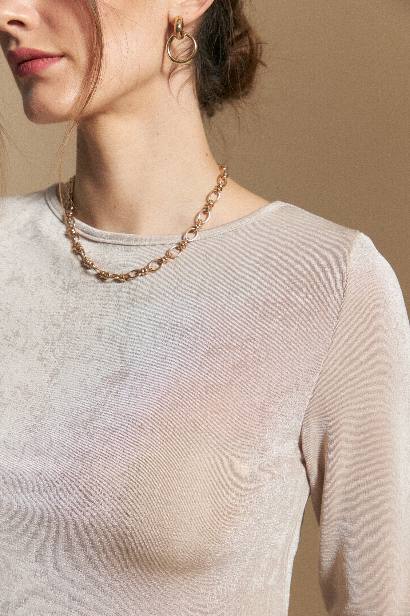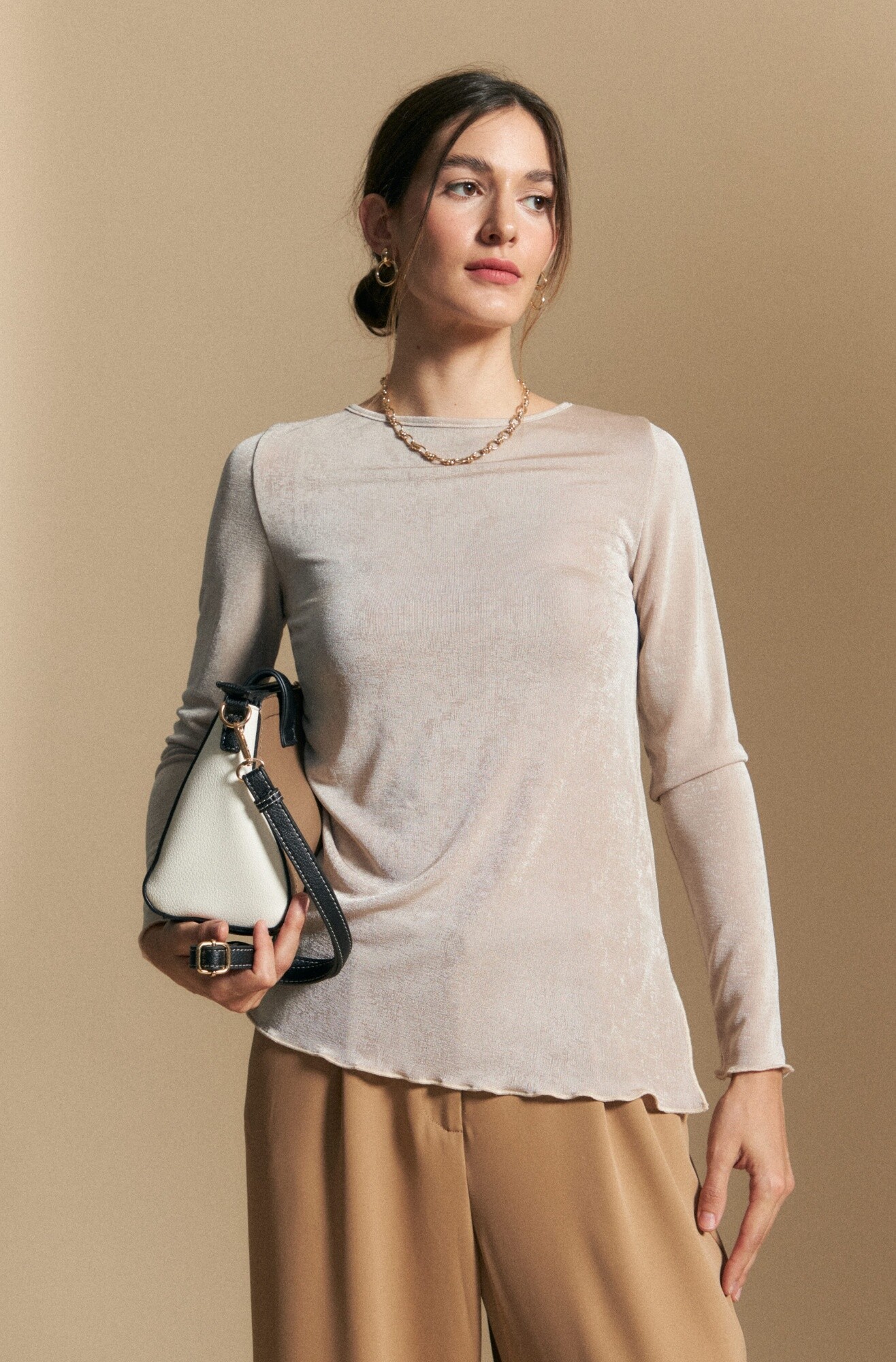 Top de manga larga de silueta al cuerpo y textura suave con leve brillo que realza la caída del tejido. Presenta tajos laterales que aportan movimiento y un detalle moderno, además de terminaciones delicadamente onduladas en el ruedo. Su diseño limpio y versátil lo convierte en una opción ideal tanto para looks de noche como para estilismos más sofisticados de día. Un básico actualizado que suma elegancia sin esfuerzo.