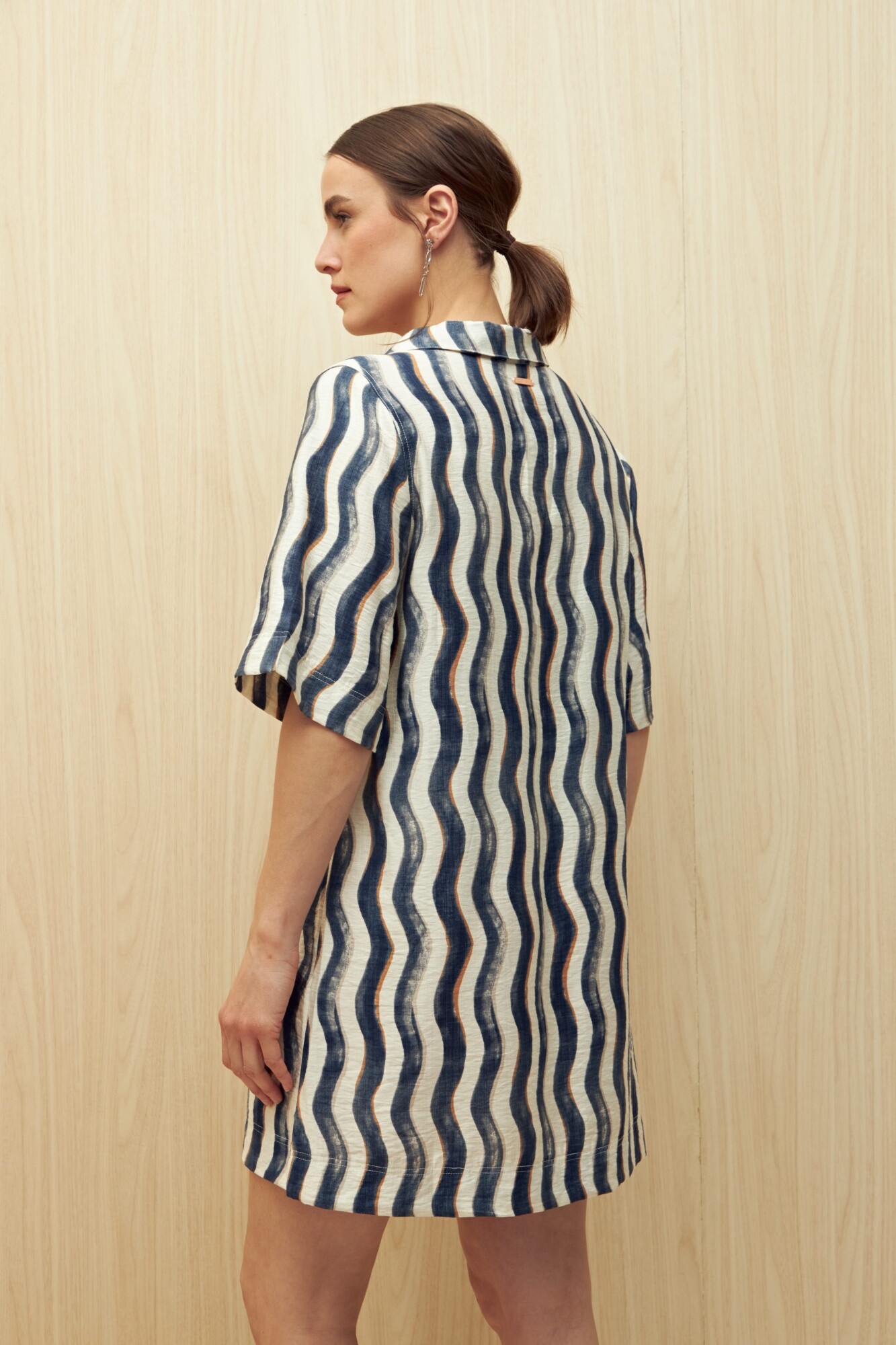 Vestido corto con cuello tipo solapa y escote en V, confeccionado en un tejido liviano y con textura suave. Su diseño de mangas 3/4 y silueta amplia lo hacen ideal para un look relajado, cómodo y con movimiento.