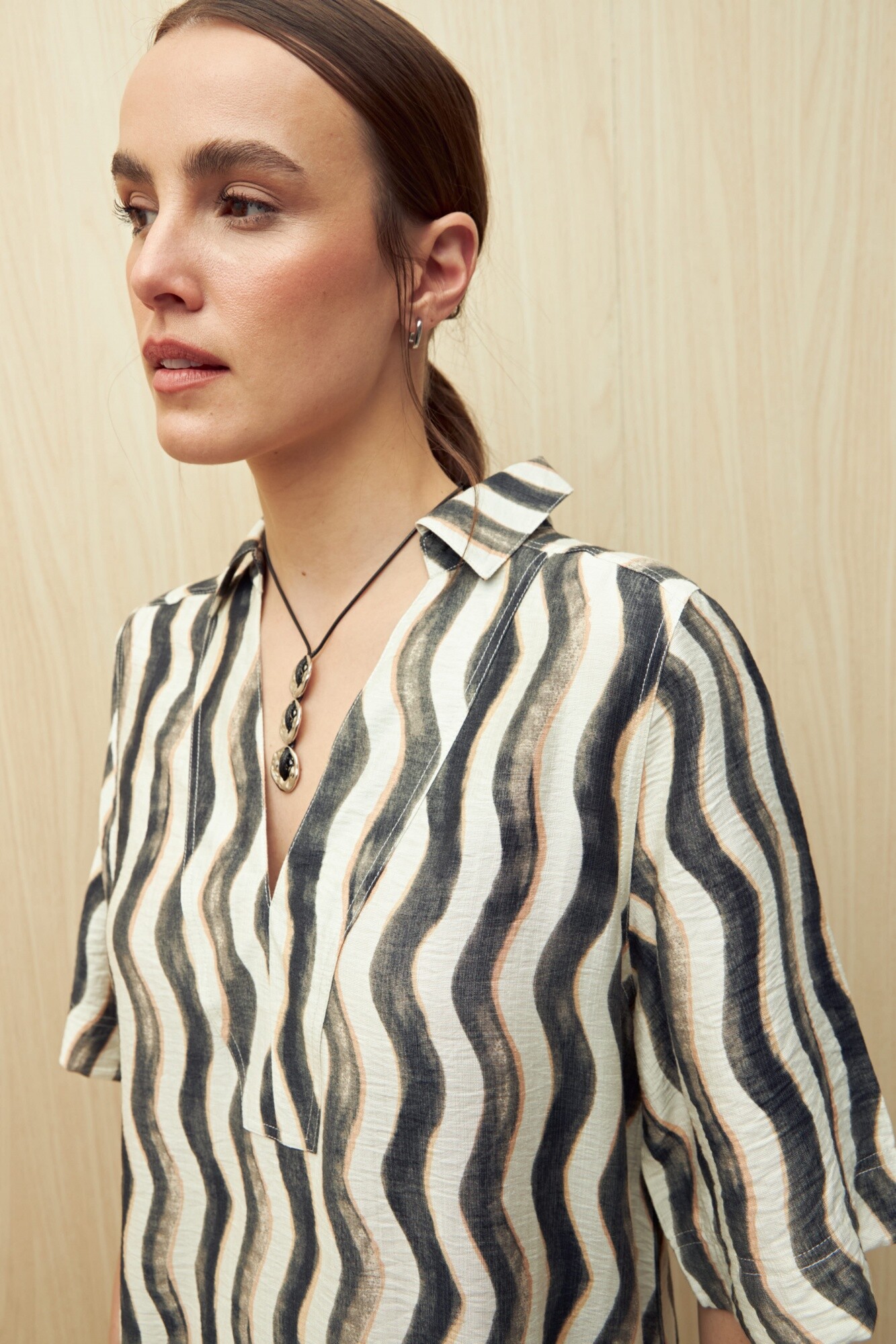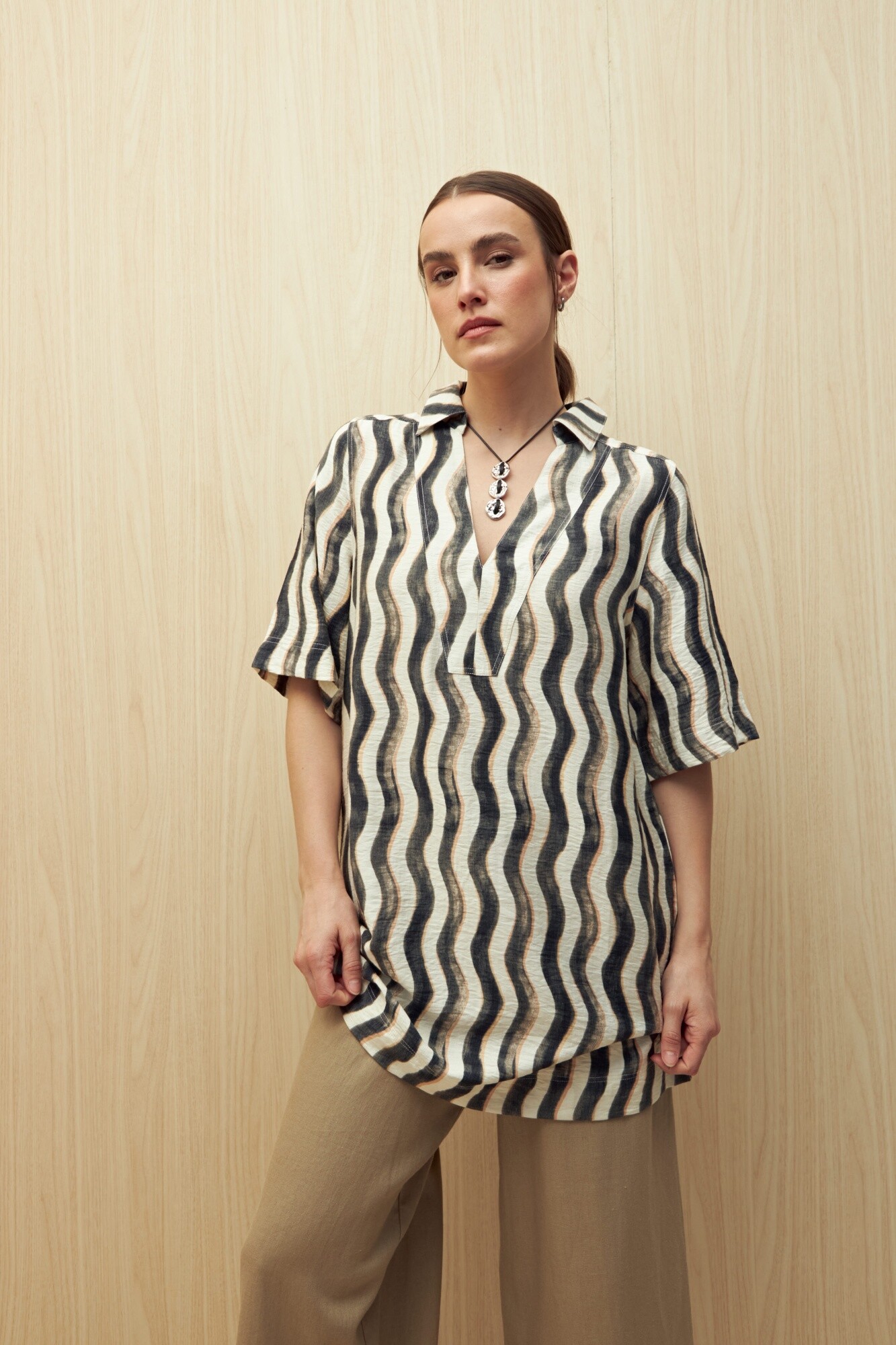 Vestido corto con cuello tipo solapa y escote en V, confeccionado en un tejido liviano y con textura suave. Su diseño de mangas 3/4 y silueta amplia lo hacen ideal para un look relajado, cómodo y con movimiento.