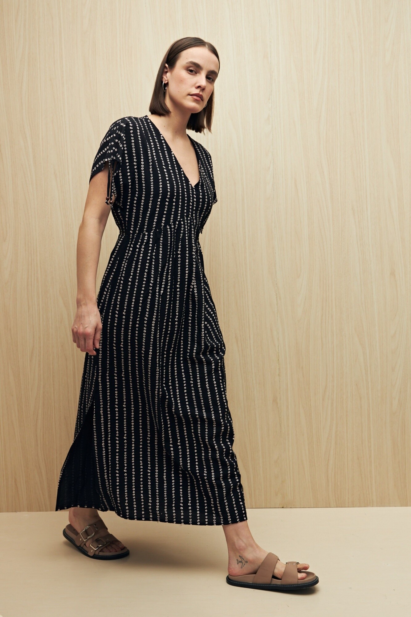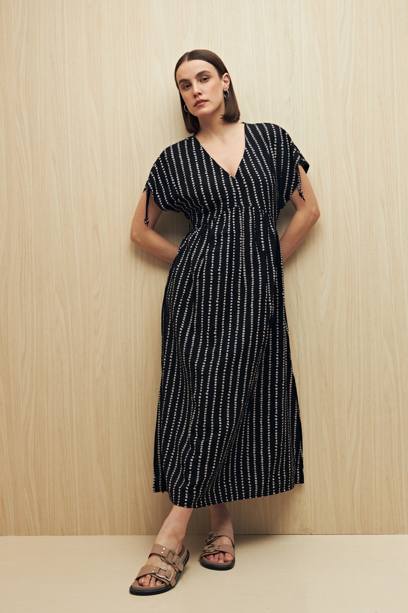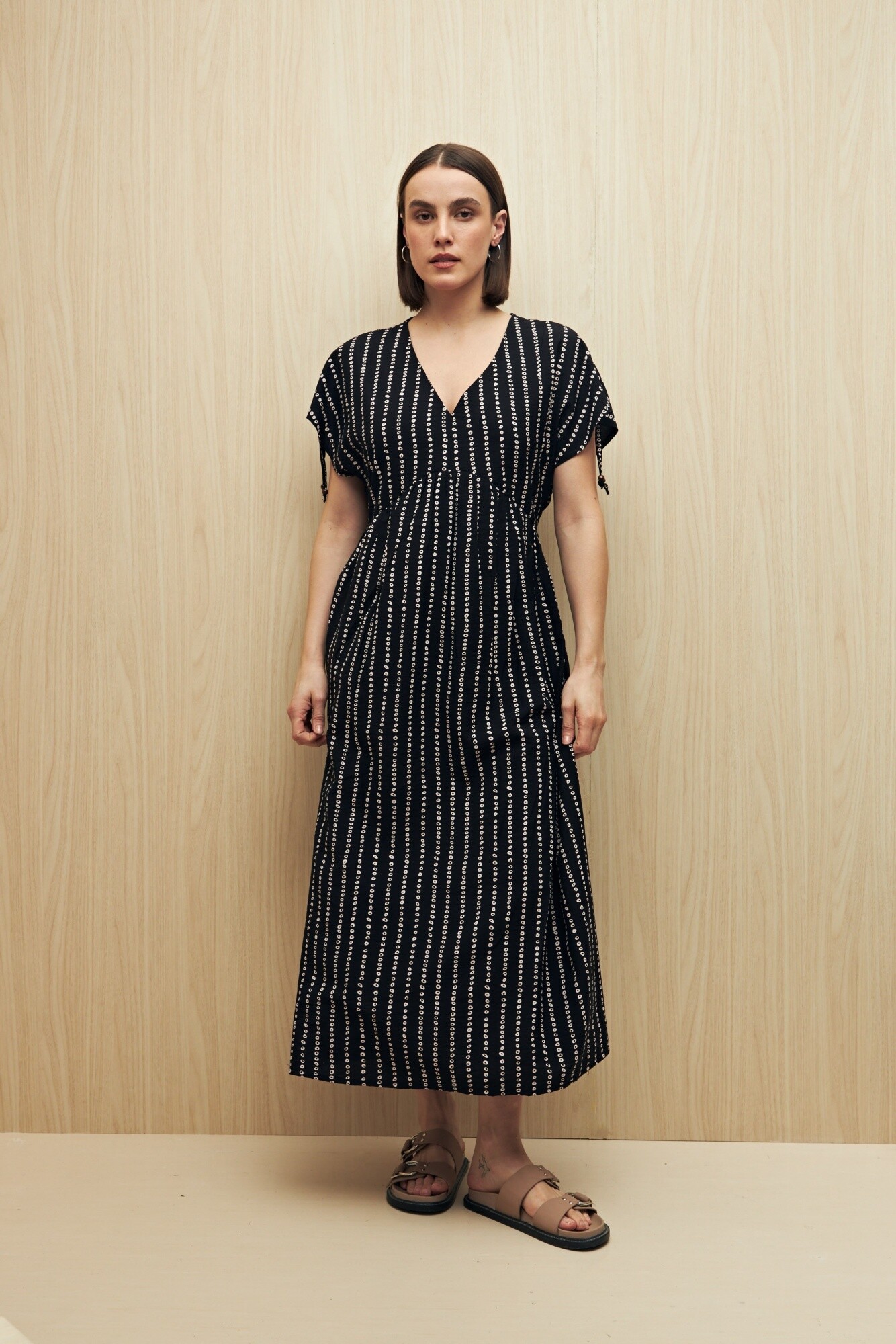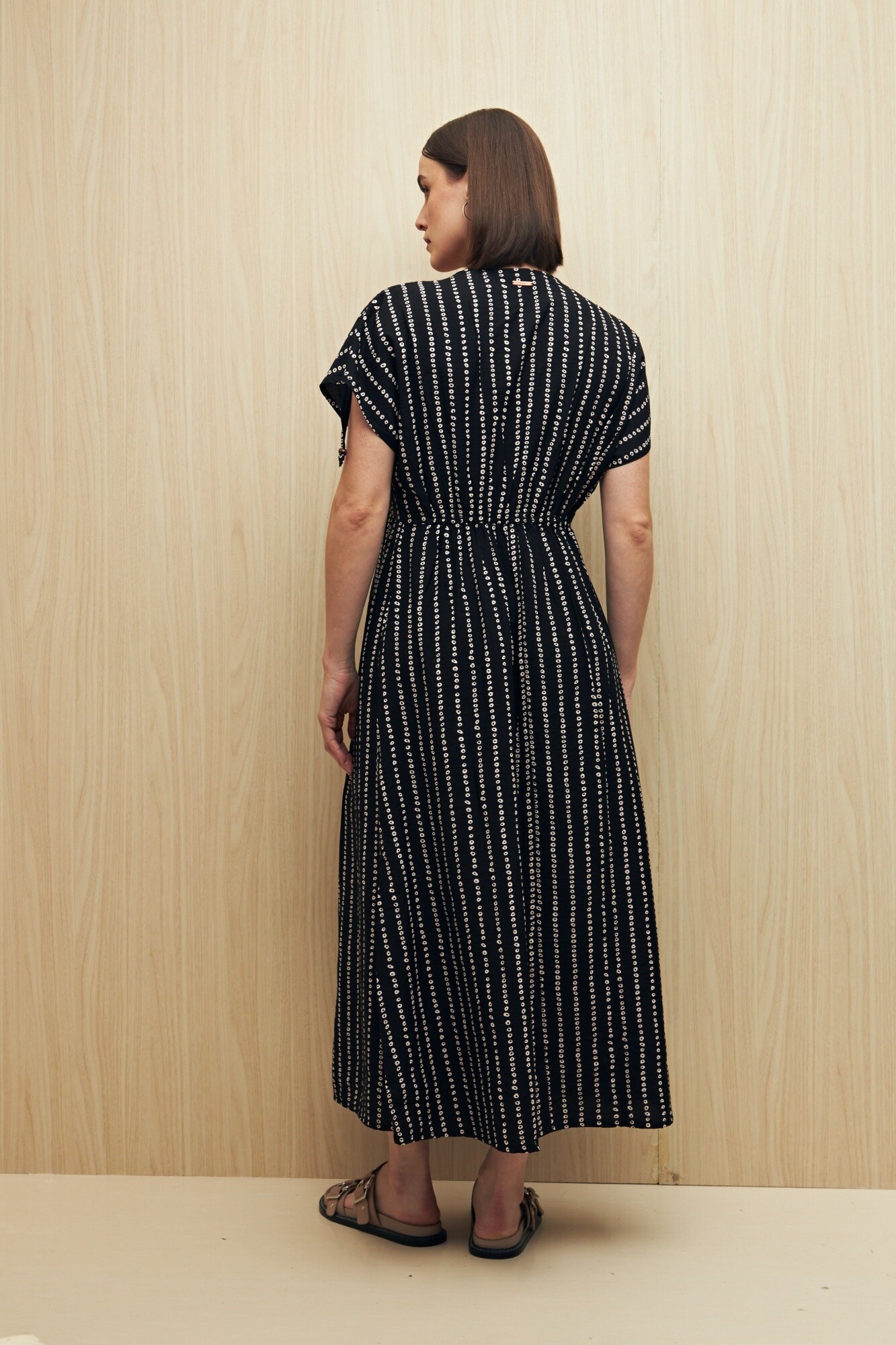 Vestido largo con escote en V y mangas cortas con lazo regulable que permite ajustar el frunce. Con un fit fluido y favorecedor, destaca por su caída liviana y movimiento natural. Perfecto para looks relajados con un toque bohemio.