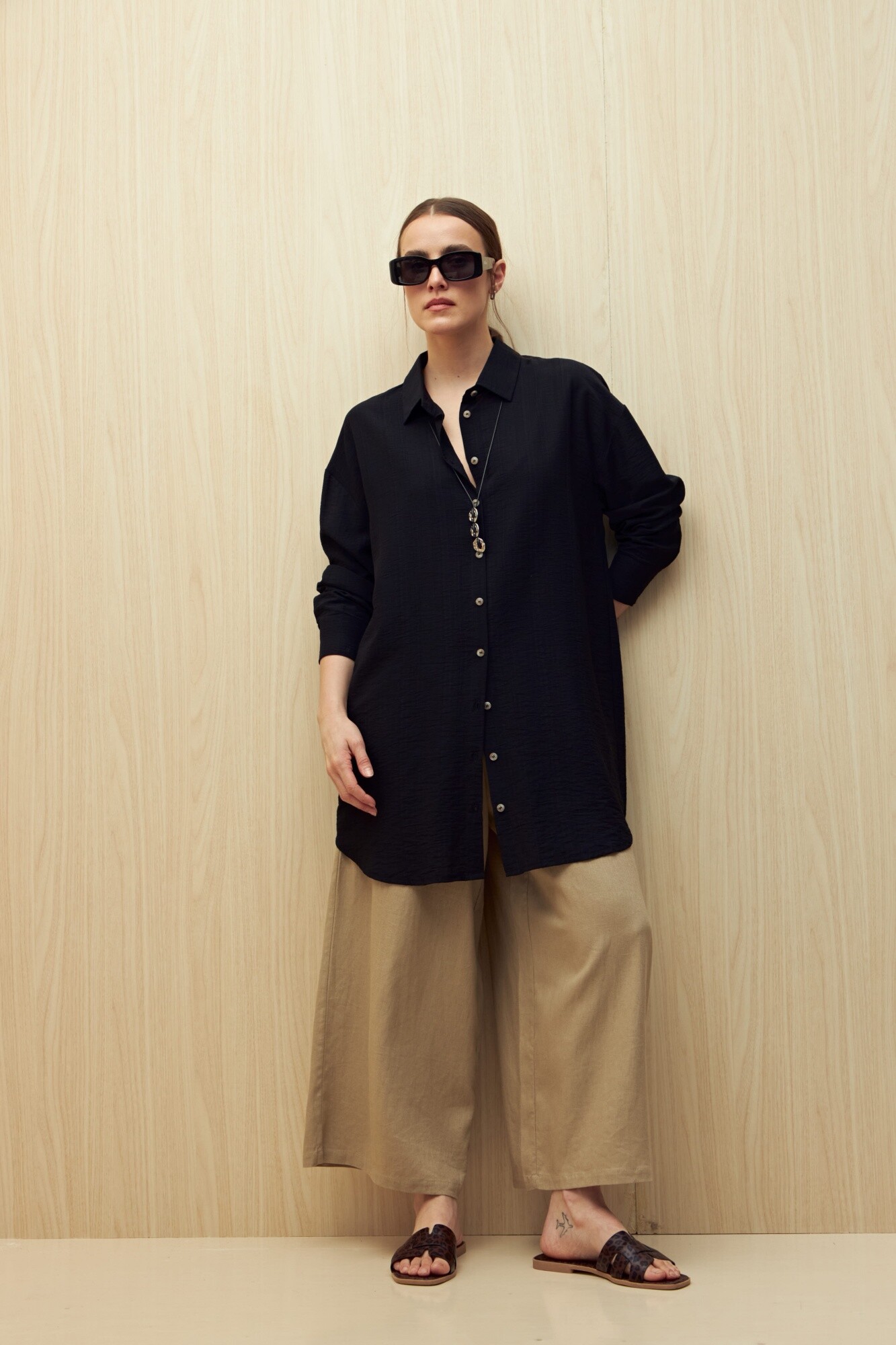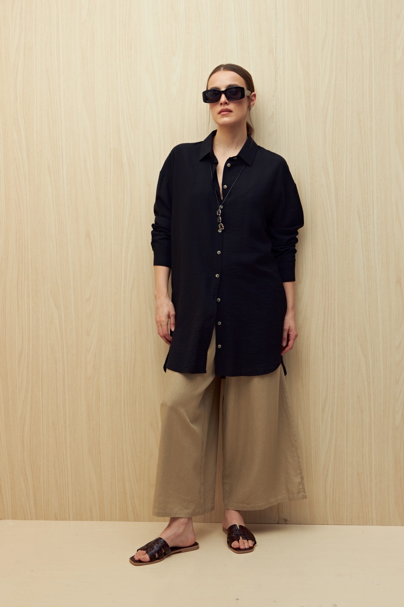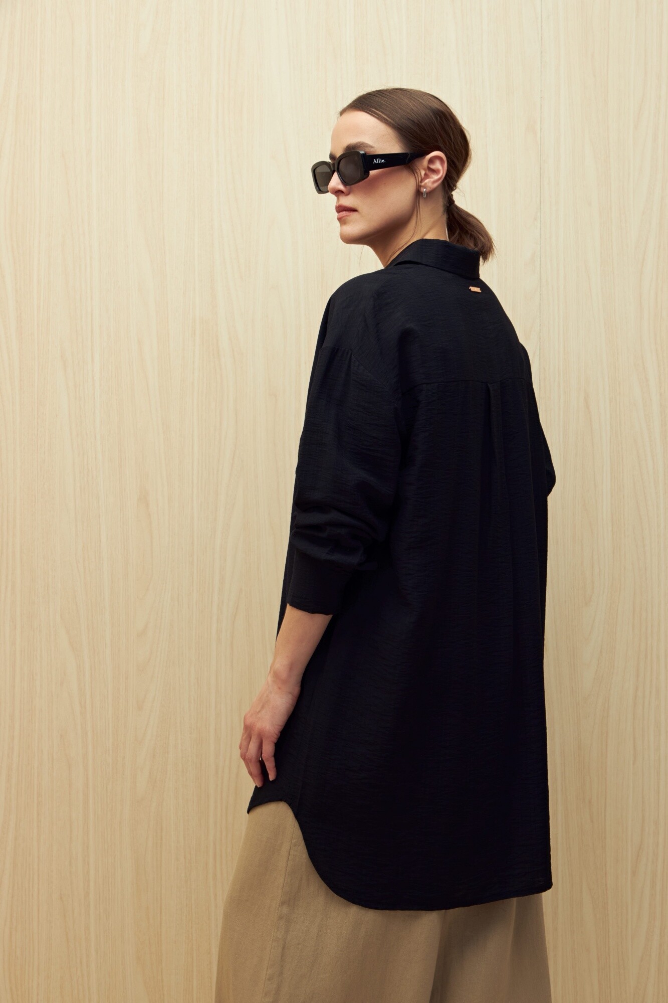 Vestido camisero de silueta amplia que combina la elegancia clásica de la camisa con una impronta relajada y actual. Su calce holgado, el cuello camisero y la botonadura frontal completa lo convierten en una pieza versátil que se adapta a distintos estilos y ocasiones.