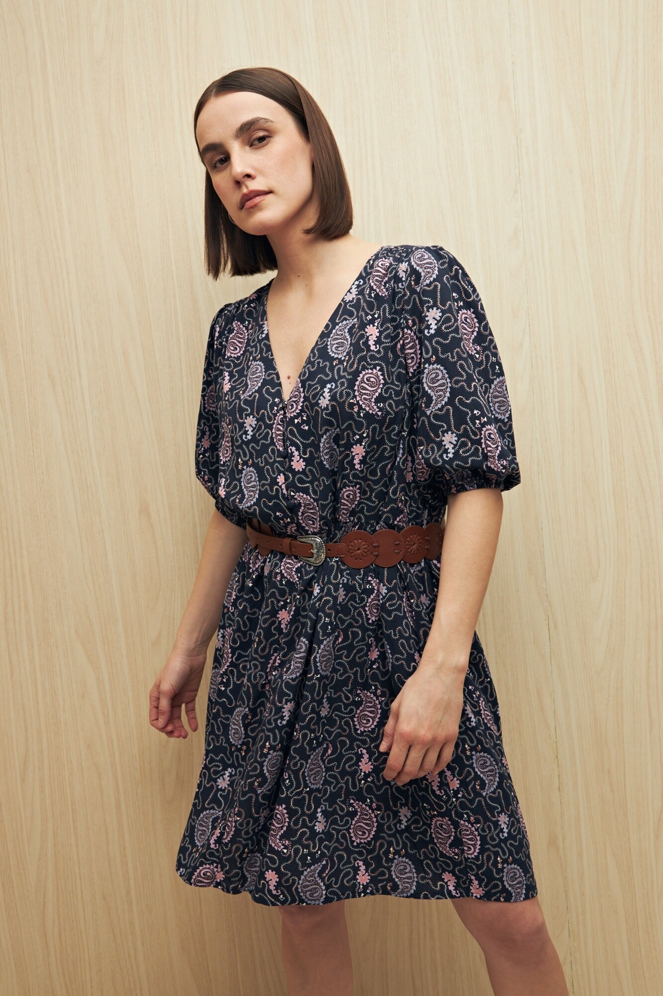 Vestido corto con escote en V y manga abullonada con puño elastizado. El corte en la cintura realza la silueta y da paso a una falda con vuelo suave, logrando una prenda femenina y cómoda. Su tejido liviano de viscosa aporta movimiento y frescura, ideal para el día o la tarde.