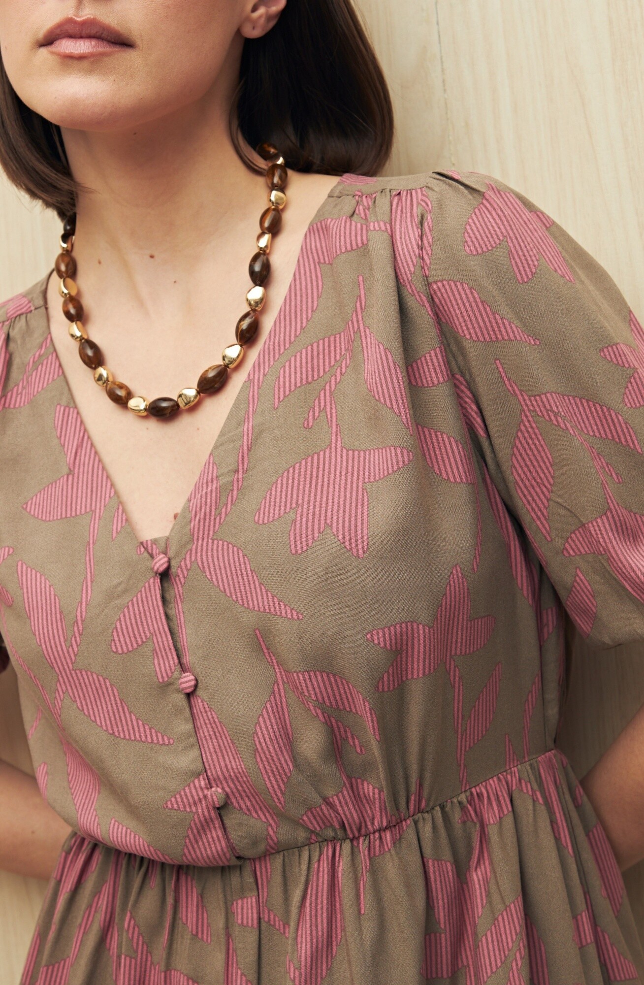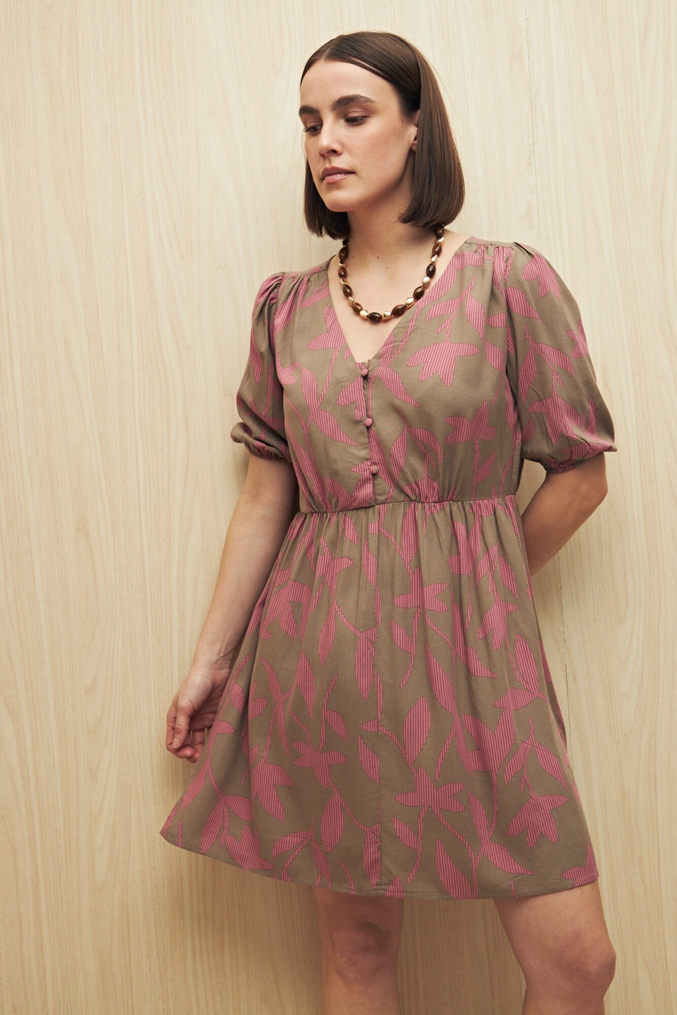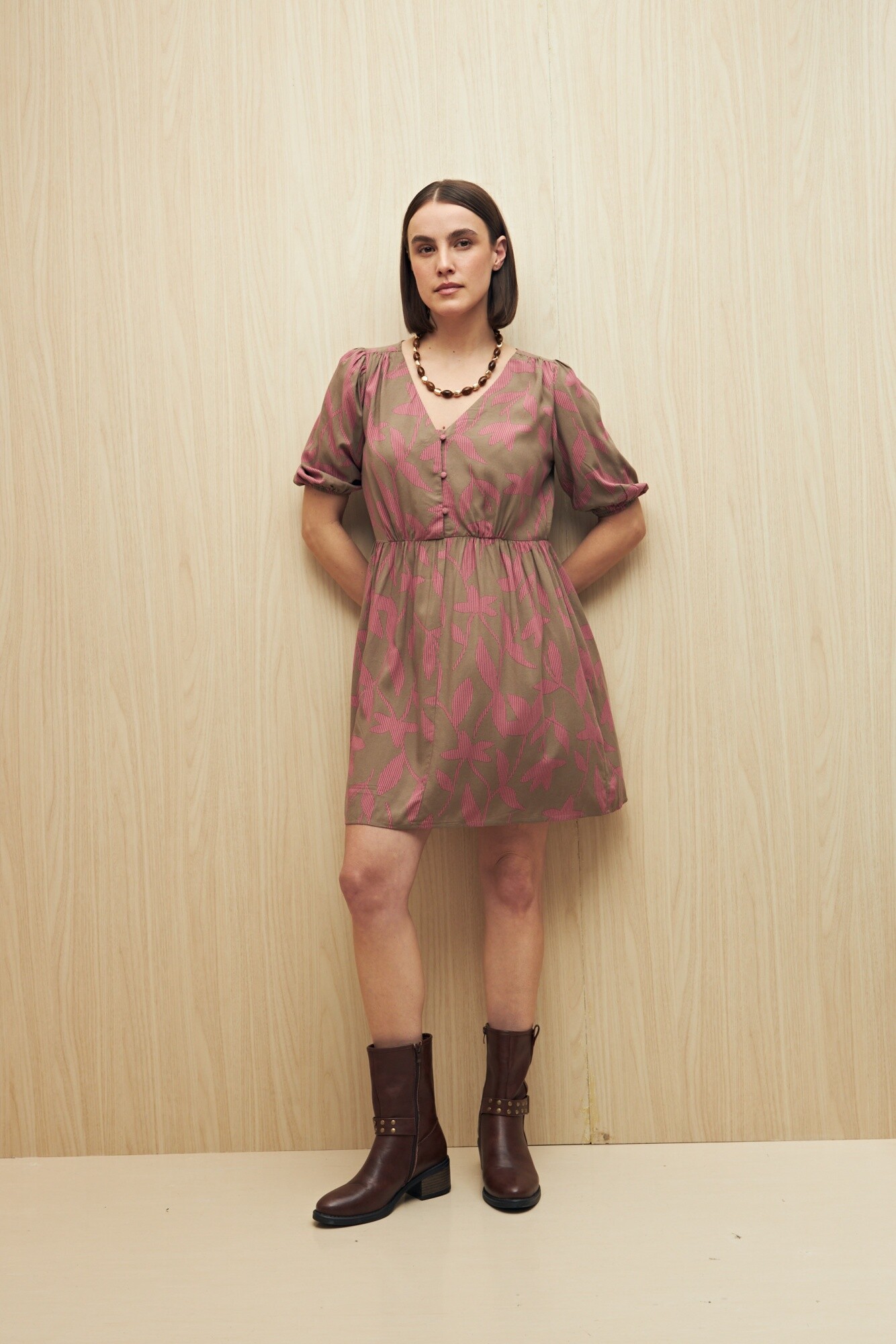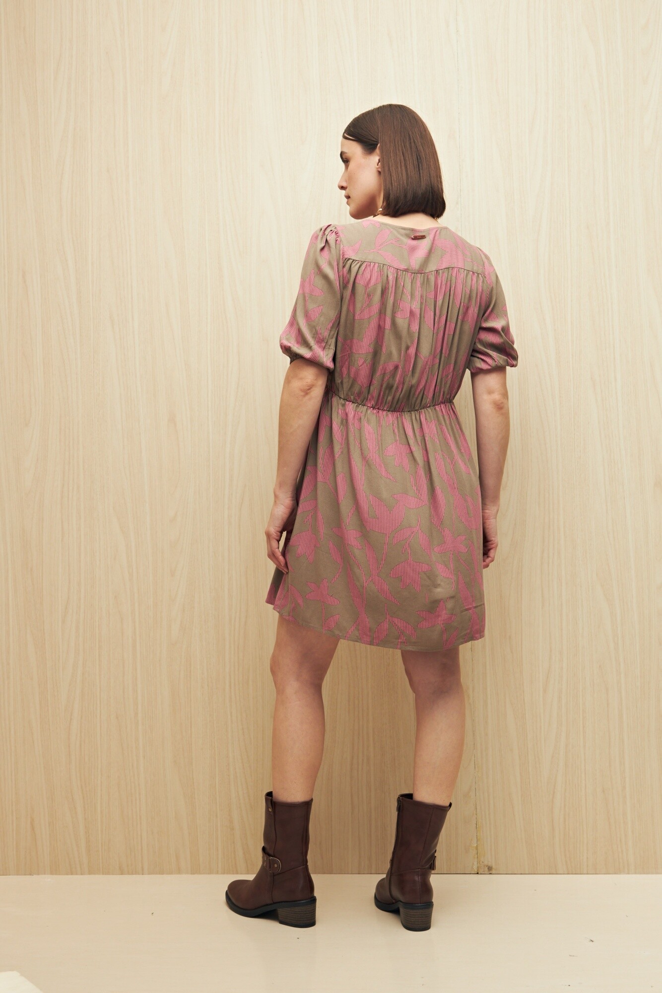 Vestido corto con escote en V y manga abullonada con puño elastizado. El corte en la cintura realza la silueta y da paso a una falda con vuelo suave, logrando una prenda femenina y cómoda. Su tejido liviano de viscosa aporta movimiento y frescura, ideal para el día o la tarde.